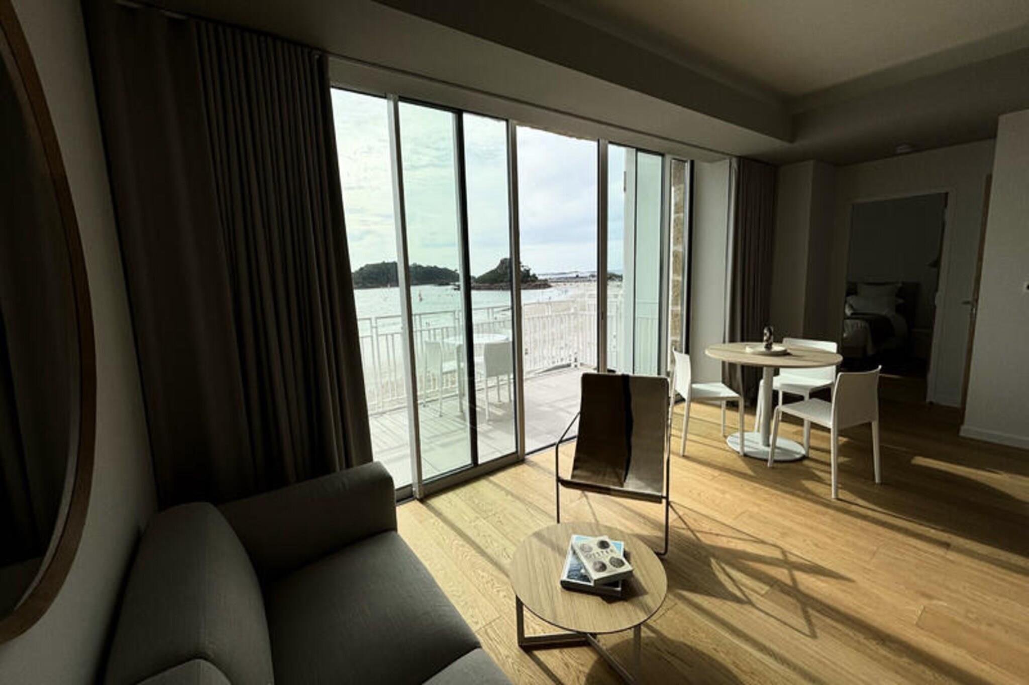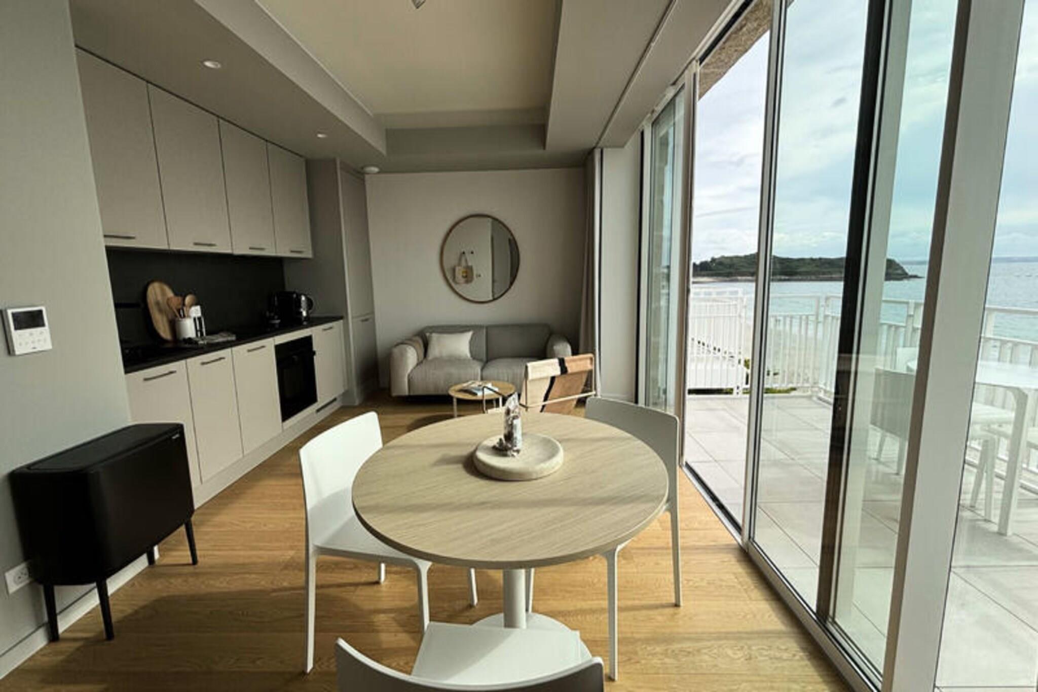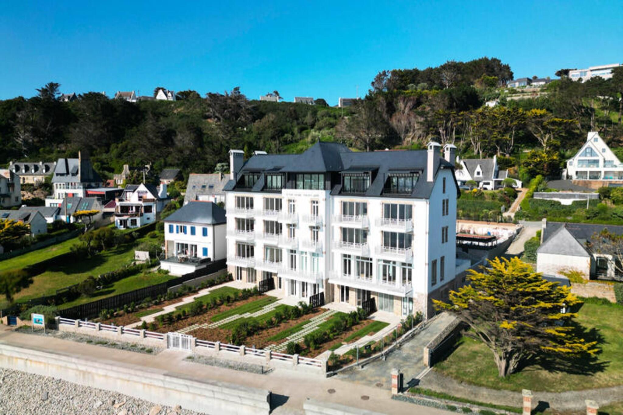 Velkommen til "Beg Leguer", vores storslåede 2-værelses lejlighed beliggende i Centre Philippe-Joppé, designet af det berømte arkitektfirma Wilmotte & Associés. Med direkte adgang til Tresmeur-stranden og en betagende havudsigt er vores bolig det ideelle sted for en uforglemmelig badeferie. Vores rummelige 40 m² lejlighed, ideelt beliggende overfor Tresmeur strand, tilbyder dig en betagende udsigt over havet med sin balkon med direkte udsigt over havet, du kan nyde betagende panoramaer på ethvert tidspunkt af dagen. "Beg Leguer" inkluderer et komfortabelt soveværelse, perfekt til op til 2 personer. Efter en dag med at udforske områdets naturlige skønheder eller slappe af på stranden, kan du slappe af i vores lyse lounge, udstyret med alle de nødvendige bekvemmeligheder. Et fuldt udstyret køkken giver dig mulighed for at tilberede lækre måltider med lokale produkter, som du kan nyde, mens du beundrer solnedgangen fra en af ??vores balkoner. Du vil også have adgang til en indendørs swimmingpool, der er opvarmet hele året rundt (15m x 4m), så du kan slappe af uanset vejret. En parkeringsplads er tilgængelig for dig, med en elbilterminal til rådighed. Boligen er sikker med tilstedeværelsen af ??en vagt på stedet, hvilket sikrer din ro i sindet. Derudover er en elevator tilgængelig for at gøre din rejse lettere. Vi glæder os til at byde dig velkommen til en uforglemmelig ferie ved havet i Bretagne. Book nu for at få en unik oplevelse i vores lille hjørne af paradis.
