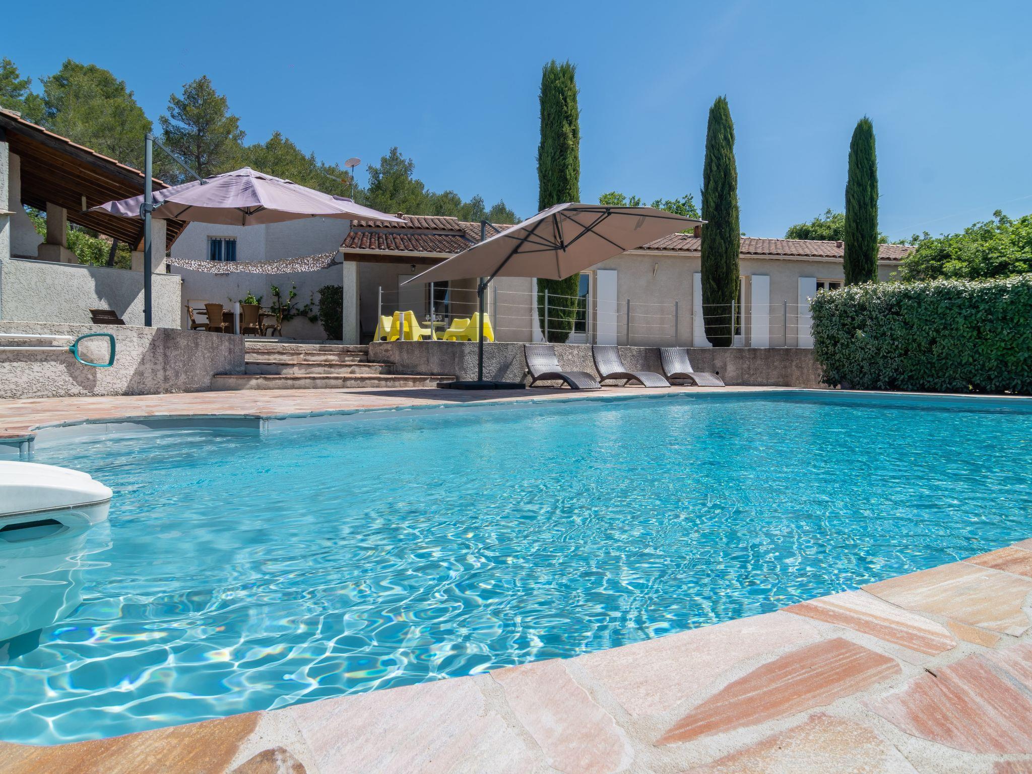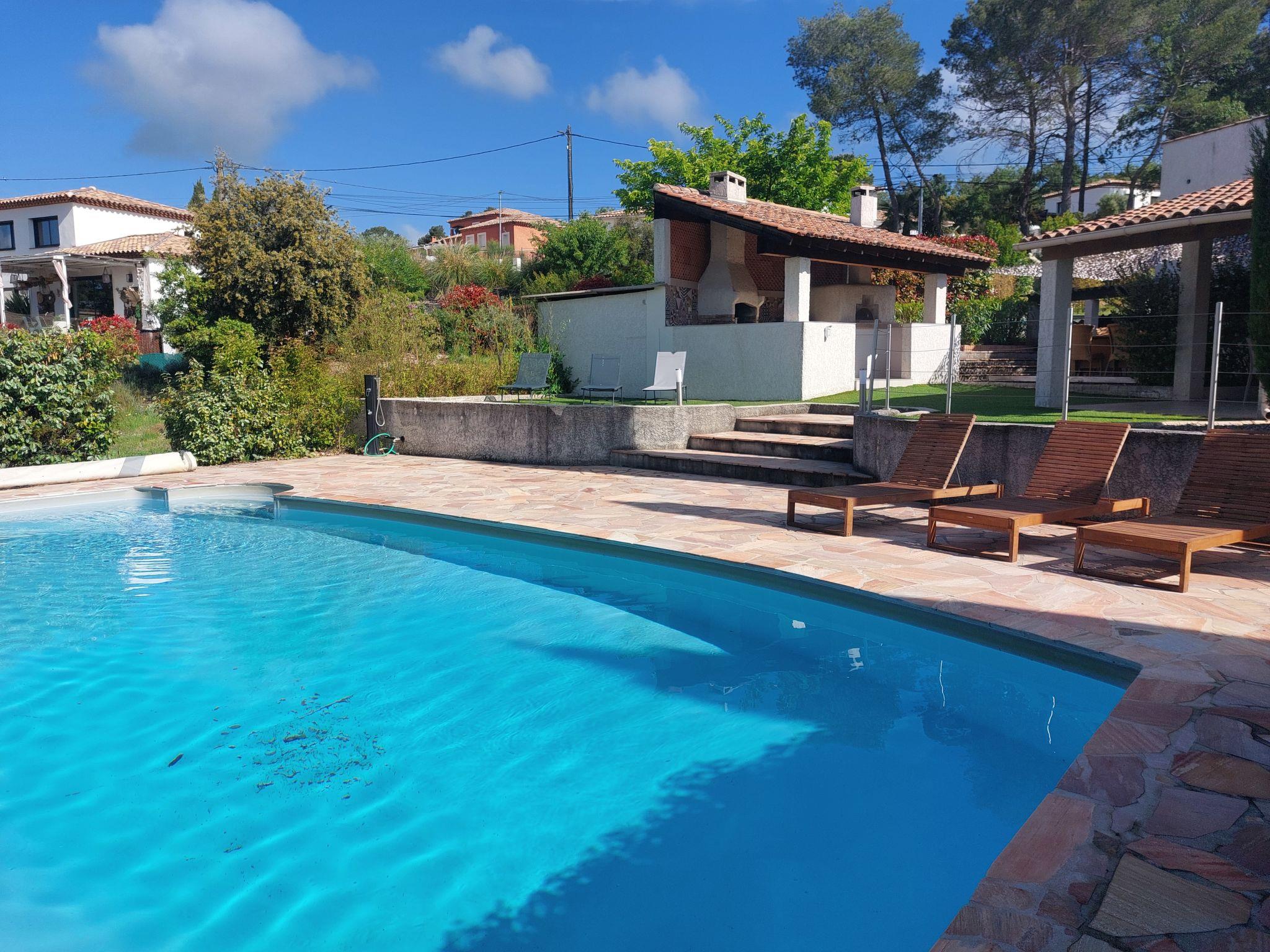 Single-family house "Bois d'Astros", detached. 1.5 km from the centre of Rocbaron, 38 km from the sea. Private: natural state property 5'000 m2 (fenced), swimming pool (10 x 5 m, depth 120 - 200 cm, seasonal availability: 01.May. - 31.Oct.). Pool house with fridge, fireplace, parking (for 3 cars) on the premises. Grocery 1.4 km, supermarket 1.4 km, restaurant 3 km, bus stop 1 km, railway station "Puget Ville" 10 km, sandy beach 38 km, lake Lac de Carrés 31 km. Golf course (18 hole) 20 km. Nearby attractions: Brignoles 15 km, Forcalquieret 5 km, Gareoult 4 km, Circuit Paul Ricard. Please note: car recommended. The owner does not accept any youth groups.
