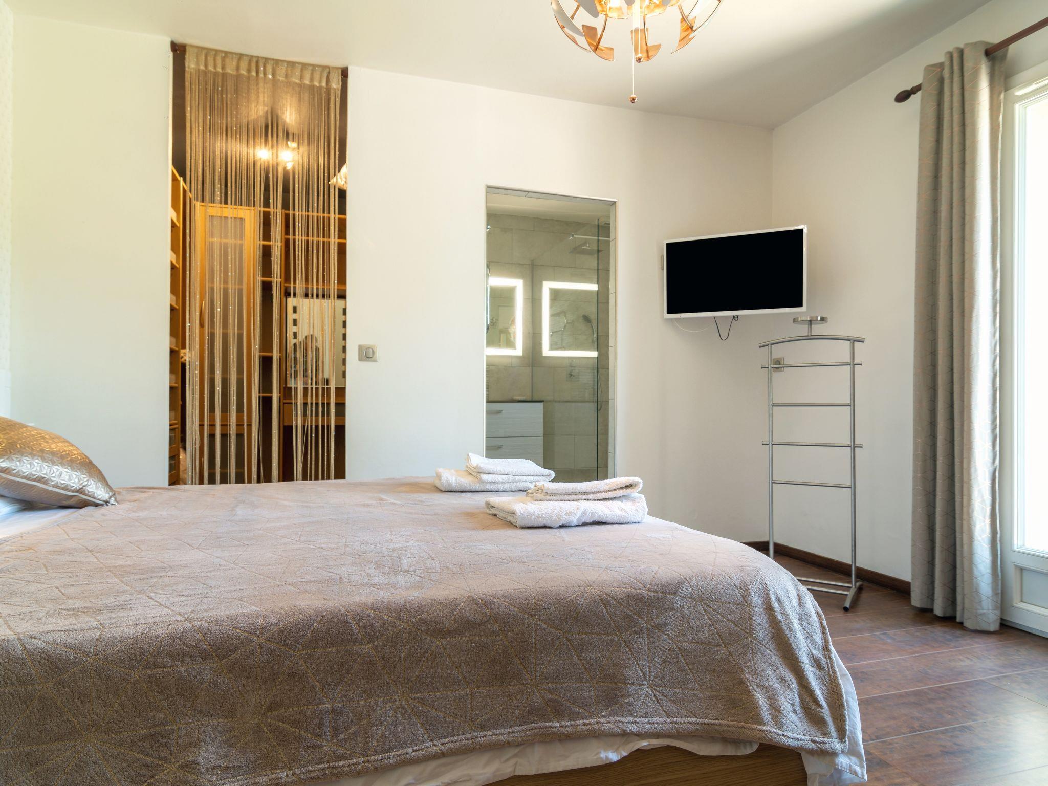 6-room house 160 m2. Comfortable and modern furnishings: living/dining room with Scandinavian wood stove (only for decoration), dining table, TV, CD-player and DVD. Exit to the terrace, to the swimming pool. 1 room with 1 french bed (160 cm). 2 rooms, each room with 1 french bed (140 cm). 1 room with 2 beds (90 cm). Open kitchen (oven, dishwasher, 3 induction hot plates, microwave, freezer, electric coffee machine, Capsules for coffee machine (Nespresso) extra, cooking island). Bathroom, shower, 2 sep. WC's, double hand-basin. Air-conditioning. Terrace 70 m2. Terrace furniture, barbecue. Facilities: washing machine, dryer, iron. Internet (WiFi, free). Please note: non-smoking house. When there are less than the maximum number of guests staying at the property, not all of the bedrooms will be available for use. 831060000062I
