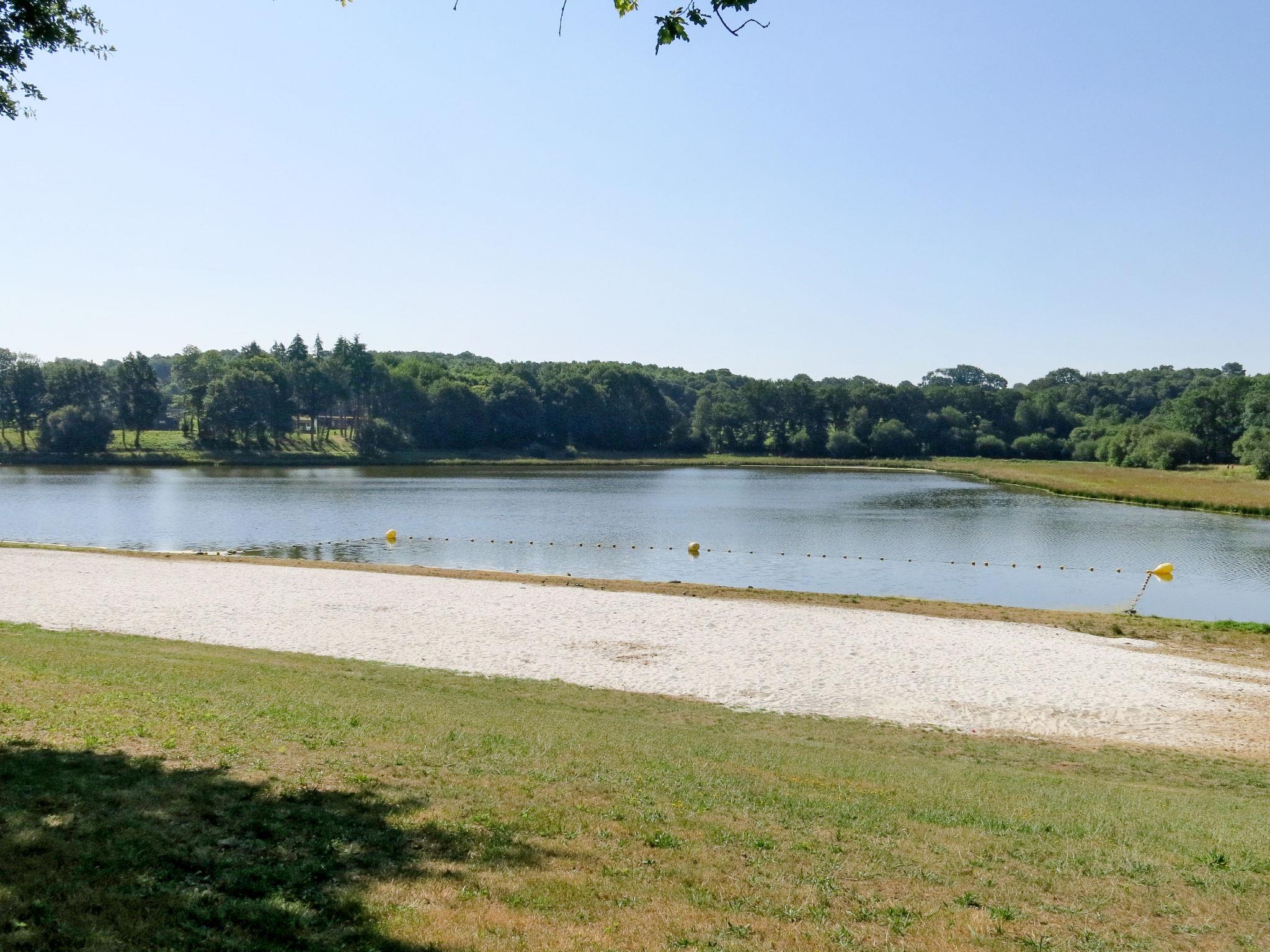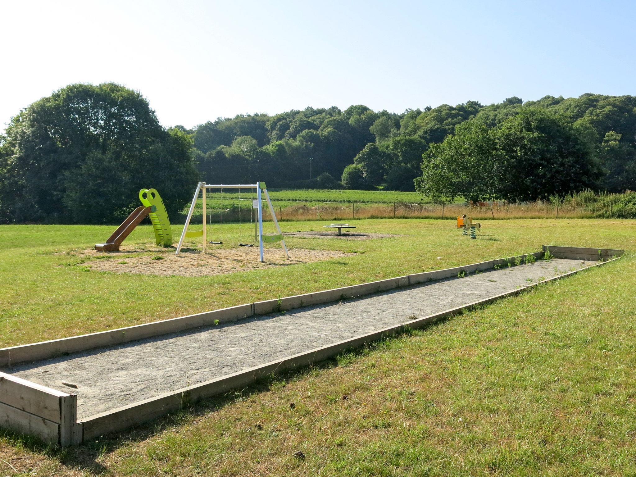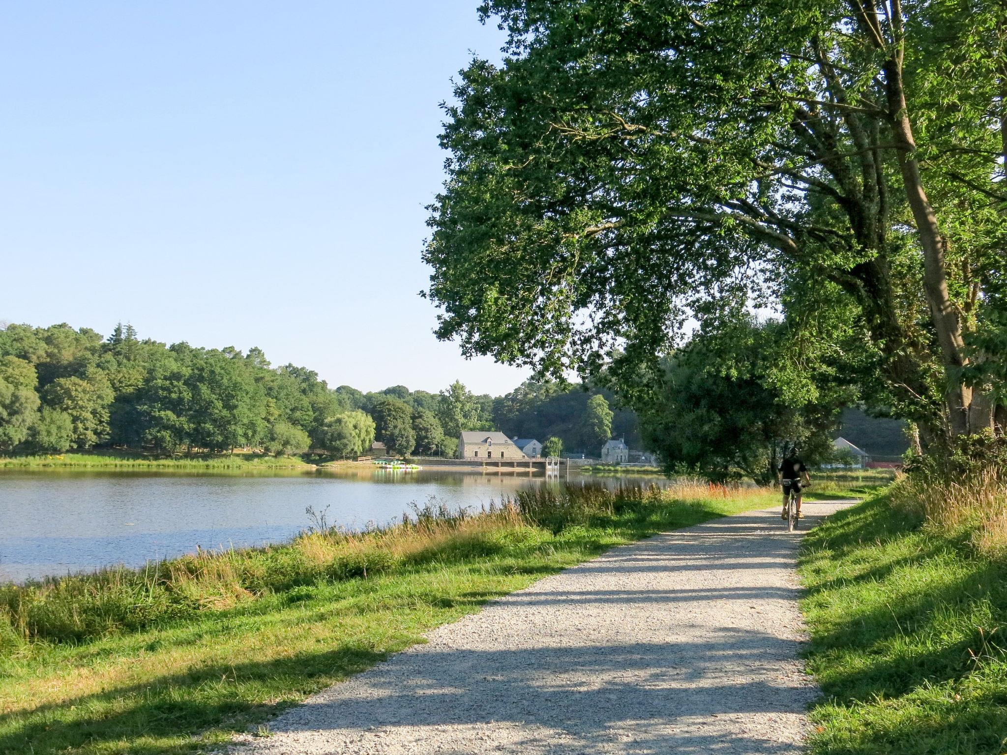 Child friendly resort "Le Moulin Neuf", built in 2017. 50 houses in the resort. 1.5 km from the centre of Rochefort-en-Terre, on the outskirts, 10 m from the lake. For shared use: property, park with lawn and trees, swimming pool heated, fenced (15 x 8 m, seasonal availability: 15.May. - 15.Sep.). Children's pool, tennis (extra), boccia, barbecue house, children's playground. In the complex: reception, washing machine, tumble dryer (for shared use, extra), bicycle rental. Parking. E-charging station. Supermarket 2 km, bus stop 1.5 km, sandy beach "Plage de l'Étang du Moulin Neuf" 500 m, park "de loisirs du Moulin neuf" 500 m. Sports centre 500 m. Nearby attractions: Tyrolienne, mur d’escalade. 500 m, Activités nautiques (paddle, canoé.) 500 m, Malansac (Parc de la Préhistoire) 5 km, La Gacilly 21 km, Damgan (plage Océan) 32 km, Vannes et Golfe du Morbihan 35 km. Hiking paths: GR34. Please note: car-free holiday complex. The photograph shows a typical example.