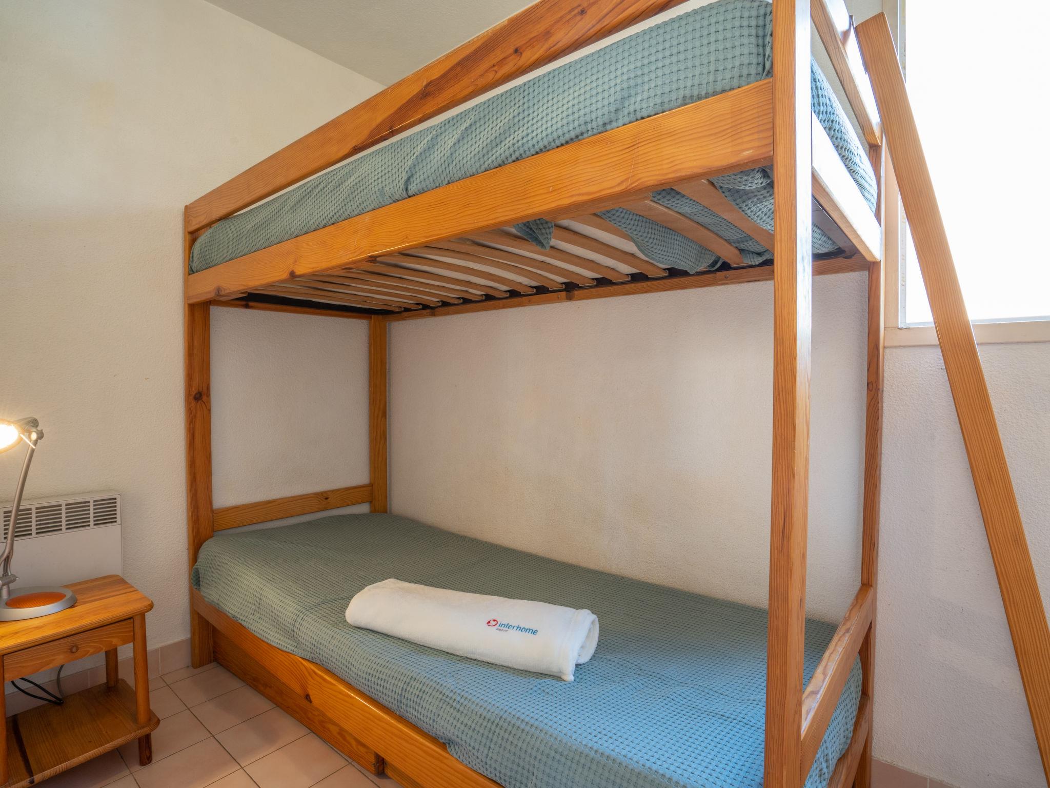 1-room apartment 27 m2 on 1st floor, south-east facing position. Simple furnishings: living/dining room with 1 double sofabed (1 x 140 cm, length 190 cm), TV (flat screen), fan. Exit to the terrace. Sleeping alcove with 1 x 2 bunk beds (80 cm), fan. Kitchenette (4 hot plates, oven, toaster, kettle, microwave, freezer, electric coffee machine). Bath/WC. Electric heating. Terrace 6 m2 partly roofed, south-east facing position. Terrace furniture, deck chairs (1). Facilities: hair dryer. Internet (WiFi, extra). Parking space n 4. Please note: not suitable for children under 6 years apartment street side. Non-smokers only. TV only FR. Smoke alarm. Instead of an enclosed bedroom, some sleeping areas are located in an open-plan area (gallery, alcove, etc.). OSLQAS