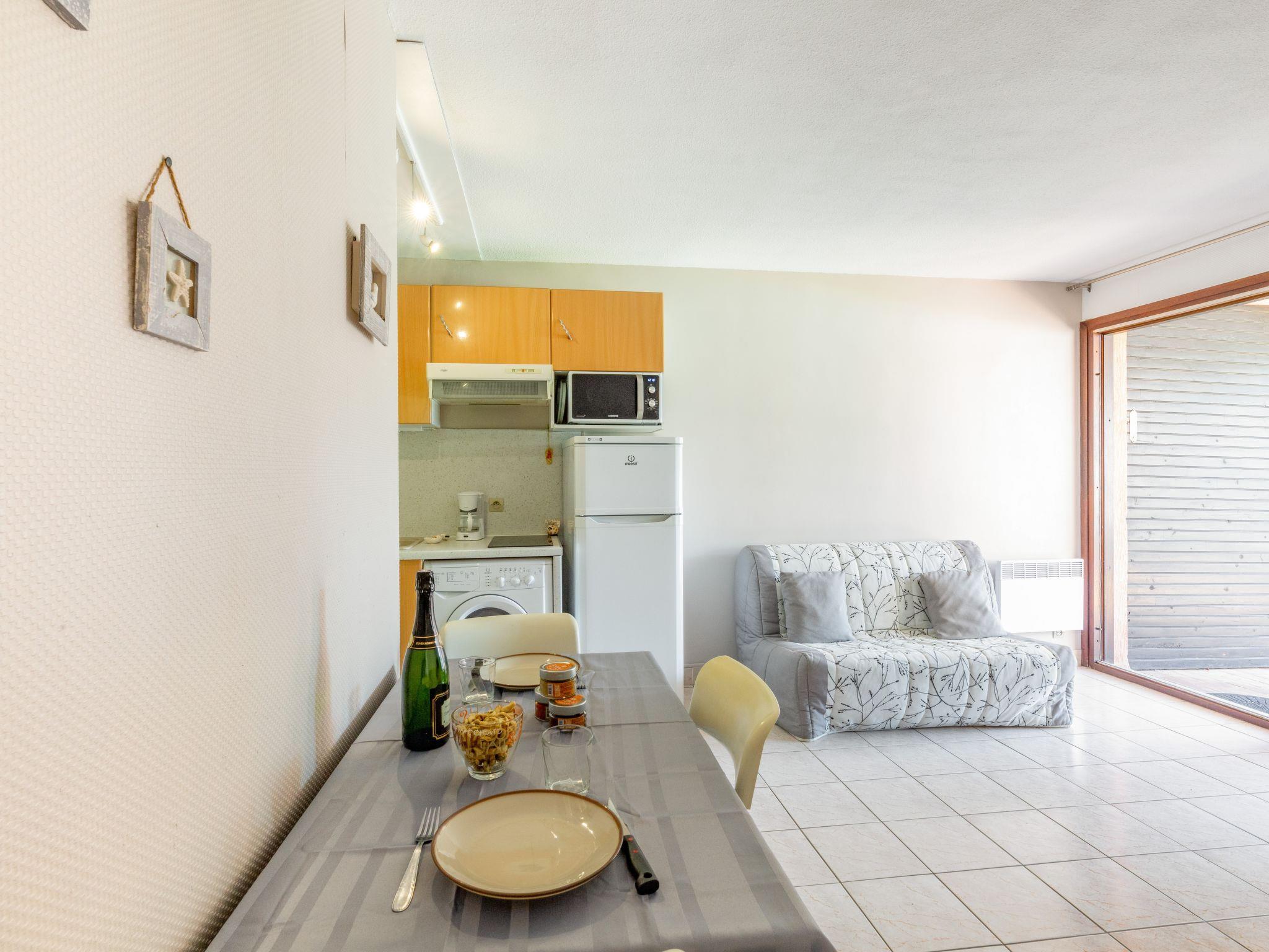 1-room apartment 22 m2, on the upper ground floor, south facing position. Simple furnishings: living/sleeping room with panoramic window with 1 sofabed (140 cm, length 190 cm), dining table and TV (flat screen), air conditioning. Exit to the terrace. Kitchenette (2 induction hot plates, toaster, microwave, freezer, electric coffee machine). Shower/WC. Electric heating. Large terrace 16 m2 partly. View of the swimming pool. Facilities: washing machine, hair dryer. Internet (WiFi, extra). Parking space n 27. Please note: TV only FR. Smoke alarm. 4LCXUQ