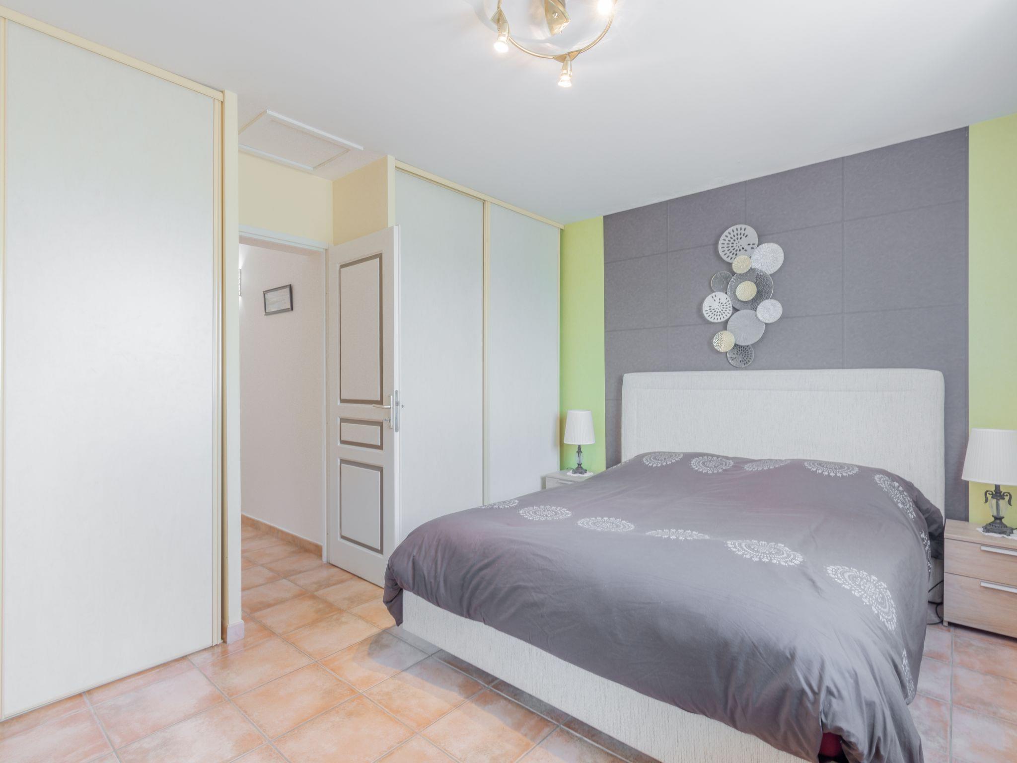 4-room villa 130 m2 on 2 levels. Spacious and bright, comfortable furnishings: living/dining room with TV (flat screen). Exit to the terrace, to the swimming pool. 1 room with 1 french bed (1 x 160 cm, length 200 cm), bathroom and TV (flat screen). Open kitchen (oven, dishwasher, 4 ceramic glass hob hotplates, toaster, kettle, microwave, freezer, electric coffee machine, Capsules for coffee machine (Nespresso L'OR) extra). Sep. WC. Heating, air-conditioning. Upper floor: 1 room with 1 french bed (1 x 160 cm, length 200 cm), TV (flat screen). 1 room with 2 beds (80 cm, length 190 cm), TV (flat screen). Bathroom, sep. WC, double hand-basin. Air-conditioning. Terrace 15 m2, roofed, south facing position. Terrace furniture, barbecue, deck chairs (2). View of the swimming pool. Facilities: washing machine, iron, hair dryer. Internet (WiFi, free). Parking (fenced 2 cars). Please note: non-smoking house. Smoke alarm. 6TH53E