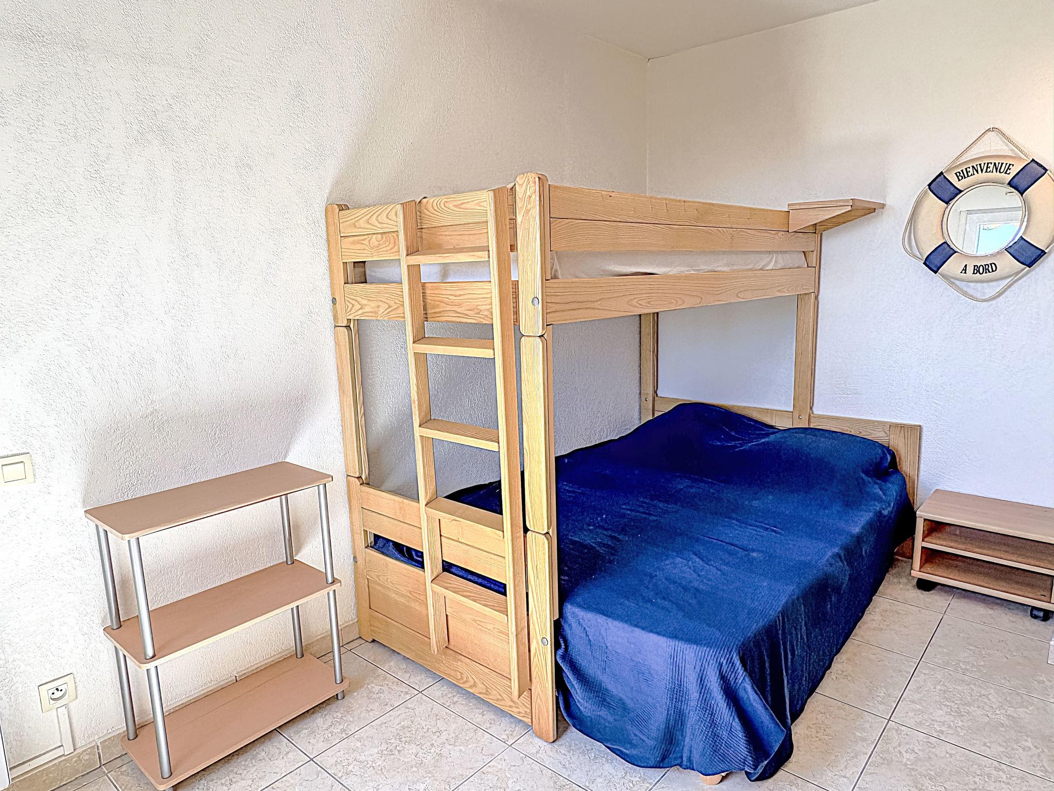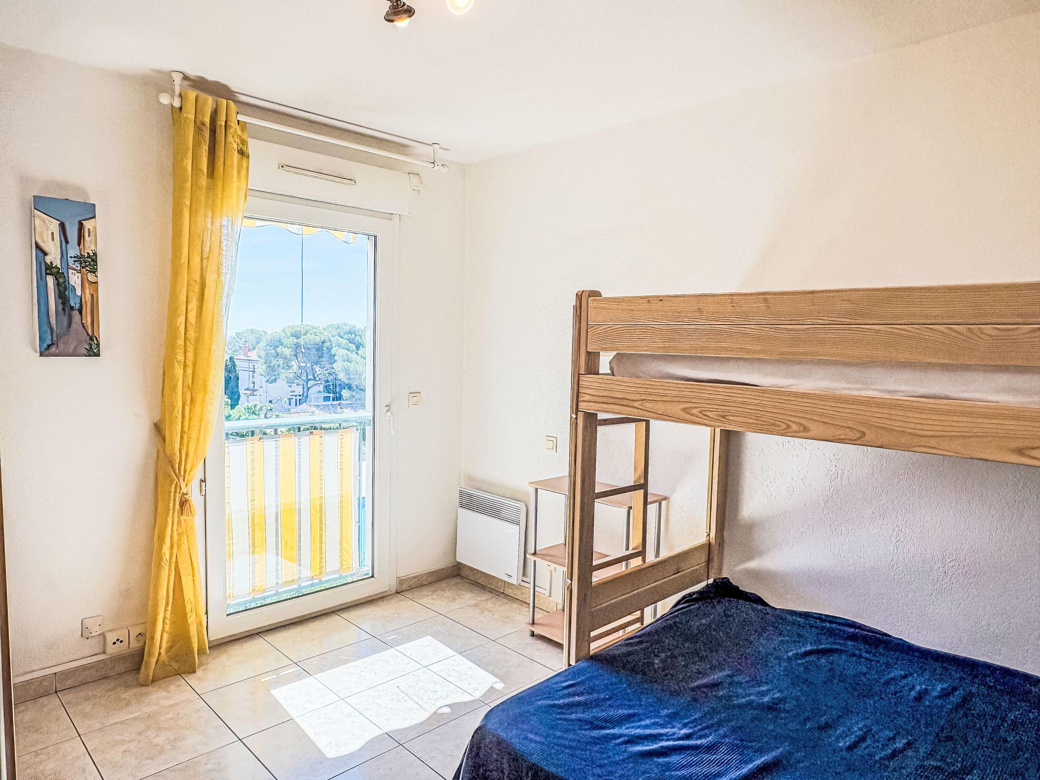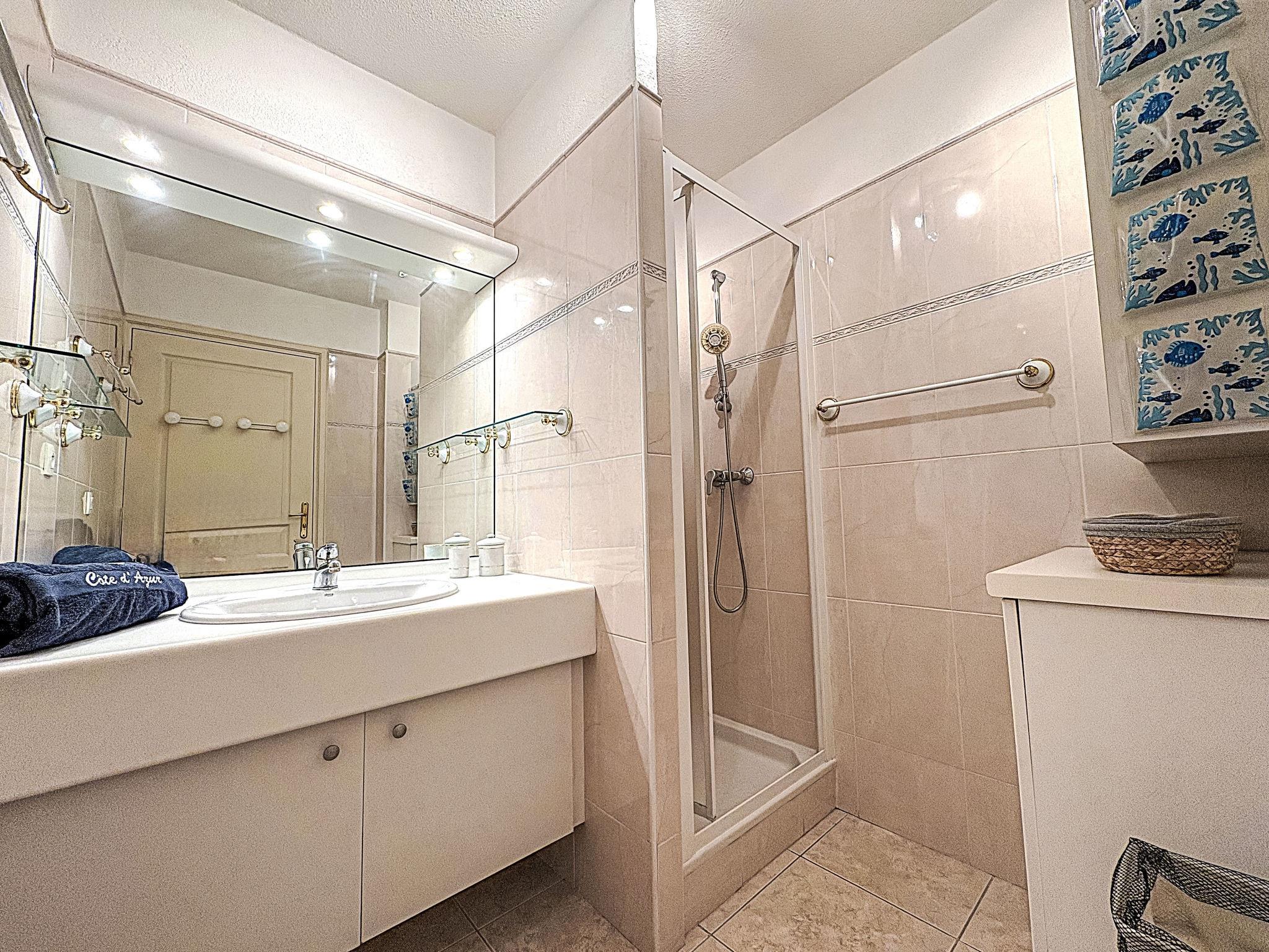 2-room apartment 53 m2 on 3rd floor, east facing position. Spacious, comfortable furnishings: living/dining room with 1 double sofabed (1 x 140 cm, length 200 cm), TV (flat screen), air conditioning and electric shutters. Exit to the terrace. 1 room with Dressing room with 1 bed (140 cm, length 200 cm), 1 x 1 bunk beds (90 cm, length 200 cm), air conditioning. Kitchen (mini-oven, 4 ceramic glass hob hotplates, toaster, kettle, microwave, freezer, electric coffee machine) with bar. Bathroom, sep. WC. Heating. Balcony 15 m2, south facing position and, east facing position. Balcony furniture. View of the sea and the swimming pool. Facilities: washing machine, iron, baby cot for up to 2 year olds, hair dryer. Internet (WiFi, free). Garage space n 70 (1 car), height 190 cm, width 240 cm. Please note: TV only FR. Smoke alarm. Offer by a private individual according to Art. 155, IV of CGI. LEBT0B7W