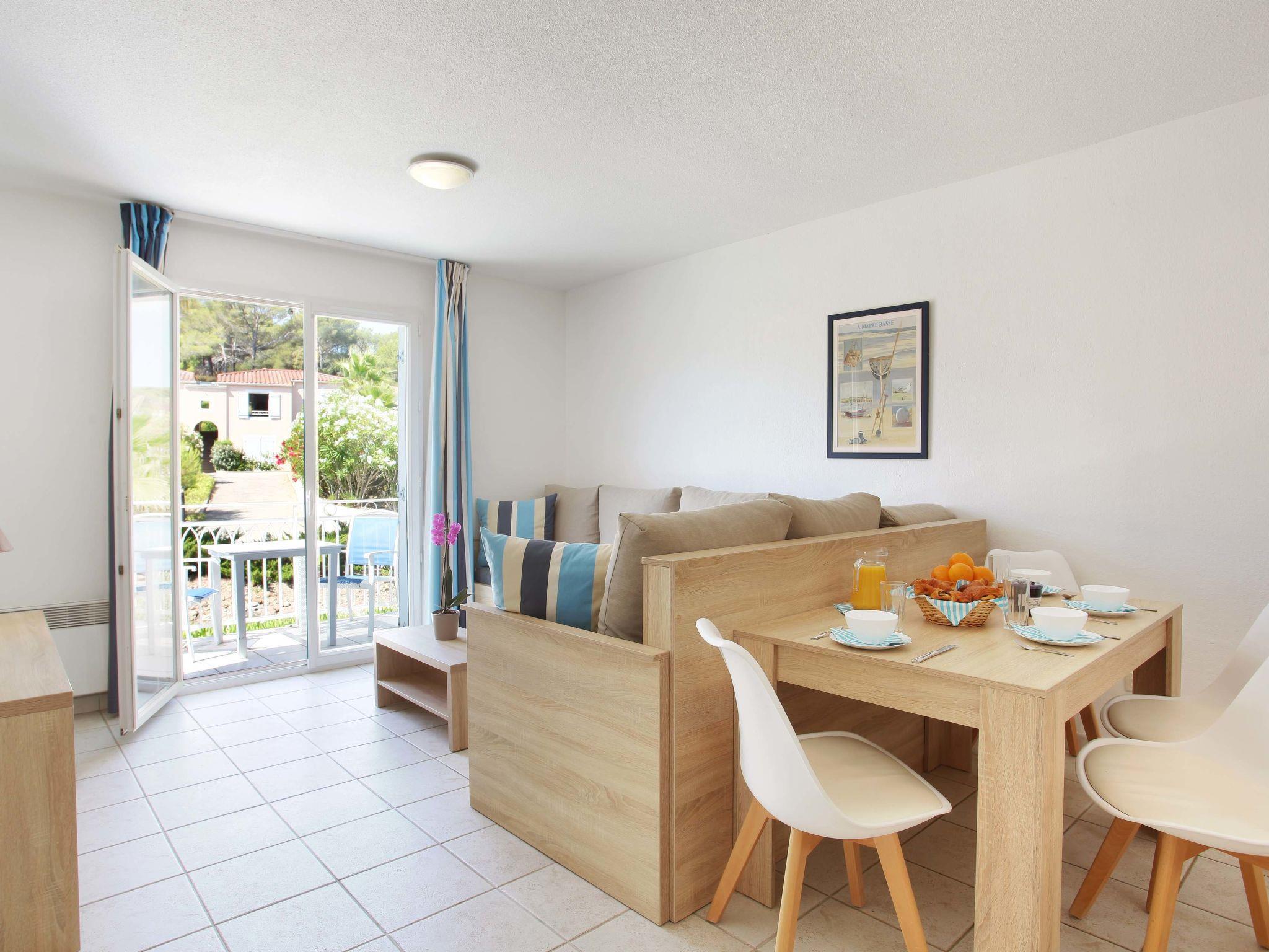 "Odalys Référence Domaine des Eucalyptus", 2-room apartment 32 m2. Bright, comfortable furnishings: living/sleeping room with 2 sofabeds, 1 pull-out bed, dining table and TV. 1 room with 2 sleeping facilities. Open kitchen (4 hot plates, dishwasher, microwave). Bath/WC. Electric heating, air-conditioning. Balcony or terrace. Balcony furniture. Facilities: children's high chair, baby cot. Internet (WiFi, extra). Please note: non-smokers only. Maximum 2 pets/ dogs allowed. Smoke alarm, fire extinguisher.