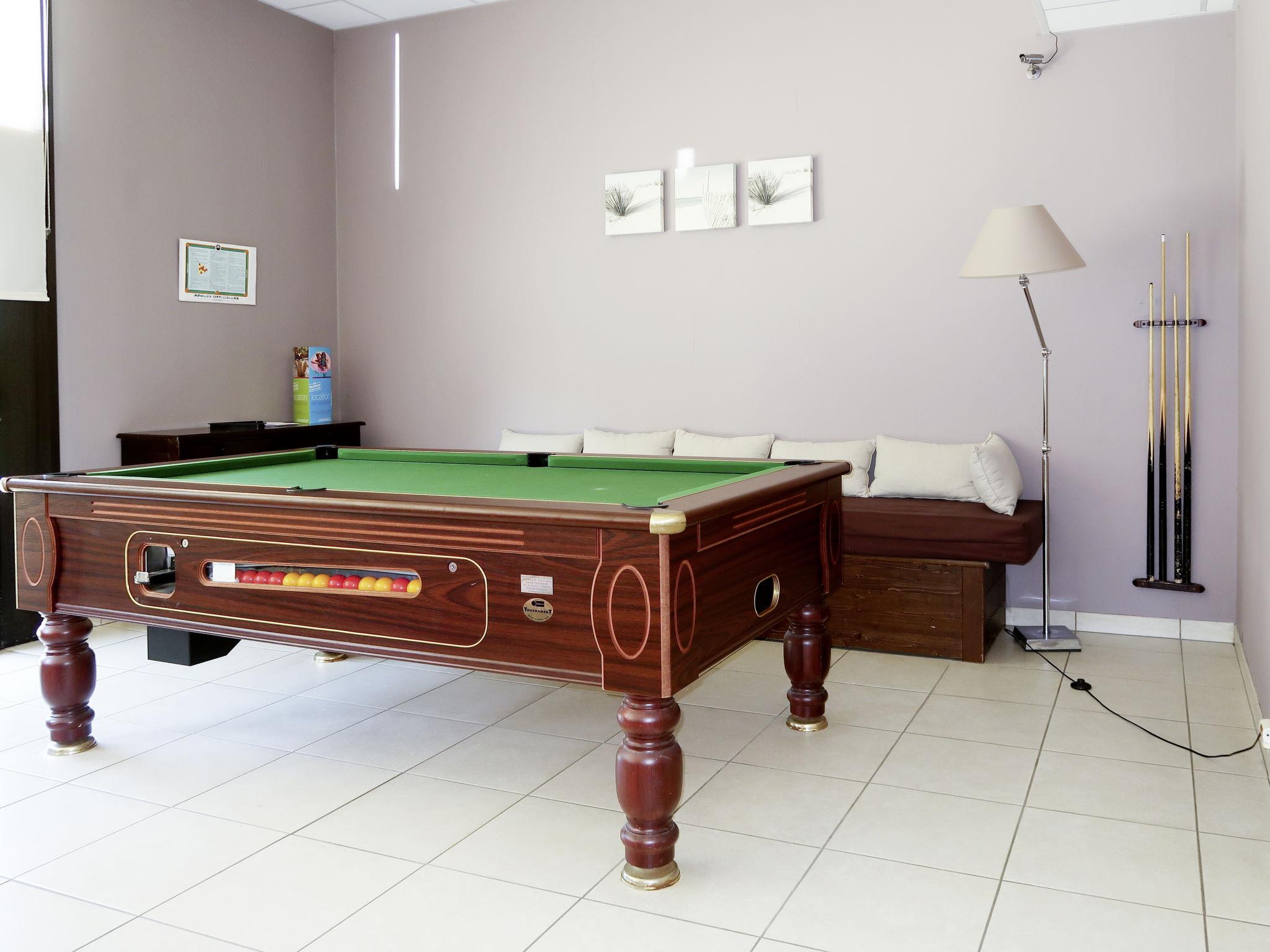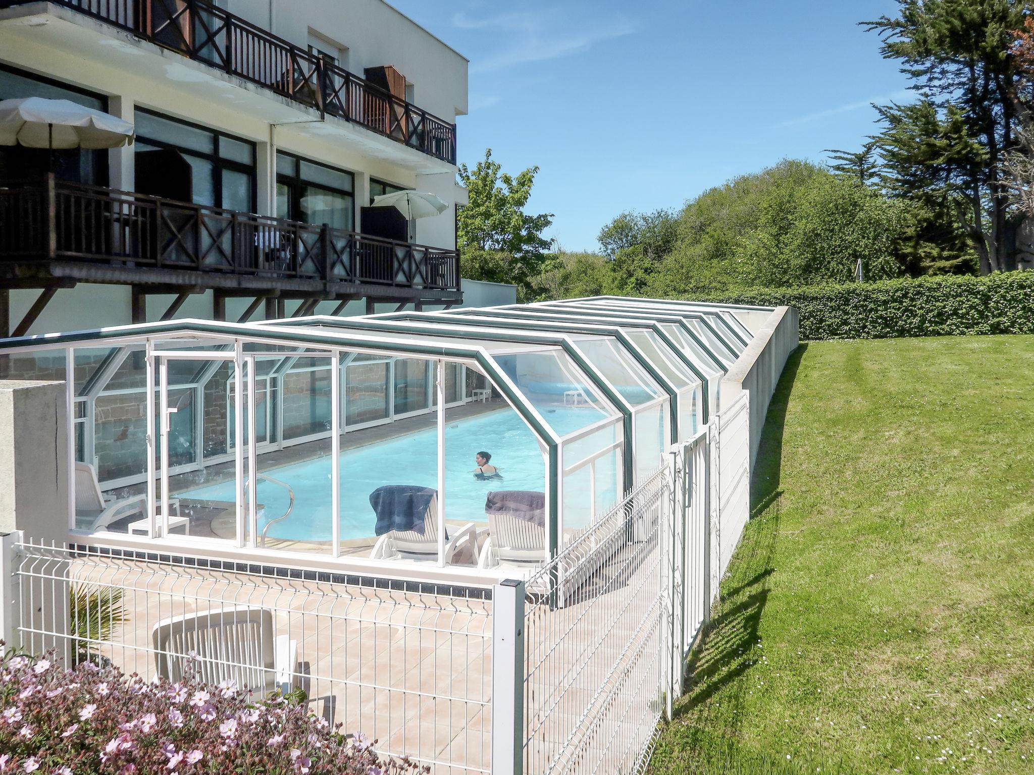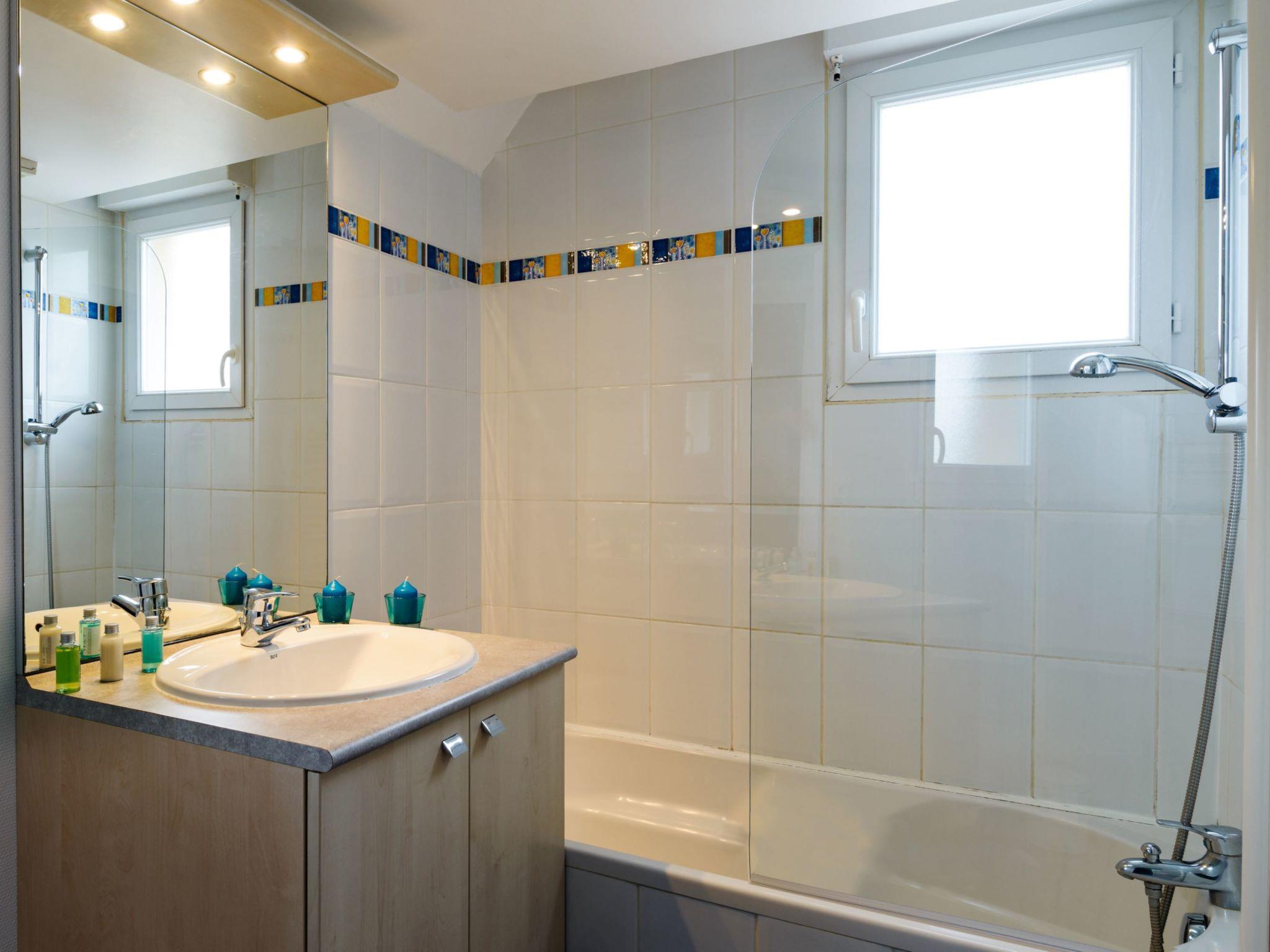 Resort "Les Roches Douvres". 4 houses in the residence. 81 apartments in the residence. 1.5 km from the centre of Saint Briac-sur-Mer, on the outskirts, 7 km from the centre of Dinard, 300 m from the sea. For shared use: property with plants, meadow, swimming pool heated, secured (13 x 6 m, depth 150 cm, seasonal availability: 01.Jan. - 31.Dec.). In the complex: reception, lounge, sauna (extra). Billiard table, lift, storage room for bicycles, washing machine (for shared use, extra), bicycle rental. Bread roll service. Parking. Shop 1.5 km, restaurant 1.5 km, bus stop "Le Golf" 600 m, sandy beach 300 m. Golf course (18 hole) 450 m. Please note: the photograph shows a typical example. The holiday properties may differ in living space, floorplan, equipment and furnishing.