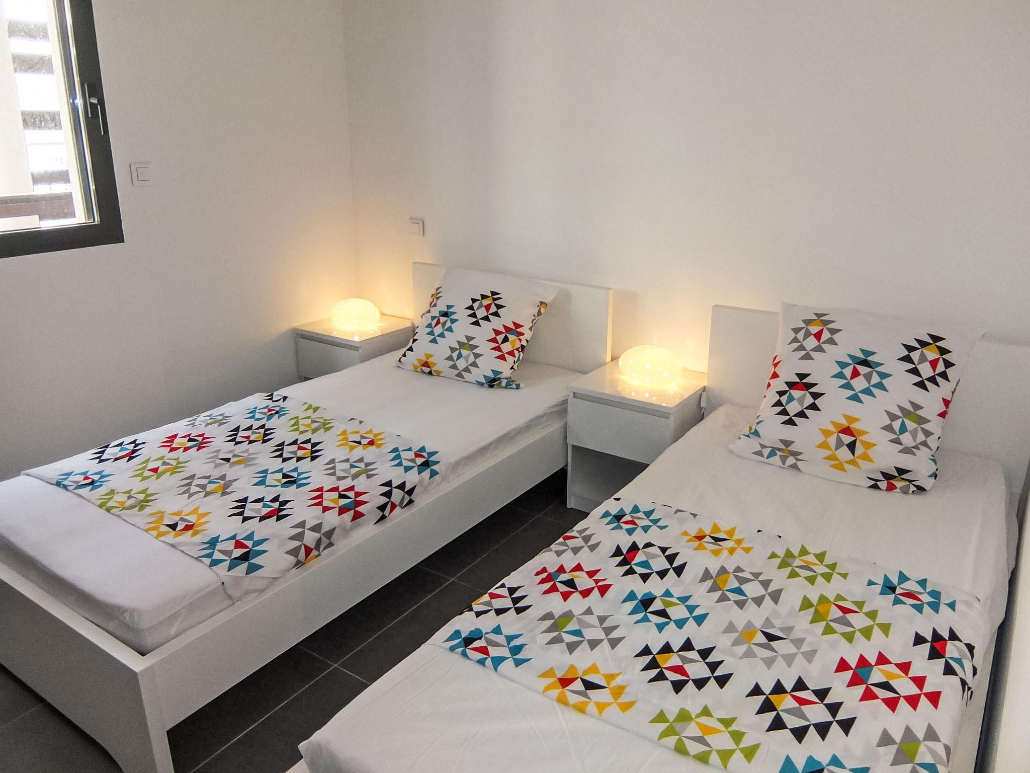 3-room apartment 66 m2 on 1st floor. Beautiful furnishings: living/dining room with 1 double sofabed (1 x 140 cm, length 200 cm), TV (flat screen). Exit to the terrace. 1 room with 2 beds (90 cm, length 190 cm). 1 room with 1 french bed (1 x 160 cm, length 200 cm). Exit to the terrace. Open kitchen (oven, dishwasher, 4 ceramic glass hob hotplates, microwave, electric coffee machine). Bathroom, sep. WC. Air-conditioning. Terrace 20 m2, roofed. View of golf course. Facilities: washing machine. Internet (WiFi, free). Parking. Please note: non-smoking house. Smoke alarm.