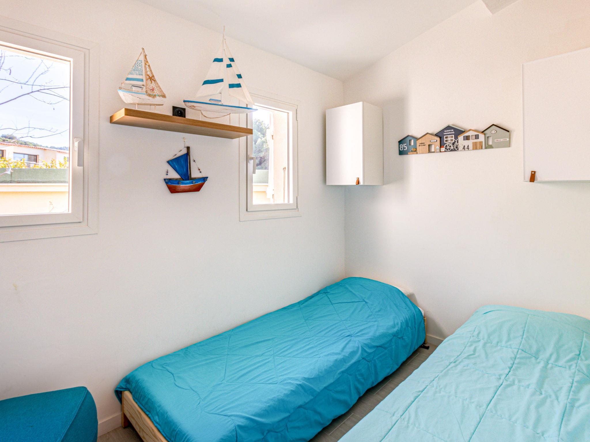 3-room terraced house 50 m2 on 2 levels. Bright, fully renovated in 2020, comfortable and beautiful furnishings: upper floor: 1 room with 1 french bed (1 x 160 cm, length 200 cm), air conditioning. Shower, sep. WC. 2nd upper floor: living/dining room with TV and air conditioning. Exit to the terrace. 1 small room with 1 pull-out bed (2 x 80 cm, length 190 cm), air conditioning. Open kitchen (oven, dishwasher, 2 induction hot plates, toaster, kettle, microwave, freezer, electric coffee machine, Capsules for coffee machine (Nespresso) extra). Forced-air heating. Terrace 5 m2. Terrace furniture. Very beautiful view of the sea and the port. Facilities: washing machine. Internet (WiFi, free). Garage, height 270 cm, width 350 cm. Please note: TV only FR. Smoke alarm. access to the house is through the garage on the ground floor. 83112000646Z5