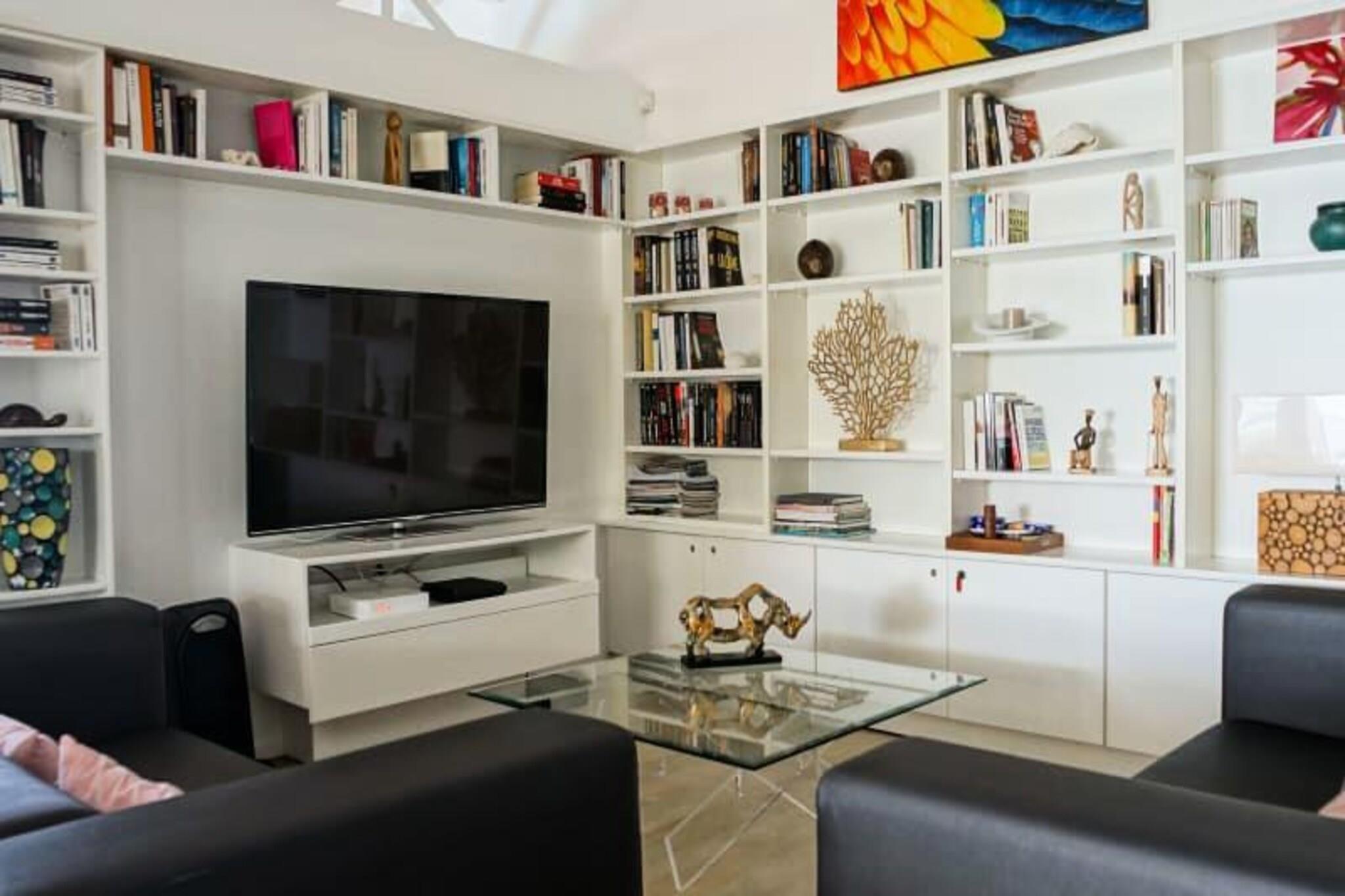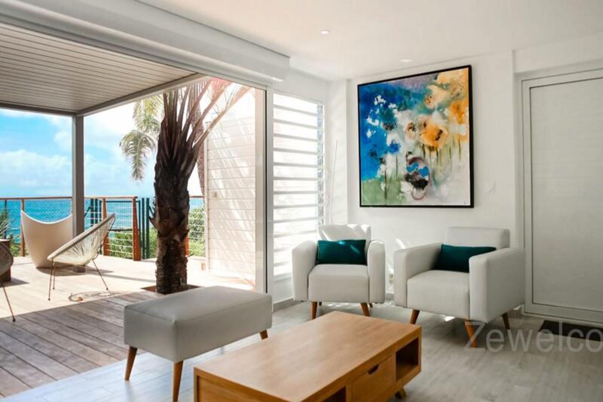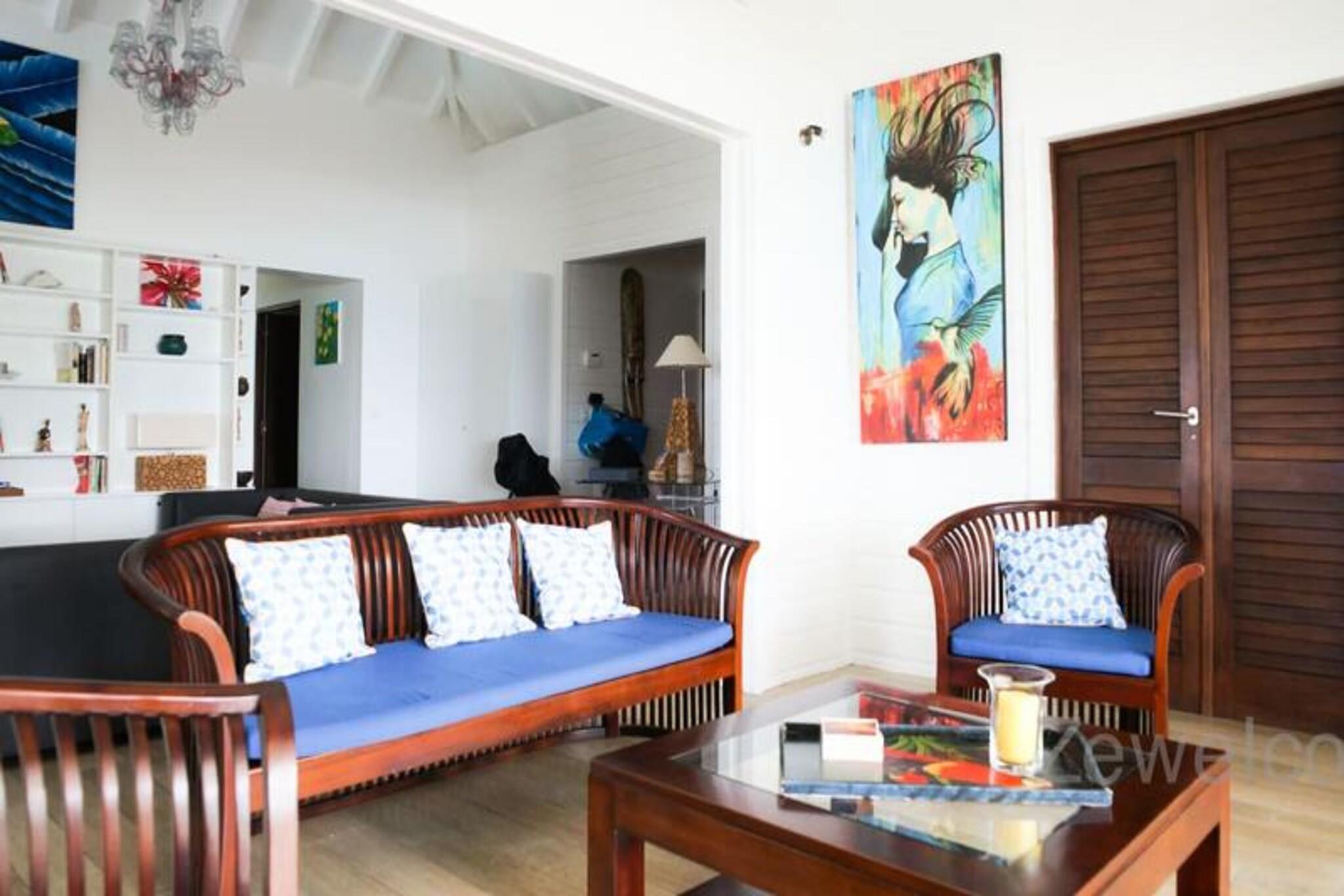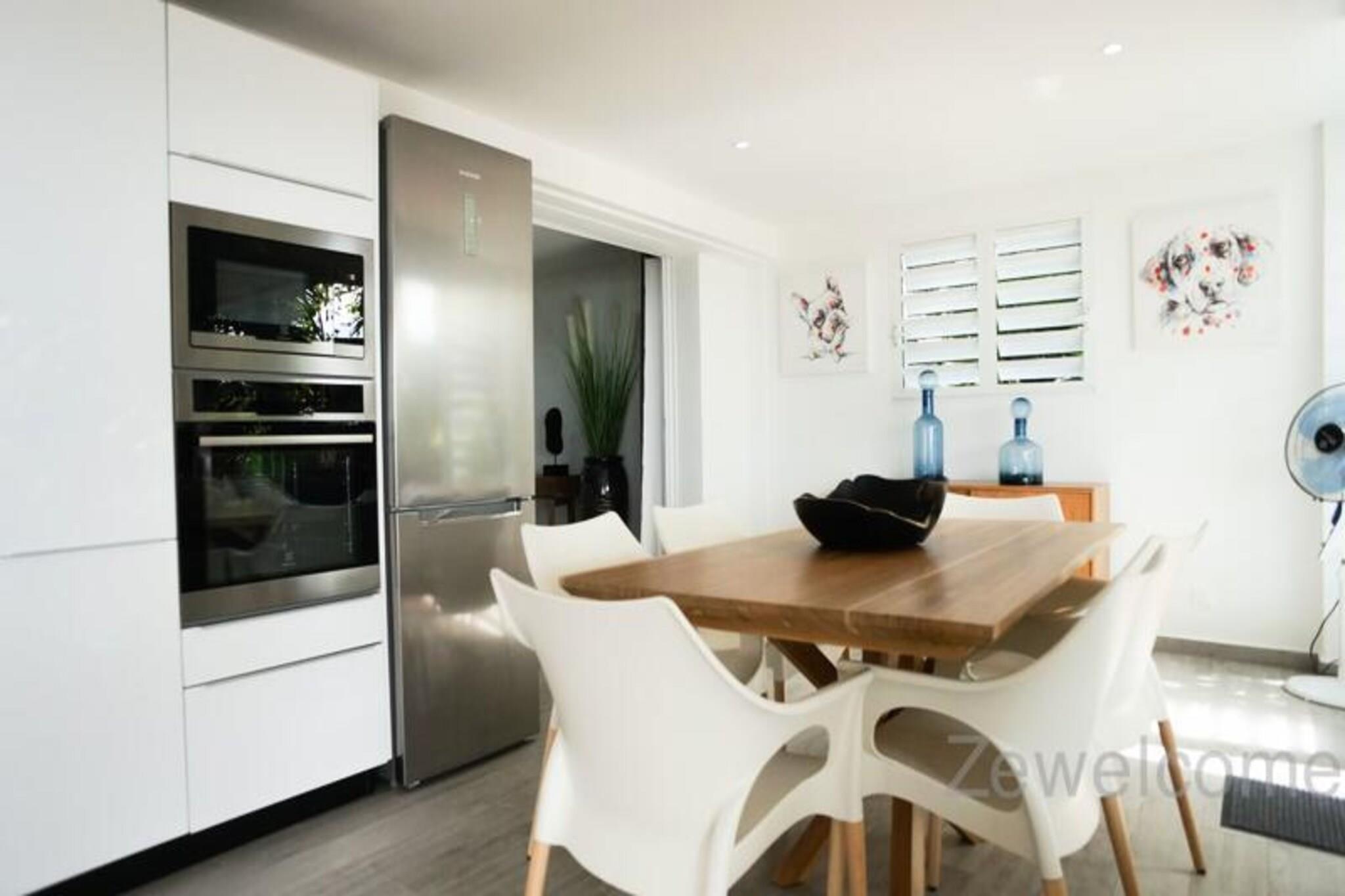 Dette charmerende feriehus tilbyder et fredeligt tilflugtssted med 6 rummelige værelser fordelt på to etager, ideelt for gæster, der søger privatliv og komfort. Villaen har aircondition, hvilket giver et behageligt ophold hele vejen igennem. Det har flere pools, herunder en 40 m² saltvands-infinity-pool og en børnevenlig pool. Hjemmet er kæledyrsvenligt, hvilket sikrer, at alle familiemedlemmer kan nyde et ophold. Yderligere faciliteter omfatter en concierge-service for at imødekomme dine behov og en førsteklasses rengøringsservice for en bekymringsfri ferie. Ejendommen ligger kun 5 minutter fra byen Saint-François, tæt på den pulserende lystbådehavn, der byder på restauranter, butikker og barer. Derudover er lokale markeder, et supermarked og et apotek let tilgængelige. Området kan også prale af nogle af Guadeloupes smukkeste strande, såsom Raisins Clairs og Bois Jolan, der ligger 10 minutter væk. For golfelskere er den internationale golfbane i nærheden, sammen med kasinoet og flyvepladsen. Villaen indeholder to køkkener, to køleskabe, to opvaskemaskiner, vaskemaskiner og tørretumblere, hvilket sikrer komfort ved længere ophold. Den rummelige opholdsstue fører til et stort dæk med betagende havudsigt. Ejendommen er også udstyret med internetadgang og kvalitetssengetøj, hvilket gør den ideel til både korte og længere ophold. Villaen er designet til afslapning og tilbyder alt hvad du behøver for en uforglemmelig oplevelse.