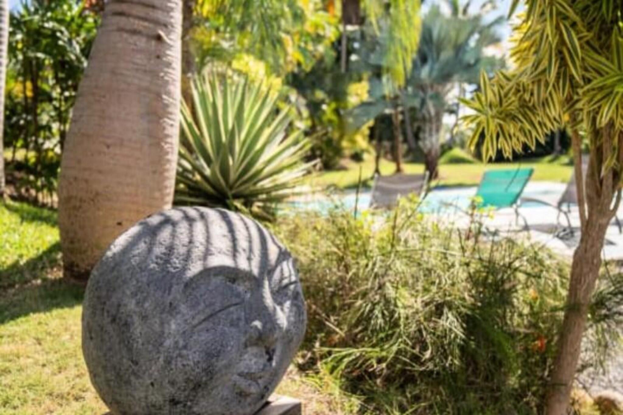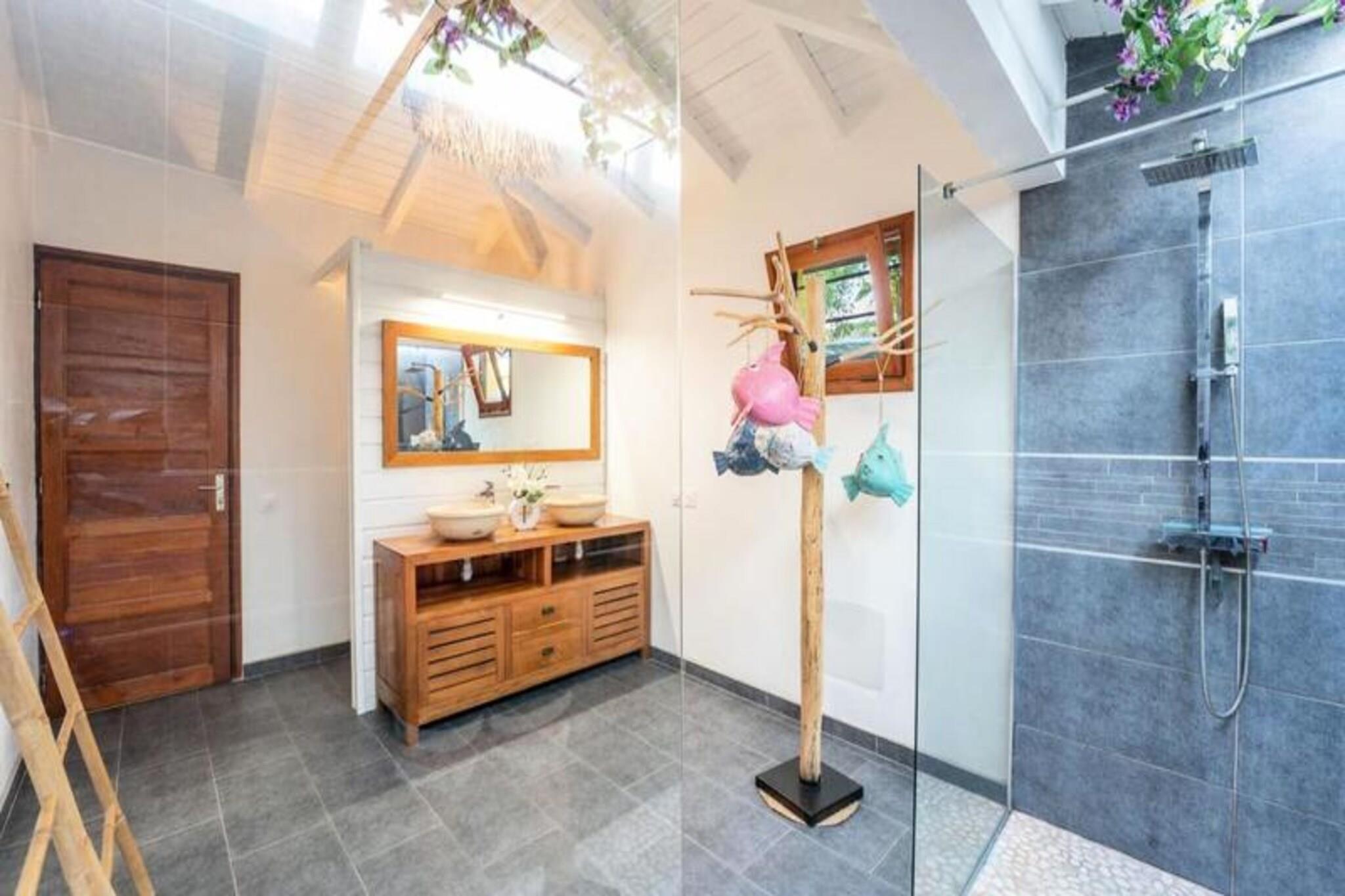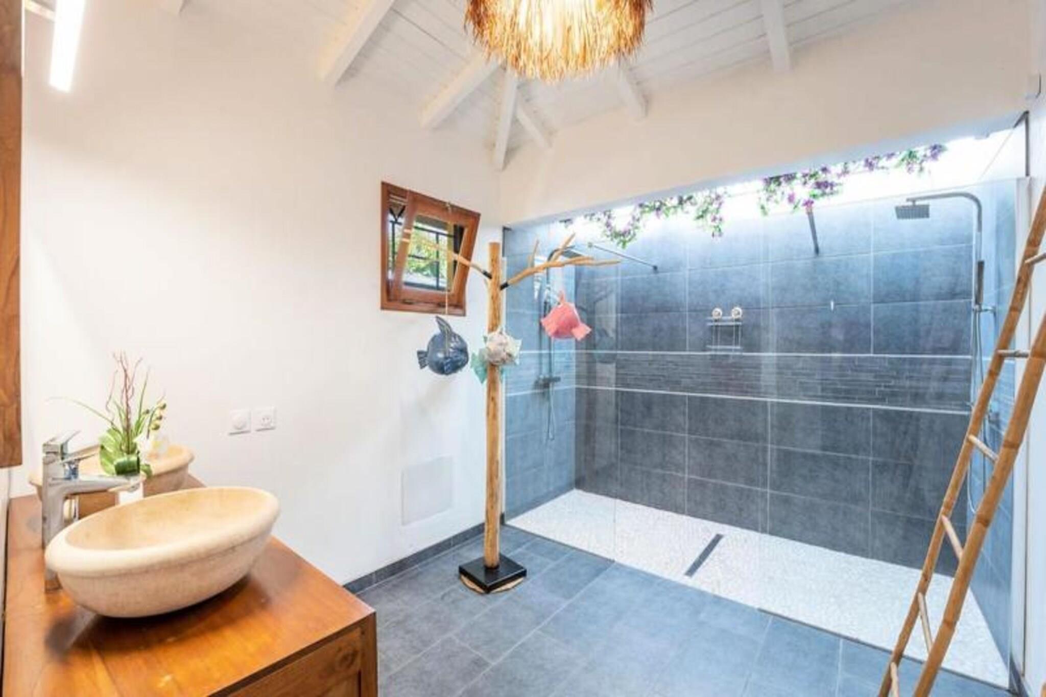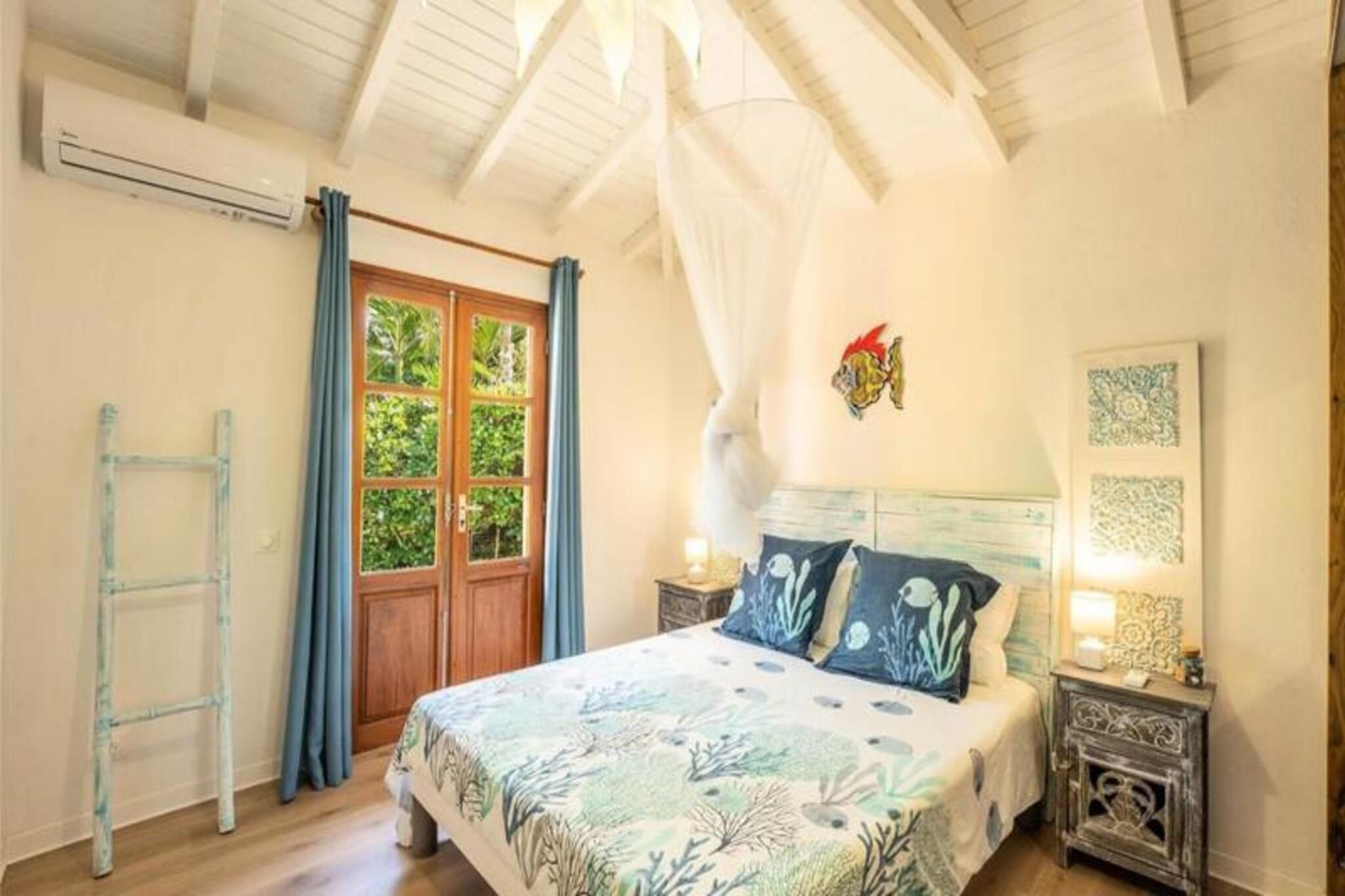 Denne fantastiske villa med privat saltvandspool tilbyder et luksuriøst ophold i en smuk park. Det har rummelige soveværelser, to stuer udstyret med fjernsyn og en elektrisk port for ekstra privatliv og sikkerhed. Der tilbydes babyvenlige faciliteter, herunder højstol, selepude, måltidssæt, badekar og toiletreduktion. Aircondition er tilgængeligt på alle værelser for at sikre et behageligt ophold. Bemærk venligst, at denne ejendom ikke er kæledyrsvenlig, hvilket sikrer et roligt og afslappende miljø for alle gæster. Denne villa ligger i Saint-François, kun 5 minutter fra Raisins Clair-stranden, marinaen og byens centrum, hvor du finder kommercielle lokaler, et supermarked, bageri, apotek og et marked med lokal fisk og krydderier. . Den nærliggende Saint-François Internationale Golfbane, kasino og flyveplads ligger inden for gåafstand. Villaen ligger også tæt på de smukkeste strande i Guadeloupe, herunder Anse à la Gourde og Anse-Champagne, ideel til vandsportsentusiaster, med muligheder for surfing og Wing Foil. Villaen er udstyret med et fuldt funktionelt køkken og et vandreservesystem, der sikrer en ensartet forsyning af vand. Håndklæder, sengetøj og rengøring er inkluderet. Gæsterne kan nyde internetadgang og en velkomstcocktail ved ankomsten. Den dedikerede concierge er til rådighed før, under og efter dit ophold for at hjælpe med særlige ønsker eller tjenester såsom udflugter, leje af køretøjer og lufthavnstransport.