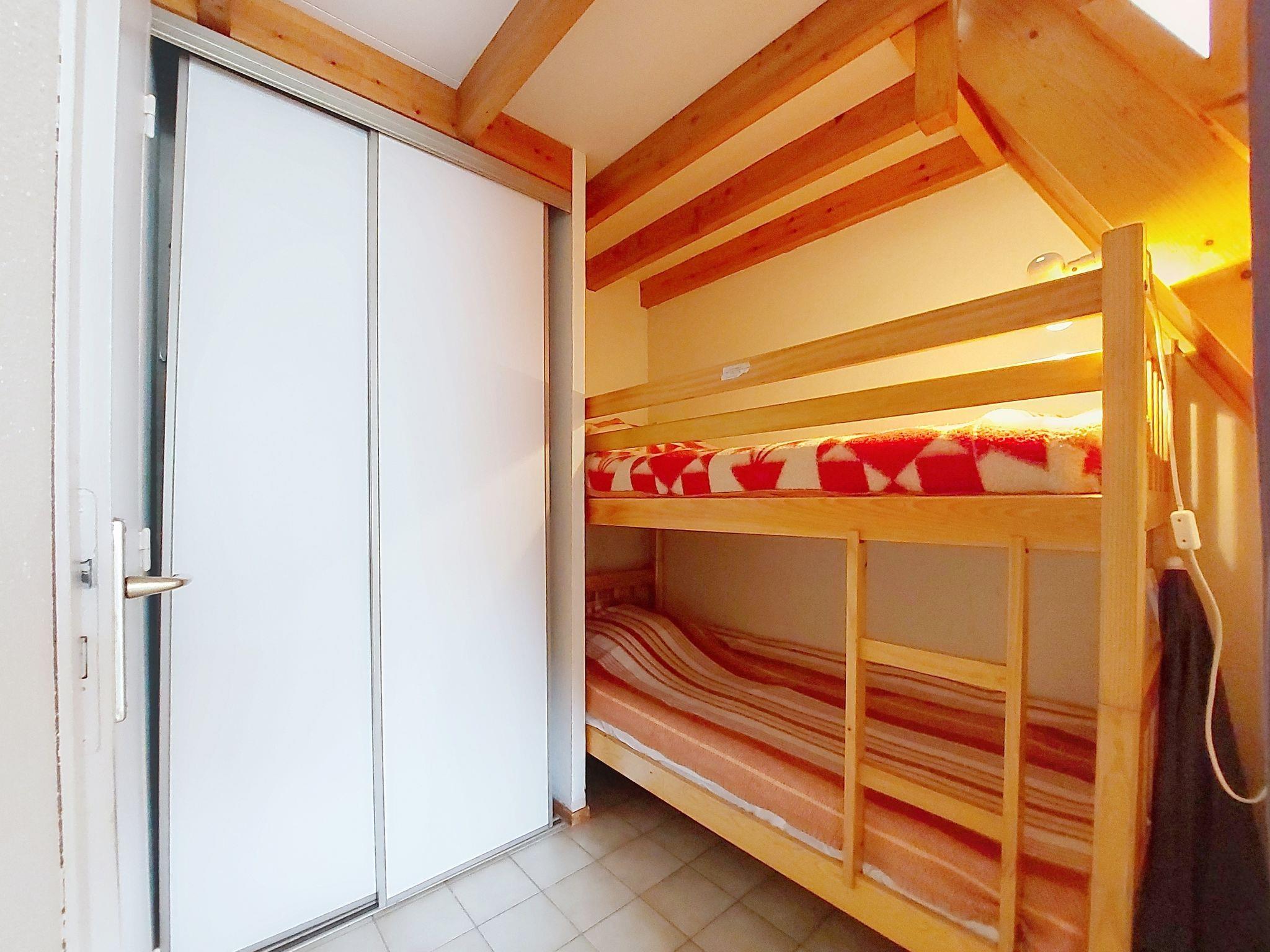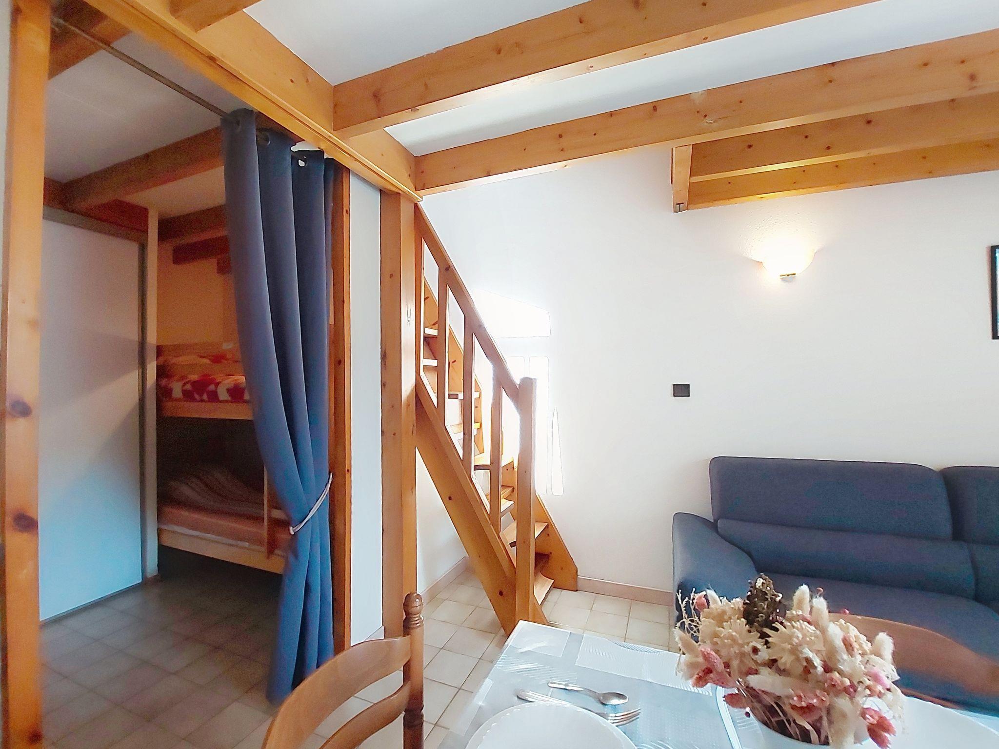 2-room terraced house 30 m2 on 2 levels. Living/dining room with TV. Exit to the terrace. Alcove with curtain with 1 x 2 bunk beds (80 cm, length 190 cm). Kitchenette (2 hot plates, mini-oven, microwave). Shower/WC. No heating option. Upper floor: (steep stair) open gallery with sloping ceilings with 1 french bed (1 x 140 cm, length 190 cm). Terrace, east facing position. Terrace furniture. Facilities: Internet (WiFi, extra). Parking space n 14. Please note: smoke alarm. Instead of an enclosed bedroom, some sleeping areas are located in an open-plan area (gallery, alcove, etc.).