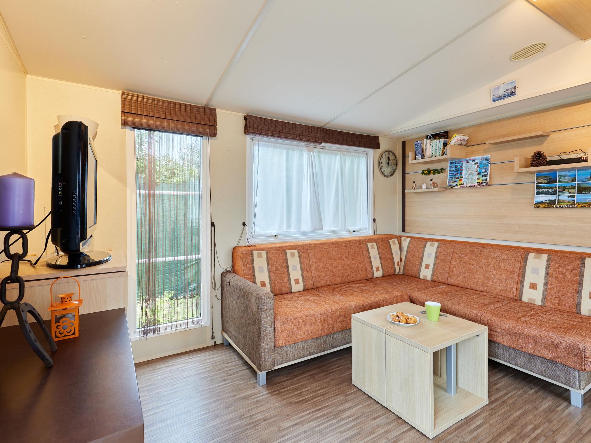 "Rêves & Sérénité", 3-room mobile home 40 m2. Comfortable and cosy furnishings: living/dining room 15 m2 with TV (flat screen). 1 room with 1 french bed (140 cm, length 190 cm). 1 room with 2 beds (80 cm, length 190 cm) with separate WC. Exit to the terrace. Large, open kitchen (oven, 4 gas rings, toaster, kettle, microwave, electric coffee machine, Capsules for coffee machine (Senseo)). Shower. Electric heating. Facilities: washing machine, dryer, hair dryer. Internet (WiFi, free). Parking (fenced 2 cars). Please note: non-smoking house. Maximum 1 pet/ dog allowed. Smoke alarm. Offer by a private individual according to Art. 155, IV of CGI.