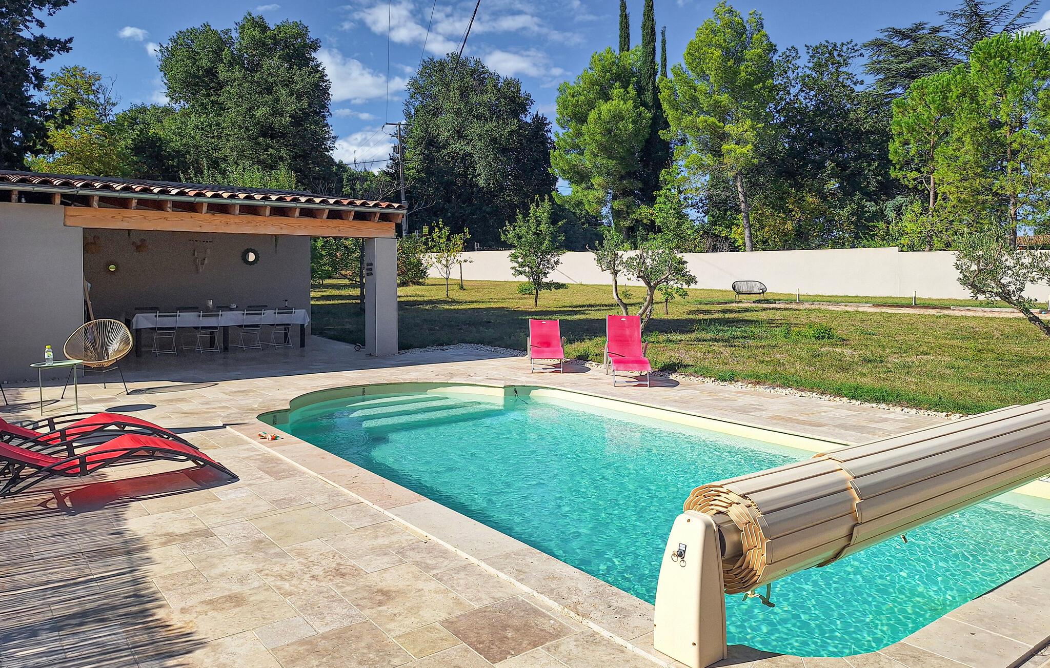 Det enkle interiør skaber en behagelig atmosfære, hvor det er nemt at slappe af. Kvaliteten af ??materialerne og lysstyrken bidrager til velvære, så snart I træder ind ad døren. Den store solterrasse og sommerkøkkenet med grill lægger op til at tilbringe hyggelige timer med familie eller venner i Provences skønne klima. I kan også se frem til den indbydende pool med solterrasse. Der er også gode rammer til jeres børn, som finder en privat legeplads i haven.