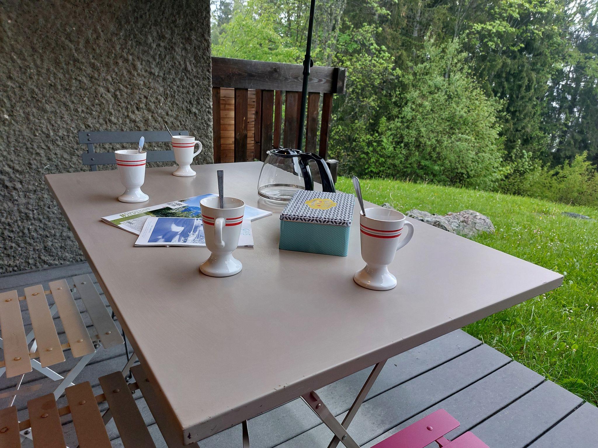 "Le Taguy", 1-room studio 26 m2. Entrance hall with 1 x 2 bunk beds (90 cm). Living/dining room with 1 double wall-trunk bed (140 cm), TV and flat screen. Exit to the terrace, south-east facing position. Kitchenette (2 hot plates, mini-oven, oven, toaster, kettle, electric coffee machine, raclette grill, combination microwave, fondue Set (cheese)). Bath/WC. Electric heating, underfloor heating. Small terrace, south-east facing position. Terrace furniture. Marvellous panoramic view of the mountains. Facilities: Internet (WiFi, extra). Please note: non-smokers only. Maximum 1 pet/ dog allowed. TV only FR. Smoke alarm, no lift.