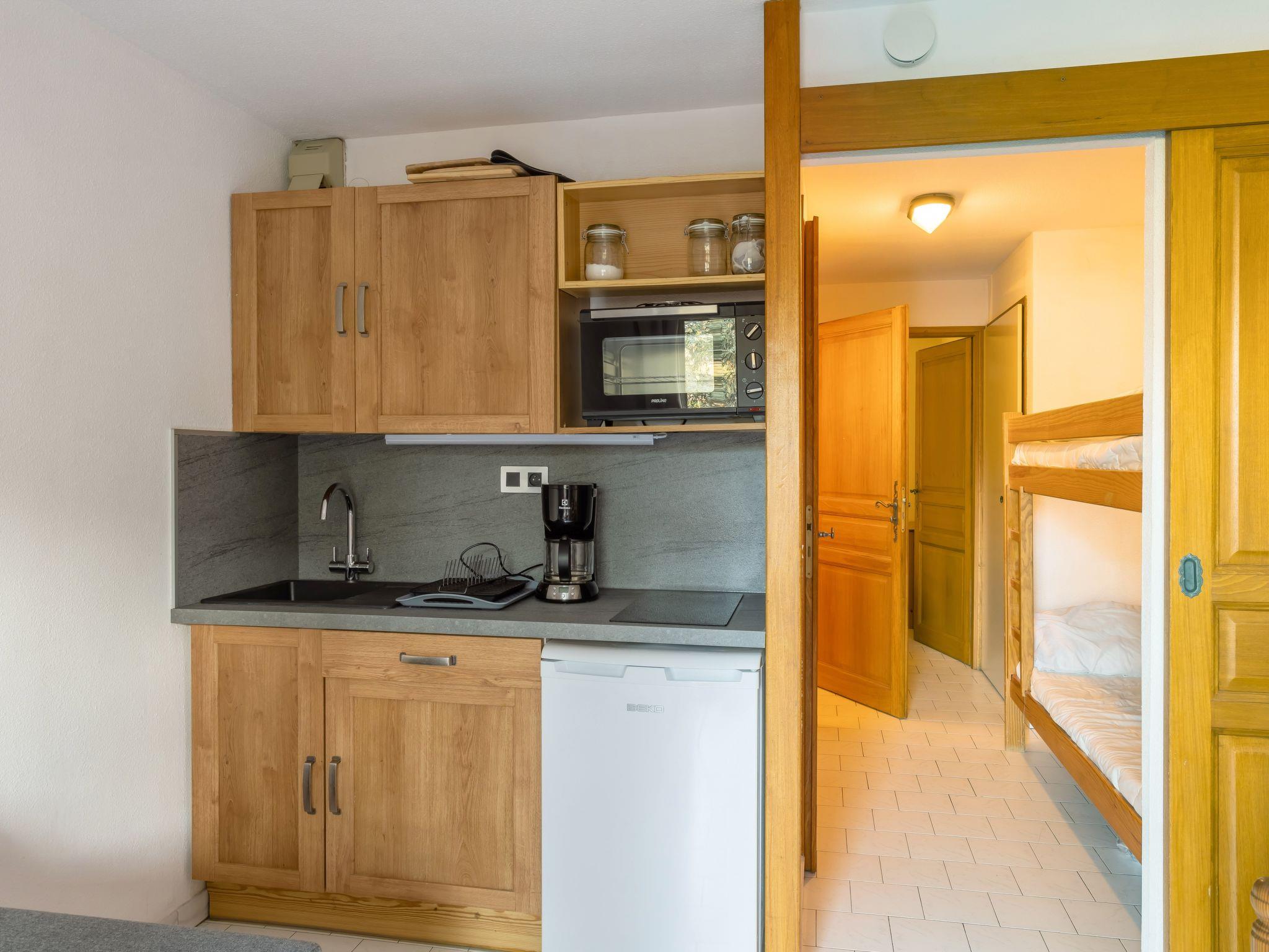 "Le Martagon 007", 2-room apartment 26 m2, on the ground floor. Object suitable for 2 adults + 2 children. Beautiful furnishings: entrance hall with 1 x 2 bunk beds (80 cm, length 190 cm). Living/dining room with TV (flat screen). Exit to the balcony. 1 small room with 1 french bed (140 cm, length 190 cm). Kitchenette (mini-oven, 2 ceramic glass hob hotplates, toaster, kettle, electric coffee machine, combination microwave). Bathroom, sep. WC. Electric heating. Small balcony 4 m2, west facing position. Balcony furniture. Beautiful view of the mountains. Facilities: Internet (WiFi, extra). Please note: non-smokers only. TV only FR. Smoke alarm, no lift.