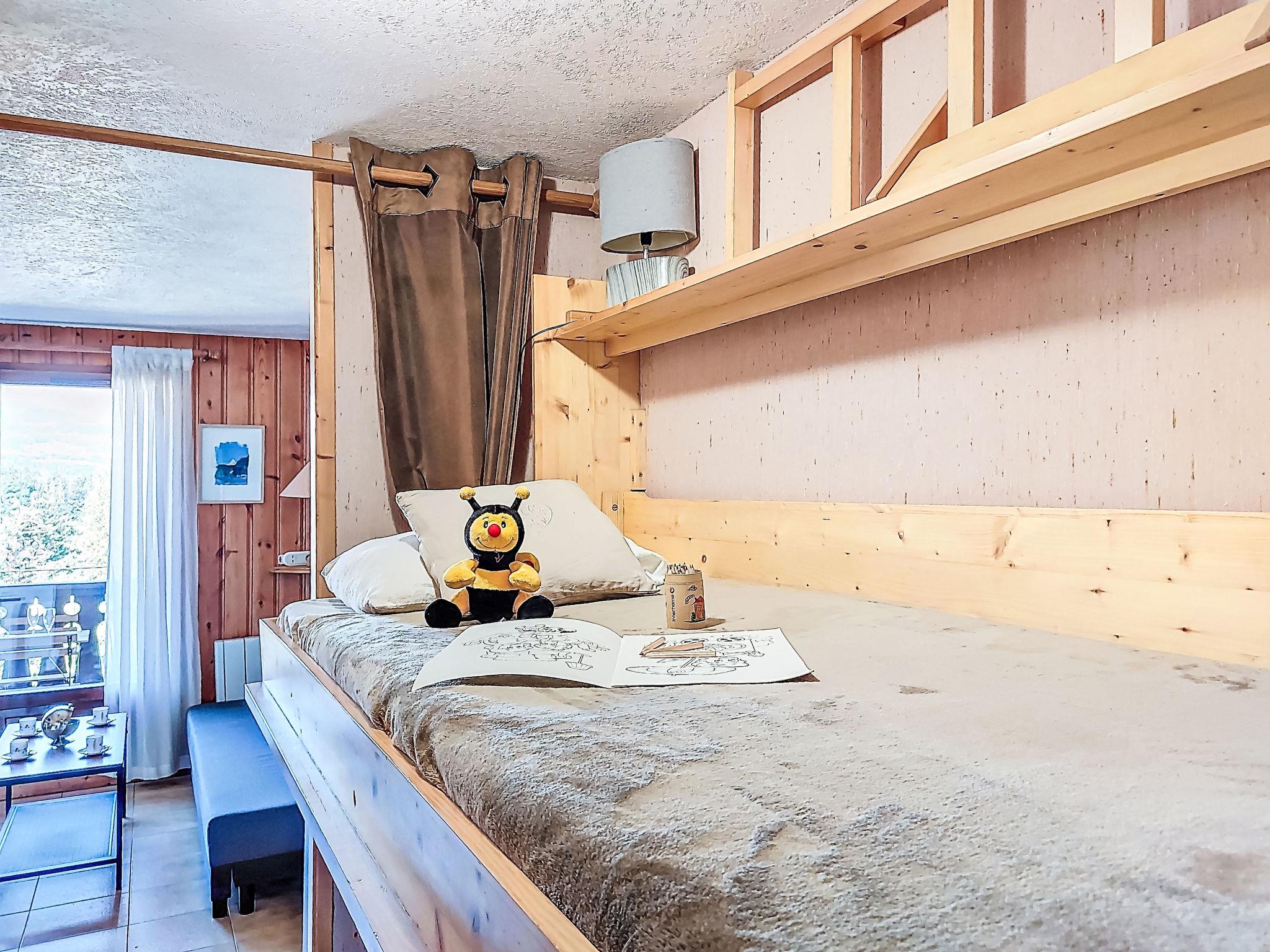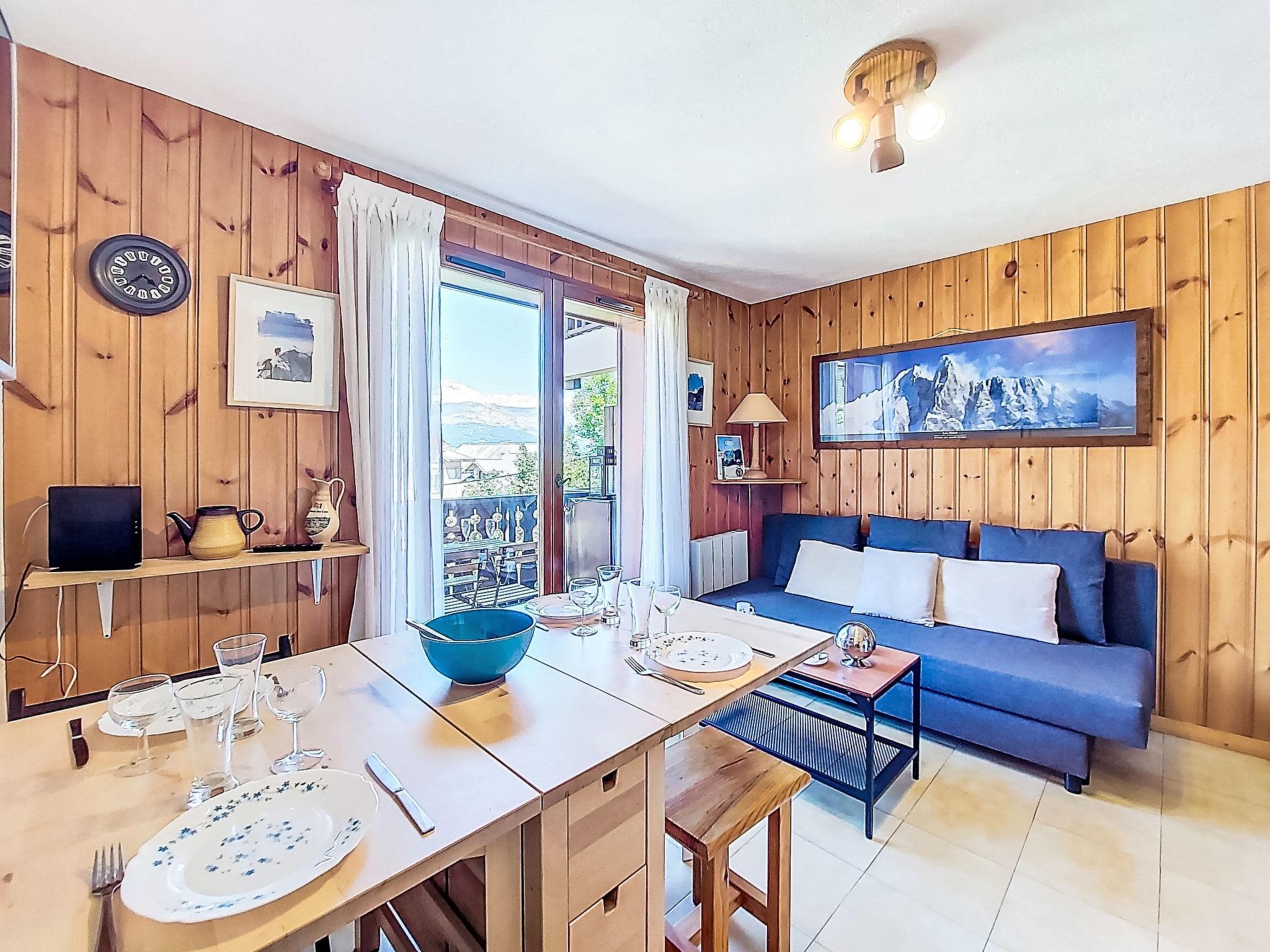 "Pointe des aravis B13", 2-room apartment 29 m2 on 1st floor. Living/dining room with TV. Exit to the balcony. Entrance hall with 2 wall-trunk beds (80 cm, length 190 cm). 1 room with 1 french bed (140 cm, length 190 cm). Kitchenette (4 hot plates, oven, dishwasher, toaster, kettle, electric coffee machine). Bathroom, sep. WC. Electric heating. Balcony, west facing position. Balcony furniture. Beautiful view of the mountains. Facilities: washing machine. Internet (WiFi, free). Parking. Please note: non-smokers only. 1 small pet/ dog allowed. TV only FR. Smoke alarm.