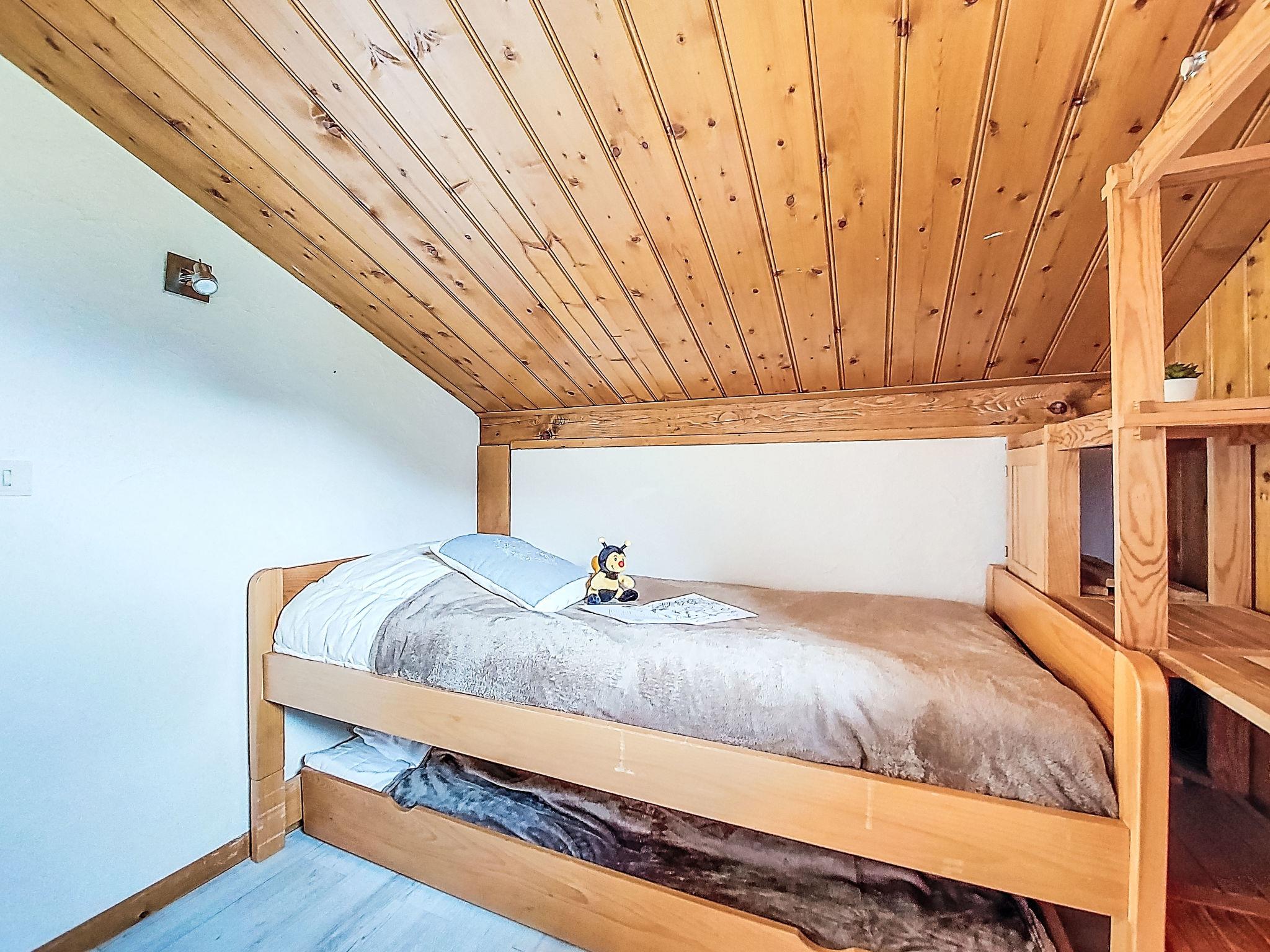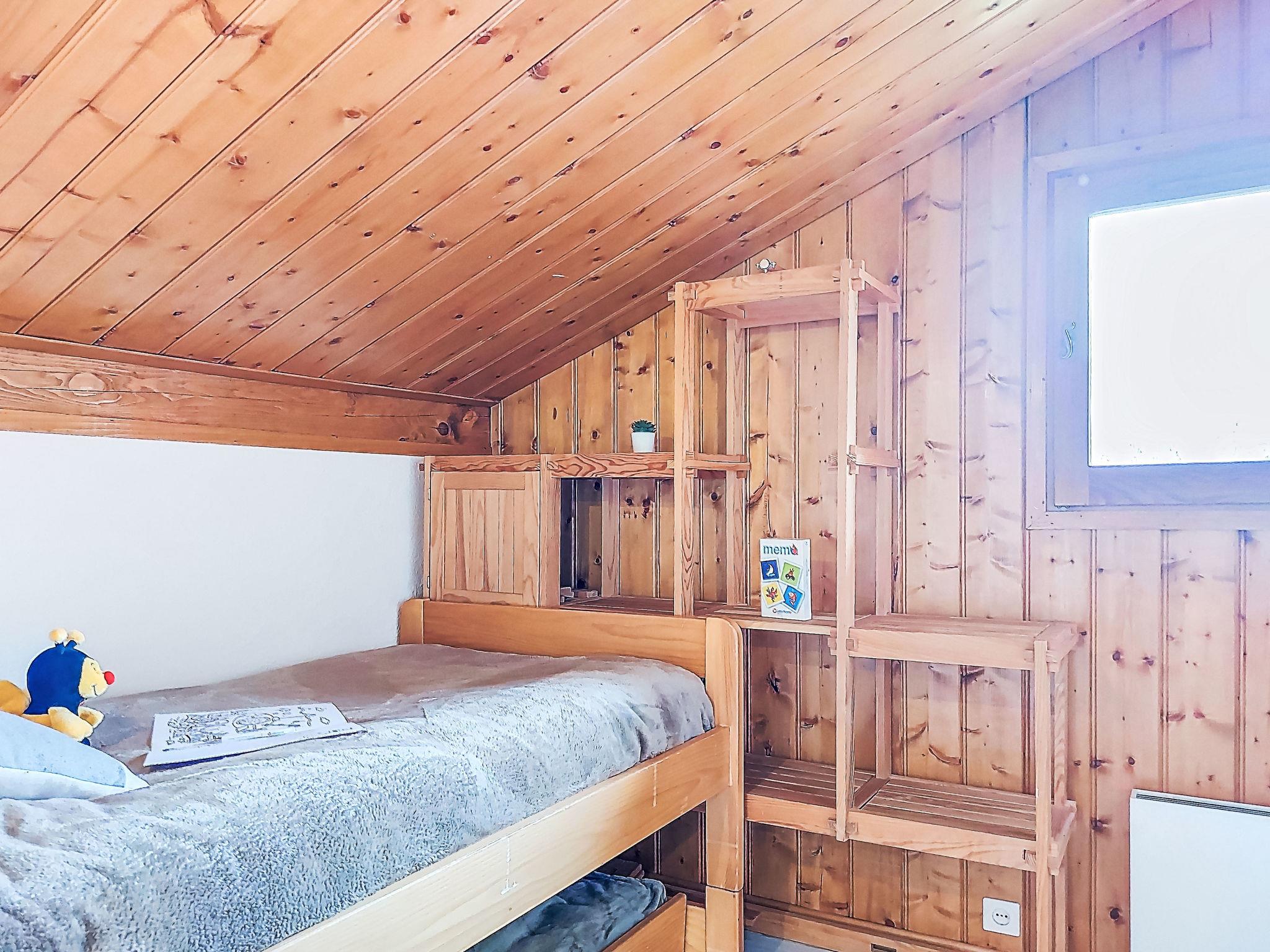 "Les Farfadets", 4-room chalet 41 m2 on 2 levels. Living/dining room. Exit to the terrace, east facing position. 1 room with 1 french bed (140 cm). Open kitchen (oven, dishwasher, 3 induction hot plates, toaster, kettle, freezer, electric coffee machine, raclette grill, combination microwave, fondue Set (cheese)). Bathroom, sep. WC. Upper floor: small lounge with sloping ceilings with TV. 2 rooms with sloping ceilings, each room with 1 bed (90 cm), 1 sleeping facility (90 cm). Electric heating, floor heating. Small terrace 4 m2, east facing position. View of the mountains. Facilities: washing machine. Internet (WiFi, extra). Parking (roofed). Please note: non-smokers only. TV only FR. Smoke alarm. 21 mq additional area lower than 1.80 m. 236N00426T