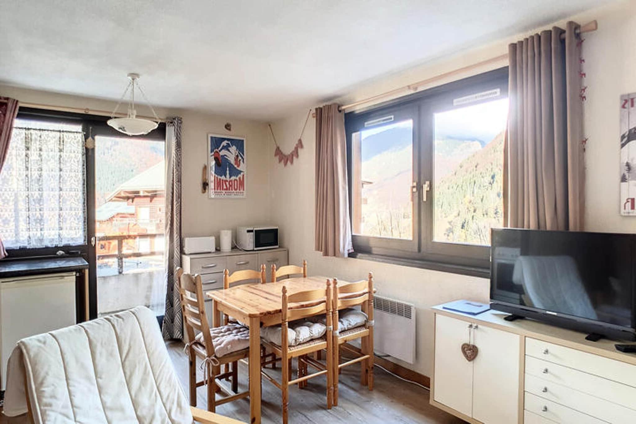 Dette charmerende studie er designet til komfortabelt at rumme op til fire gæster. Den har et bjerghjørne med en køjeseng (90x190 cm), et rummeligt opholdsområde med en sovesofa (160x200 cm) og rigelig opbevaringsplads. Studiet ligger på første sal i en velholdt bolig og byder på en lys, imødekommende atmosfære takket være sin hjørneposition. Lejligheden er ikke kæledyrsvenlig, hvilket sikrer et roligt, allergifrit miljø for gæsterne. Yderligere faciliteter inkluderer WIFI, et tv med dvd-afspiller og en raclettemaskine til op til 8 personer, perfekt til hyggelige aftener i. Denne studiolejlighed ligger i hjertet af feriestedet Saint Jean d'Aulps og tilbyder nem adgang til lokale attraktioner, caféer og butikker, alle inden for gåafstand. Skilifterne, skiskolen og dagplejen er kun en kort gåtur væk, hvilket gør det ideelt for dem, der ønsker at nyde vintersport eller udforske de omkringliggende bjerge. Gæster vil sætte pris på nærheden til markeder, hvilket giver mulighed for bekvem shopping under deres ophold. Studiet har et veludstyret køkken med gaskomfur, ovn, køleskab og vigtige små apparater som kaffemaskine, brødrister og blender. Badeværelset har badekar, håndvask og toilet, som giver alle de nødvendige faciliteter til et behageligt ophold. En nordøstvendt balkon byder på en dejlig udsigt over den omkringliggende dal, bjerge og skiløjper, hvilket skaber et perfekt sted at slappe af efter en dag med eventyr.