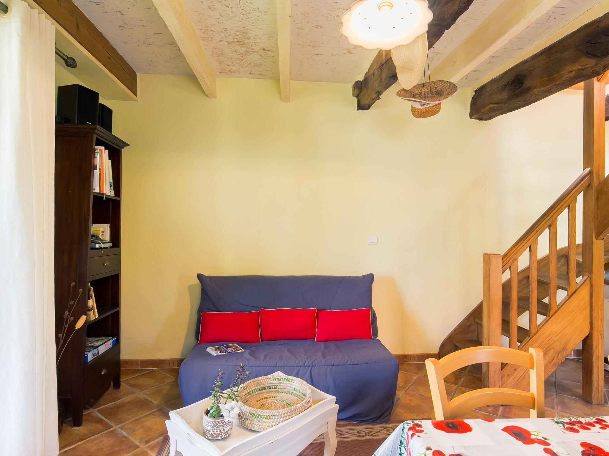 "L'Hirondelle", 2-room house 30 m2 on 2 levels. Bright, cosy furnishings: living/dining room with dining table, satellite TV, hi-fi system and DVD. Exit to the garden. Open kitchen (oven, dishwasher, 4 ceramic glass hob hotplates, toaster, kettle, microwave, electric coffee machine). Upper floor: 1 open room with sloping ceilings with 1 french bed (160 cm, length 200 cm), shower/WC and electric heating. Wooden floors. Patio. Terrace furniture, barbecue (portable). Facilities: washing machine, iron, children's high chair, baby cot. Internet (WiFi, free). Please note: non-smoking house. Maximum 1 pet/ dog allowed. Smoke alarm.