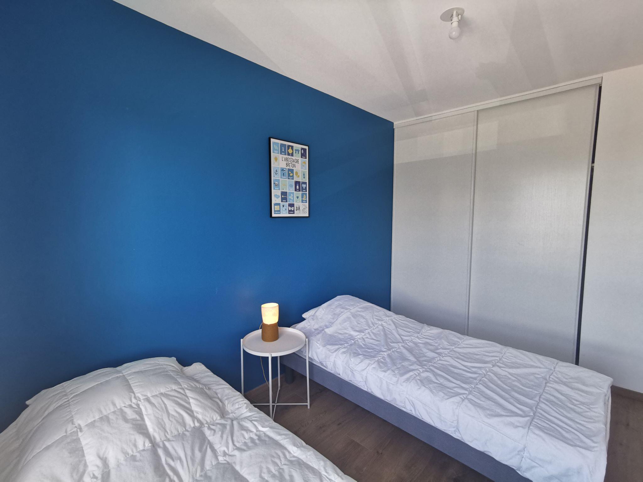 3-room apartment 54 m2 on 1st floor, south-west facing position. Spacious and bright, modern furnishings: large living/dining room with panoramic window with TV (flat screen), electric shutters. Exit to the balcony. 1 room with 1 french bed (1 x 140 cm, length 190 cm). Exit to the balcony. 1 room with 2 beds (90 cm, length 190 cm). Open kitchen (oven, dishwasher, 4 induction hot plates, electric coffee machine). Shower, sep. WC. Electric heating. Balcony 8 m2. Balcony furniture. Facilities: Internet (WiFi, extra). Parking space n 21. Please note: TV only FR. Smoke alarm, no lift. 3528800294309