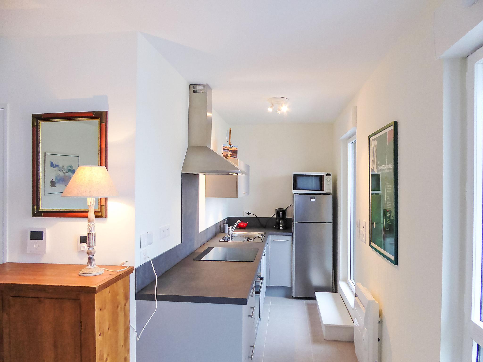 1-room studio 32 m2 on 5th floor. Object suitable for 2 adults. Bright, comfortable and beautiful furnishings: large living/dining room with 1 double fold-away bed (1 x 140 cm, length 190 cm), TV (flat screen), hi-fi system, DVD and electric shutters. Open kitchen (oven, dishwasher, 3 ceramic glass hob hotplates, toaster, kettle, microwave, freezer, electric coffee machine). Exit to the terrace. Shower/WC. Electric heating. Small balcony 4 m2, south facing position. Facilities: Internet (WiFi, free). Garage space n 22. Please note: non-smokers only. Smoke alarm. The apartment is strictly for 2 adults. Not suitable for children or babies. Individual box closed in the basement. 352880004702E