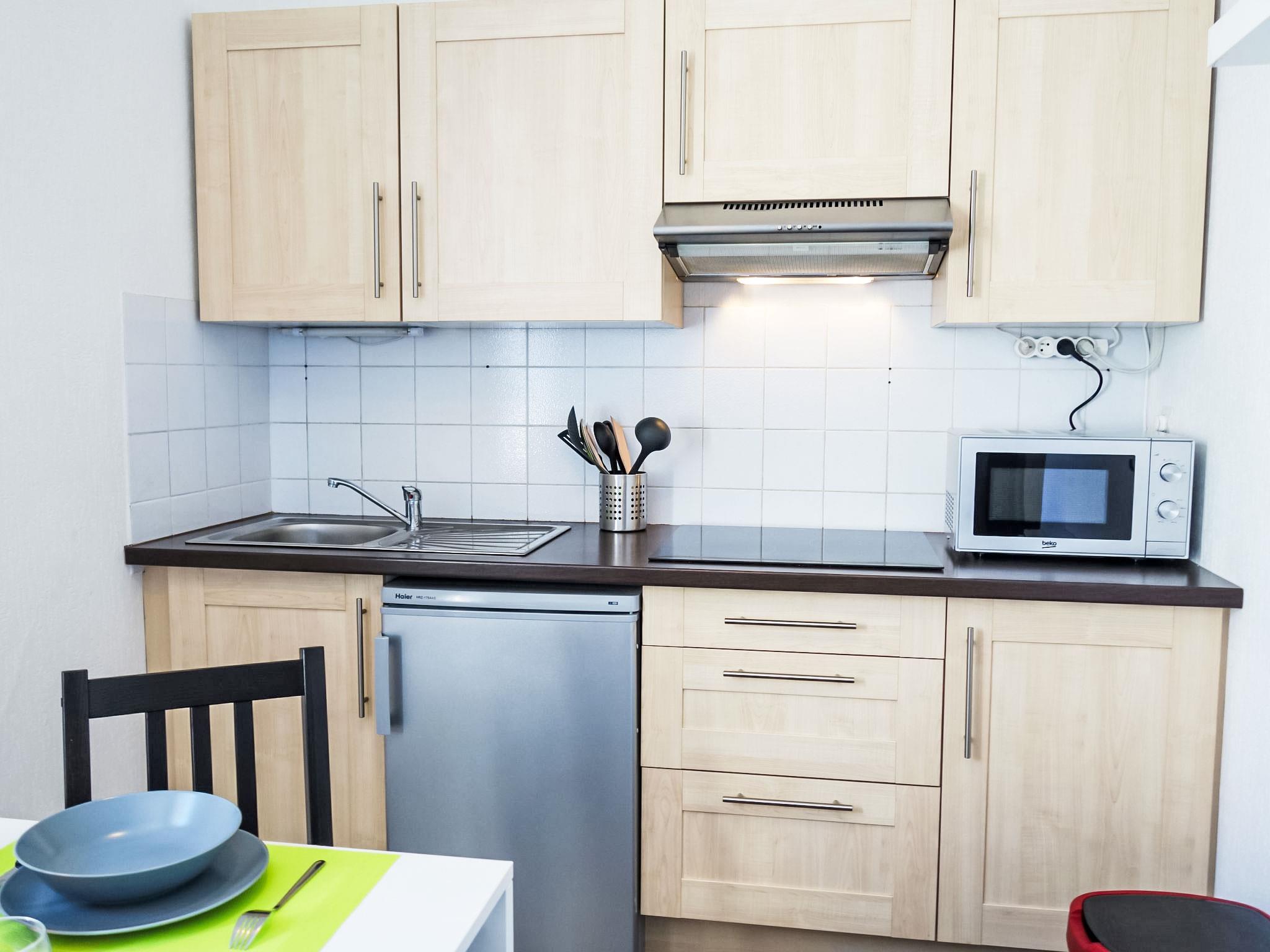 1-room apartment 30 m2 on 1st floor. Practical and comfortable furnishings: living/sleeping room with 1 double bed (1 x 140 cm, length 190 cm), TV (flat screen). Kitchen (mini-oven, oven, 3 induction hot plates, toaster, kettle, microwave, electric coffee machine) with dining table. Shower/WC. Facilities: washing machine, hair dryer. Internet (WiFi, extra). Please note: apartment street side. 1 small pet/ dog allowed. Smoke alarm. 352880007356A