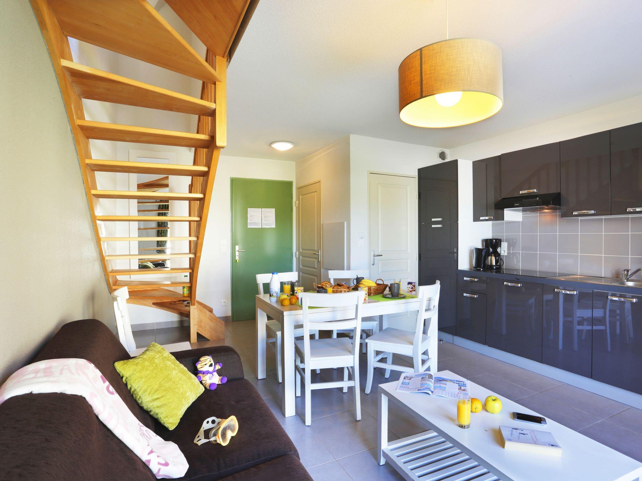 "Le Domaine des Mauriers", 2-room house 34 m2 on 2 levels. Bright, beautiful furnishings: living/dining room with 1 sofabed (140 cm, length 190 cm), dining table and TV can be hired. Exit to the balcony, to the terrace. Open kitchen (dishwasher, 4 ceramic glass hob hotplates, toaster, kettle, electric coffee machine, combination microwave). Sep. WC. Upper floor: 1 room with 1 french bed (140 cm, length 190 cm). Bathroom. Electric heating. Terrace. Terrace furniture. Facilities: children's high chair, baby cot. Internet (WiFi, extra). Please note: non-smoking house. Maximum 1 pet/ dog allowed. Smoke alarm.