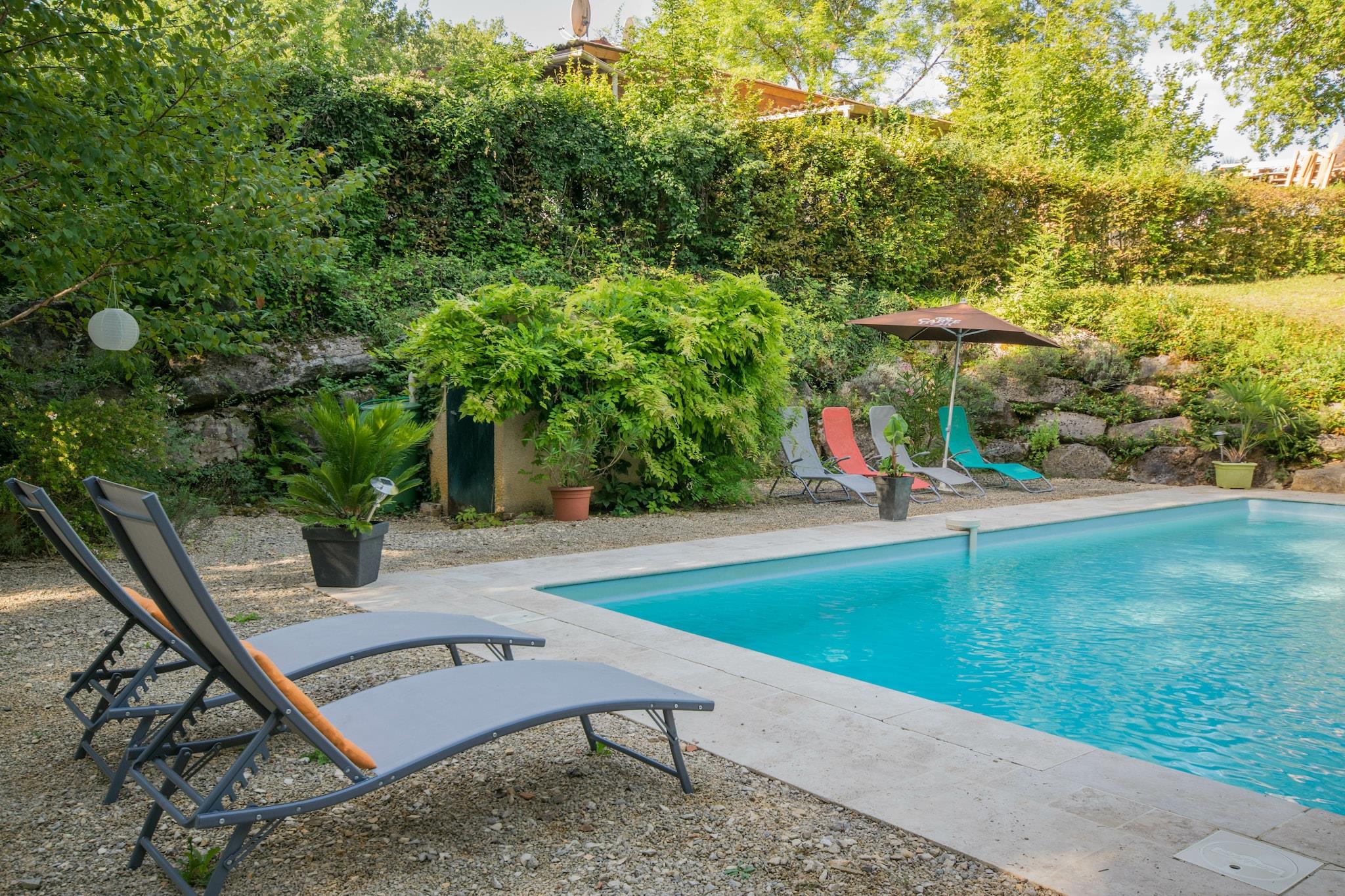 Beliggende i den fredelige landsby Saint-Martin-le-Redon tilbyder dette rummelige 2-værelses feriehus et afslappende oase for op til 6 gæster. Ejendommen er ideel til familier og har en stor privat swimmingpool (5×10 m), møbleret have og grill - perfekt til afslappede udendørs måltider. Indenfor kombinerer boligen komfort og bekvemmelighed med et veludstyret køkken (ovn, mikroovn, opvaskemaskine, køle-fryseskab), aircondition og en hyggelig pejs til køligere aftener. Soveværelserne med 2 enkeltsenge og dobbeltværelser på første sal har hver en suite badeværelser, hvilket sikrer privatlivets fred og lethed for alle gæster. Der er gratis WiFi overalt. Udforsk det naturskønne Lot-landskab med nærliggende vandrestier, cykelruter og charmerende landsbyer. Byens centrum ligger kun 1,5 km væk, og byder på lokale butikker, restauranter og en smag af regional kultur. Den nærmeste lufthavn ligger cirka 25 km væk, hvilket gør denne rolige flugt både tilgængelig og fredfyldt. Uanset om du slapper af ved poolen eller opdager nærliggende slotte og vinmarker, lover denne landlige oase et mindeværdigt ophold i det sydvestlige Frankrig.