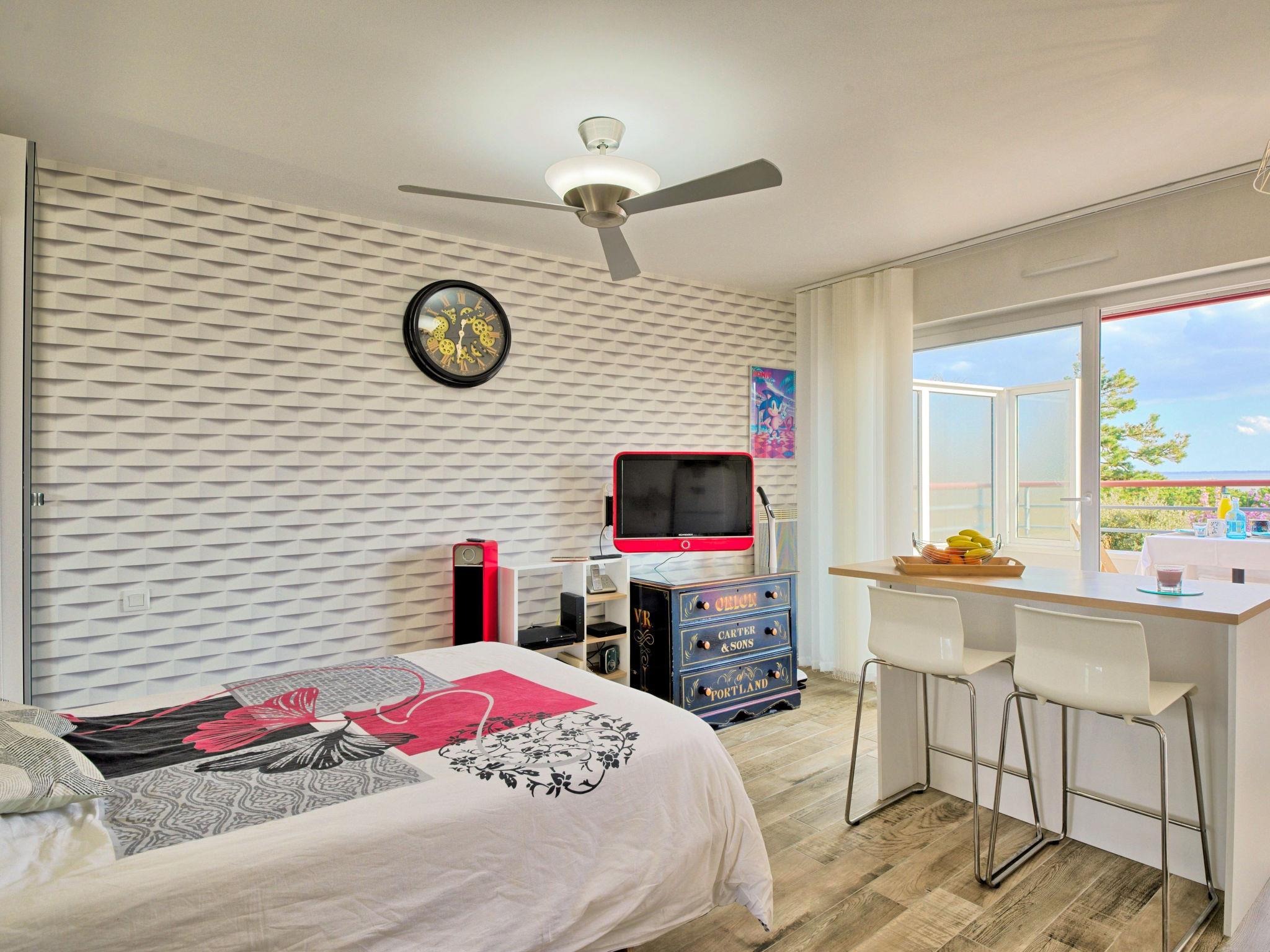 "Charme de Villès Martin", 1-room apartment 28 m2 on 3rd floor. Bright, renovated in 2022, beautiful furnishings: entrance hall. Living room with 1 wall-trunk bed (140 cm, length 200 cm), TV (flat screen). Exit to the terrace. Kitchenette (2 induction hot plates, toaster, kettle, electric coffee machine, combination microwave). Shower/WC. Electric heating. Large terrace 11 m2, south facing position. Terrace furniture, electric barbecue, deck chairs (2). View of the sea. Facilities: washing machine. Internet (WiFi, free). Please note: non-smokers only. Smoke alarm. Offer by a private individual according to Art. 155, IV of CGI.