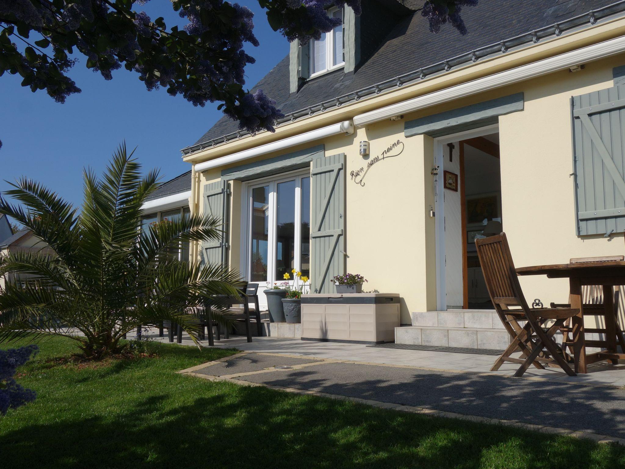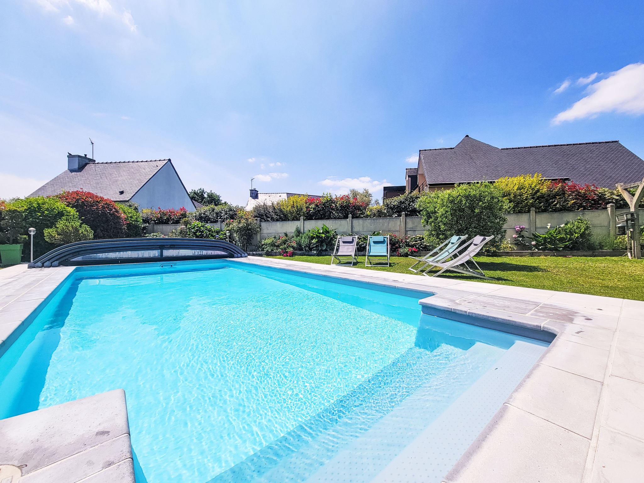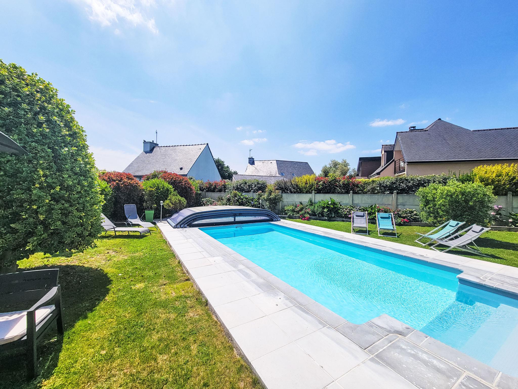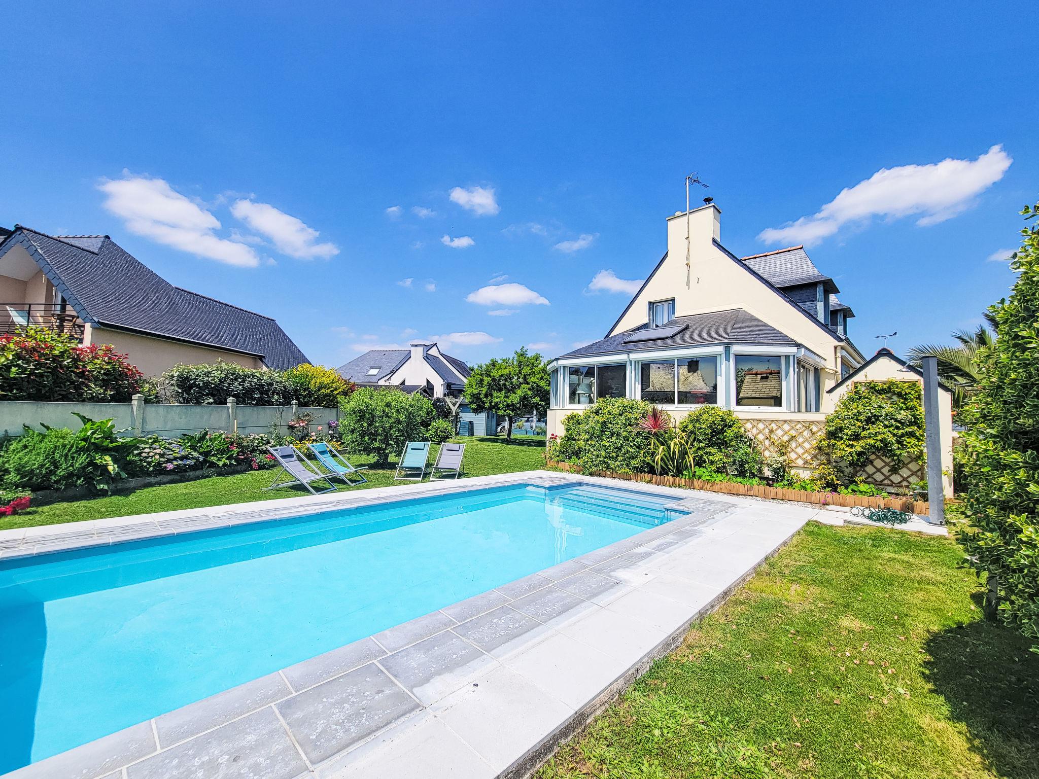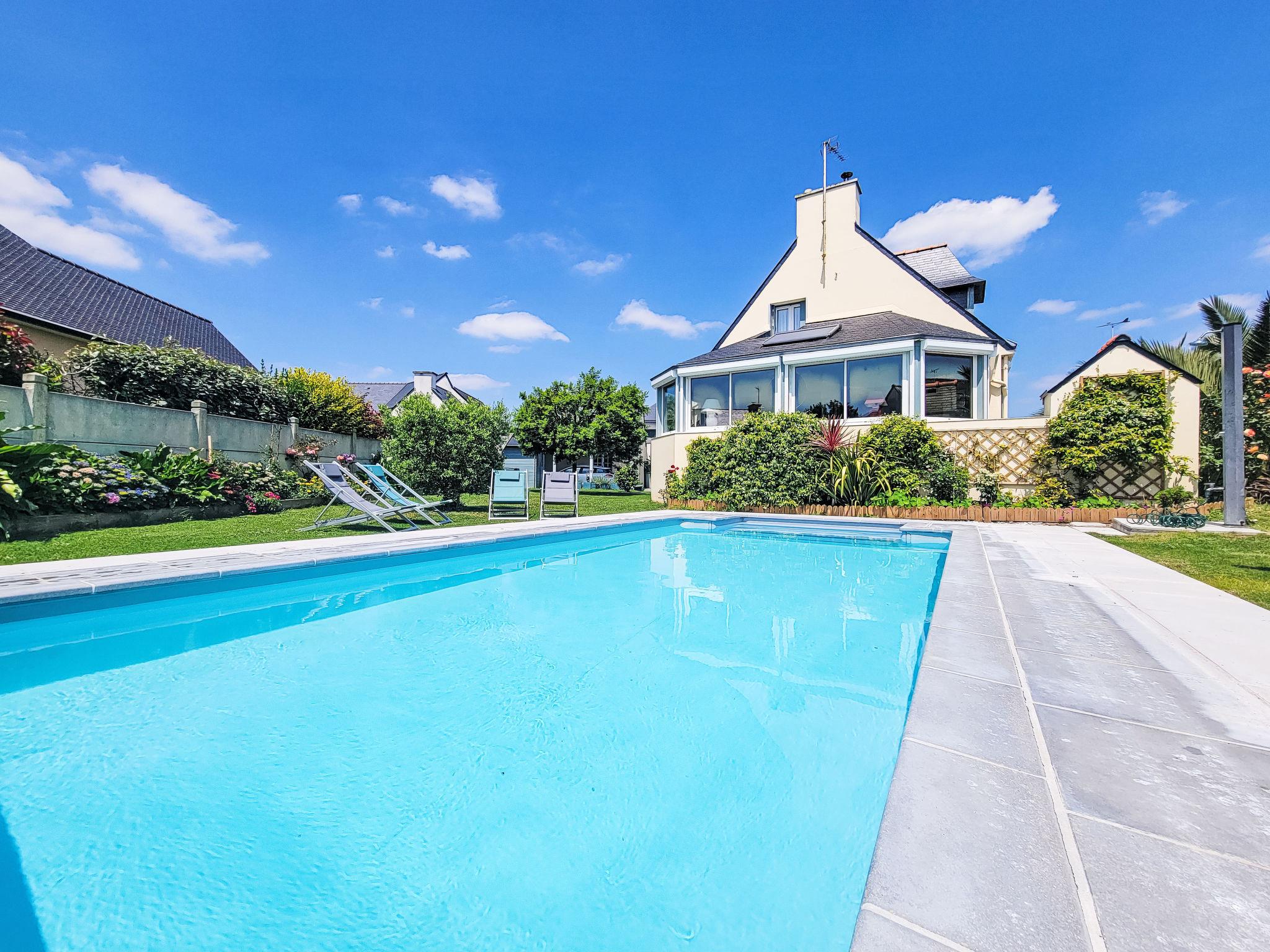 Saint Philibert 8 km from Carnac: Large single-family house "Phil'blue". In the centre of Saint Philibert, 400 m from the sea, 1 km from the beach. Private: well-kept garden 1'000 m2 (fenced), indoor pool angular, heated, secured (8 x 4 m, depth 140 - 160 cm, seasonal availability: 01.Apr. - 19.Sep.). Outdoor shower. In the house: storage room for bicycles. Grocery 400 m, supermarket 2 km, restaurant 400 m, bakery 400 m, sandy beach "Men er Belleg ou Kernevest" 1.6 km, thermal baths "Thalasothérapie Thalazur" 8 km. Golf course (18 hole) 12 km, sailing school 1.6 km, riding stable 4 km. Nearby attractions: La Trinité Sur Mer 4 km, Carnac et ses alignements 8 km, Presqu'île de Quiberon 15 km, Vannes 35 km, Plage de Locmariaquer par voie cyclable 7 km, Belle ile en Mer, Houat, Hoedic. Hiking paths: Le Golfe du Morbihan.