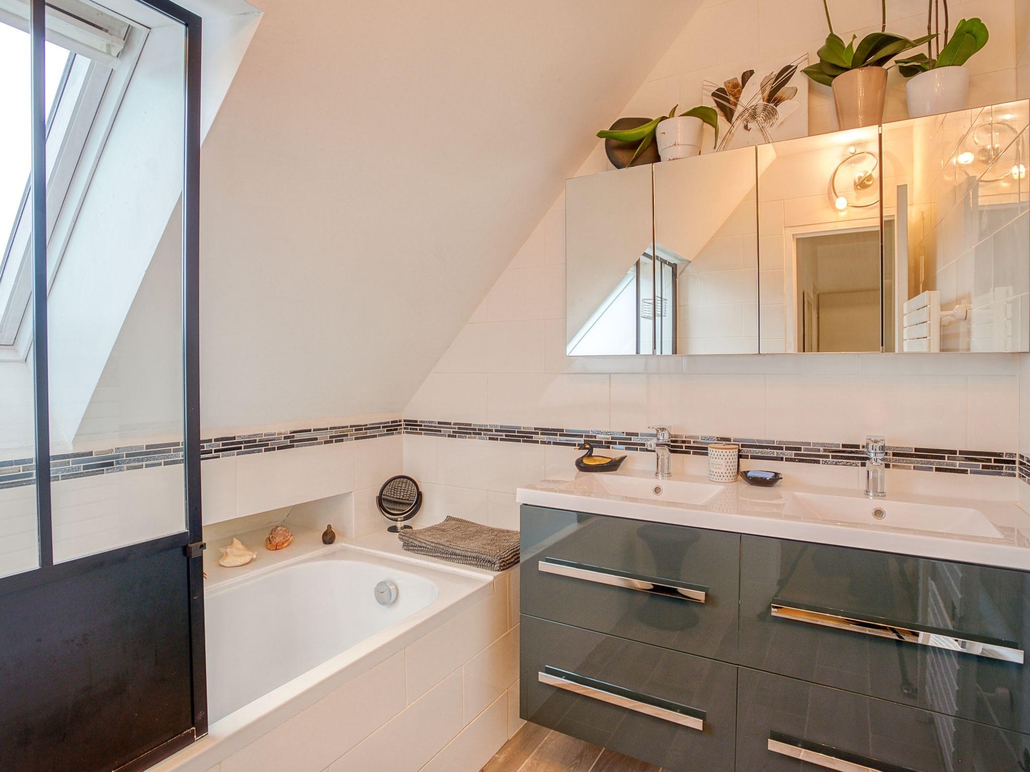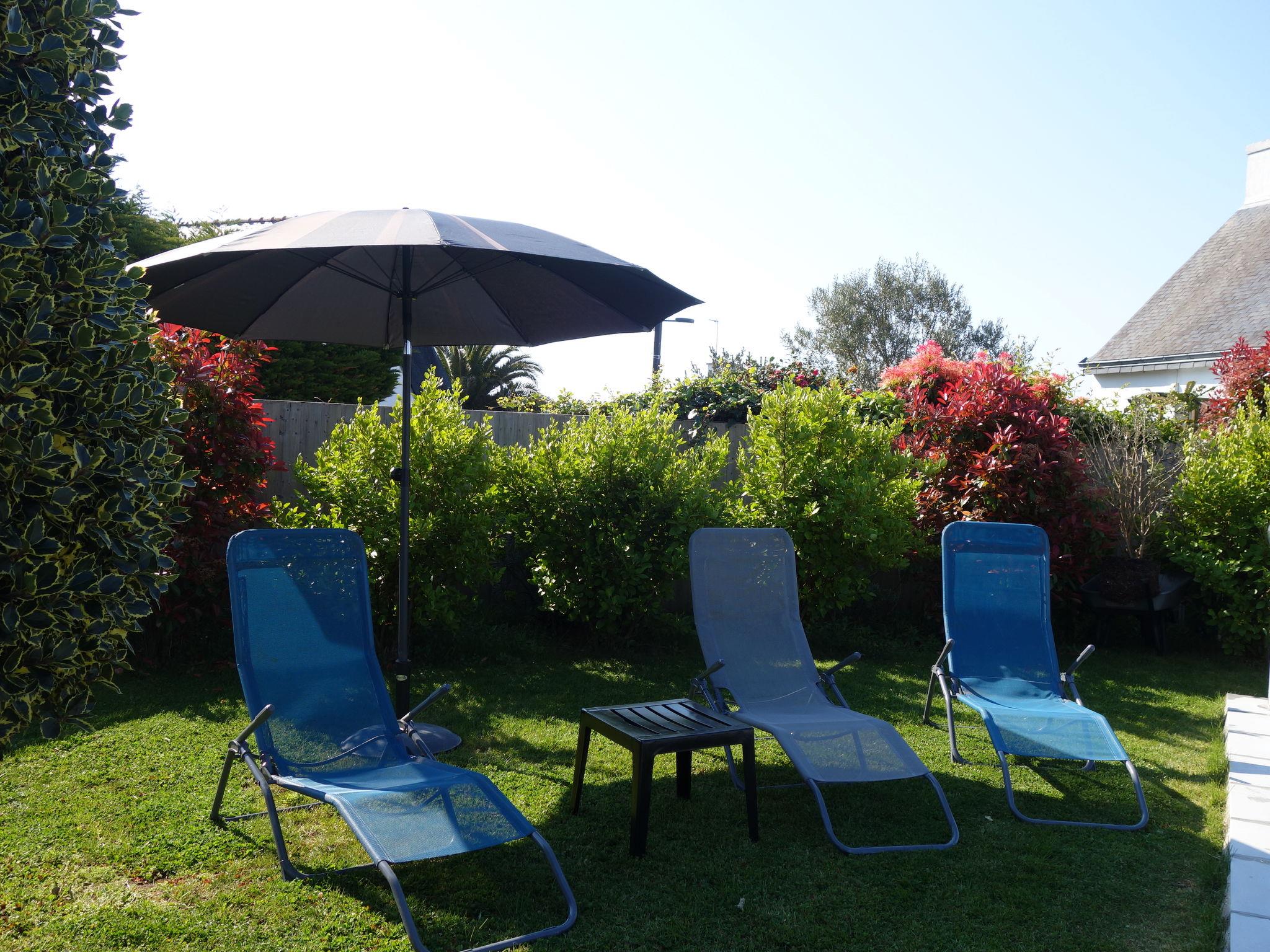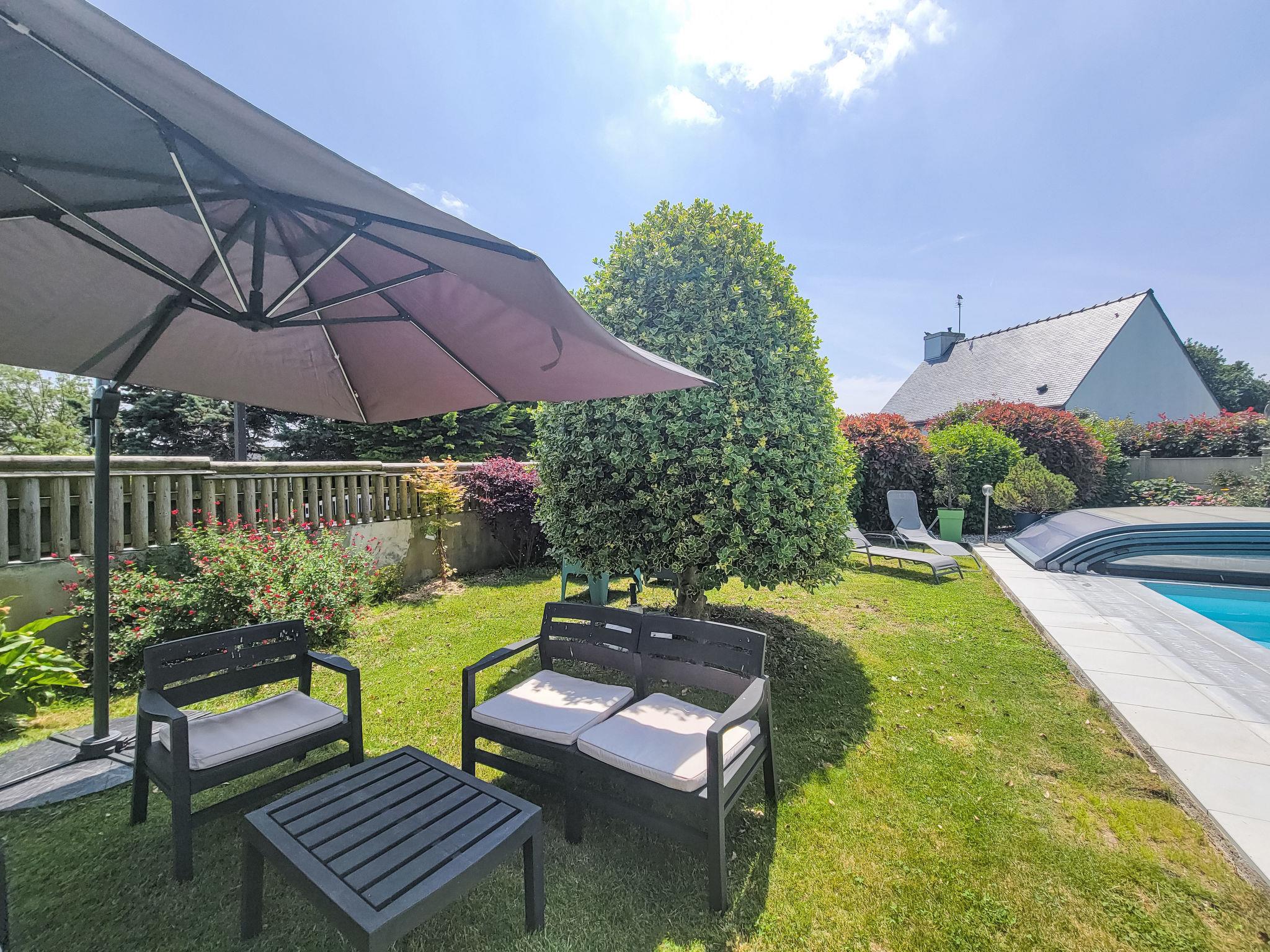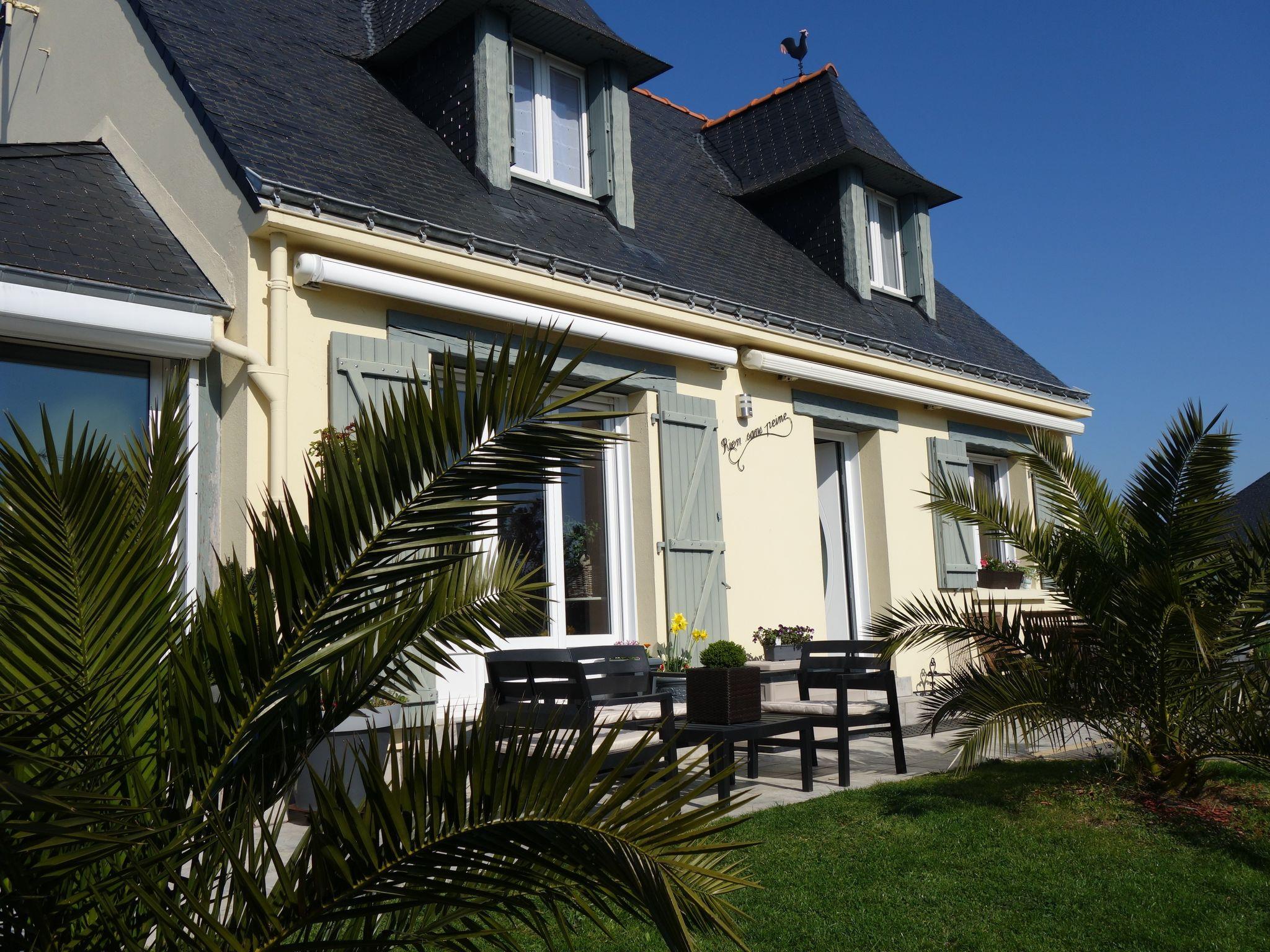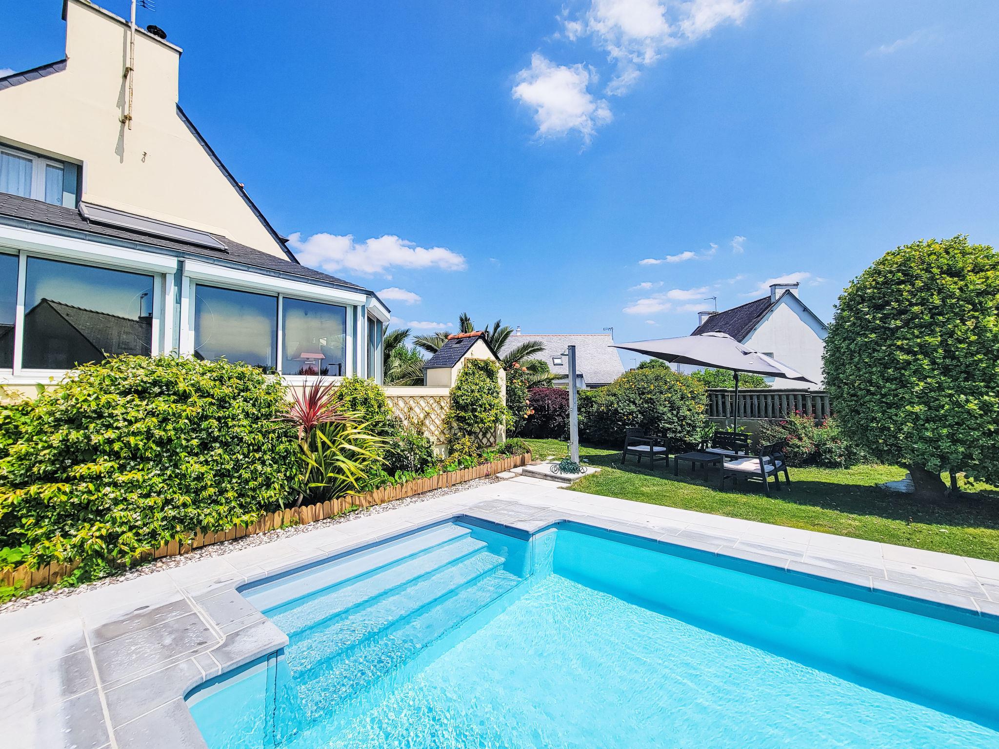 Saint Philibert 8 km from Carnac: Large single-family house "Phil'blue". In the centre of Saint Philibert, 400 m from the sea, 1 km from the beach. Private: well-kept garden 1'000 m2 (fenced), indoor pool angular, heated, secured (8 x 4 m, depth 140 - 160 cm, seasonal availability: 01.Apr. - 19.Sep.). Outdoor shower. In the house: storage room for bicycles. Grocery 400 m, supermarket 2 km, restaurant 400 m, bakery 400 m, sandy beach "Men er Belleg ou Kernevest" 1.6 km, thermal baths "Thalasothérapie Thalazur" 8 km. Golf course (18 hole) 12 km, sailing school 1.6 km, riding stable 4 km. Nearby attractions: La Trinité Sur Mer 4 km, Carnac et ses alignements 8 km, Presqu'île de Quiberon 15 km, Vannes 35 km, Plage de Locmariaquer par voie cyclable 7 km, Belle ile en Mer, Houat, Hoedic. Hiking paths: Le Golfe du Morbihan.