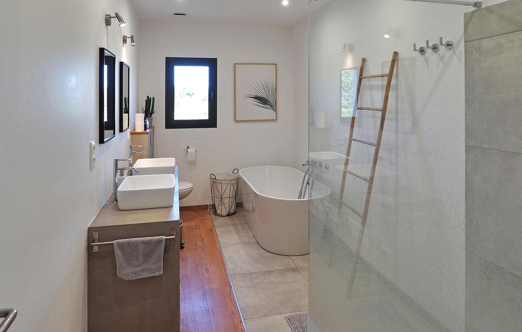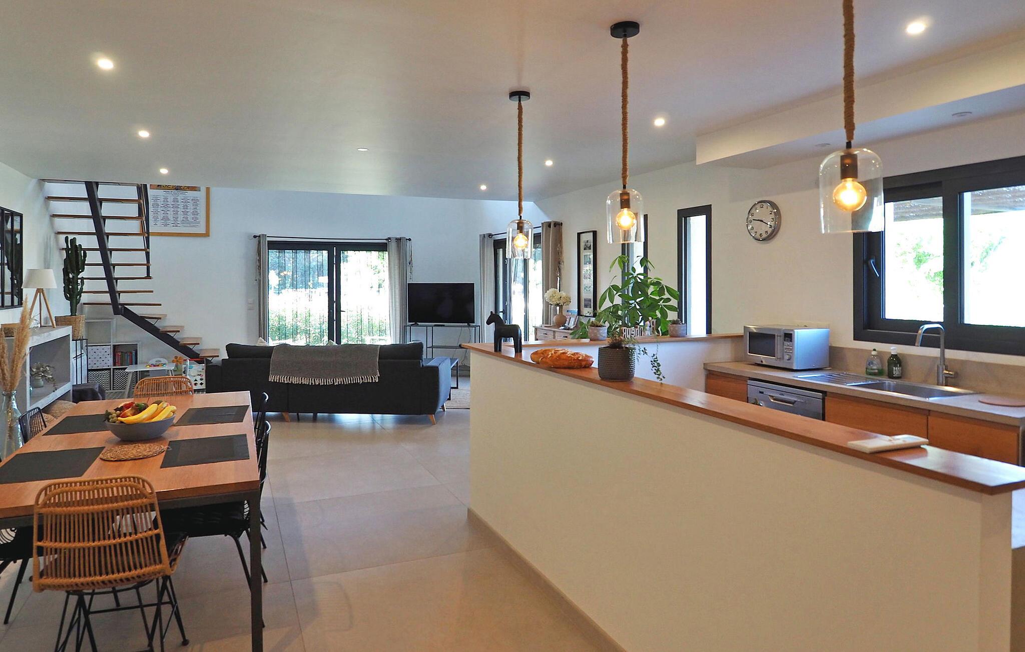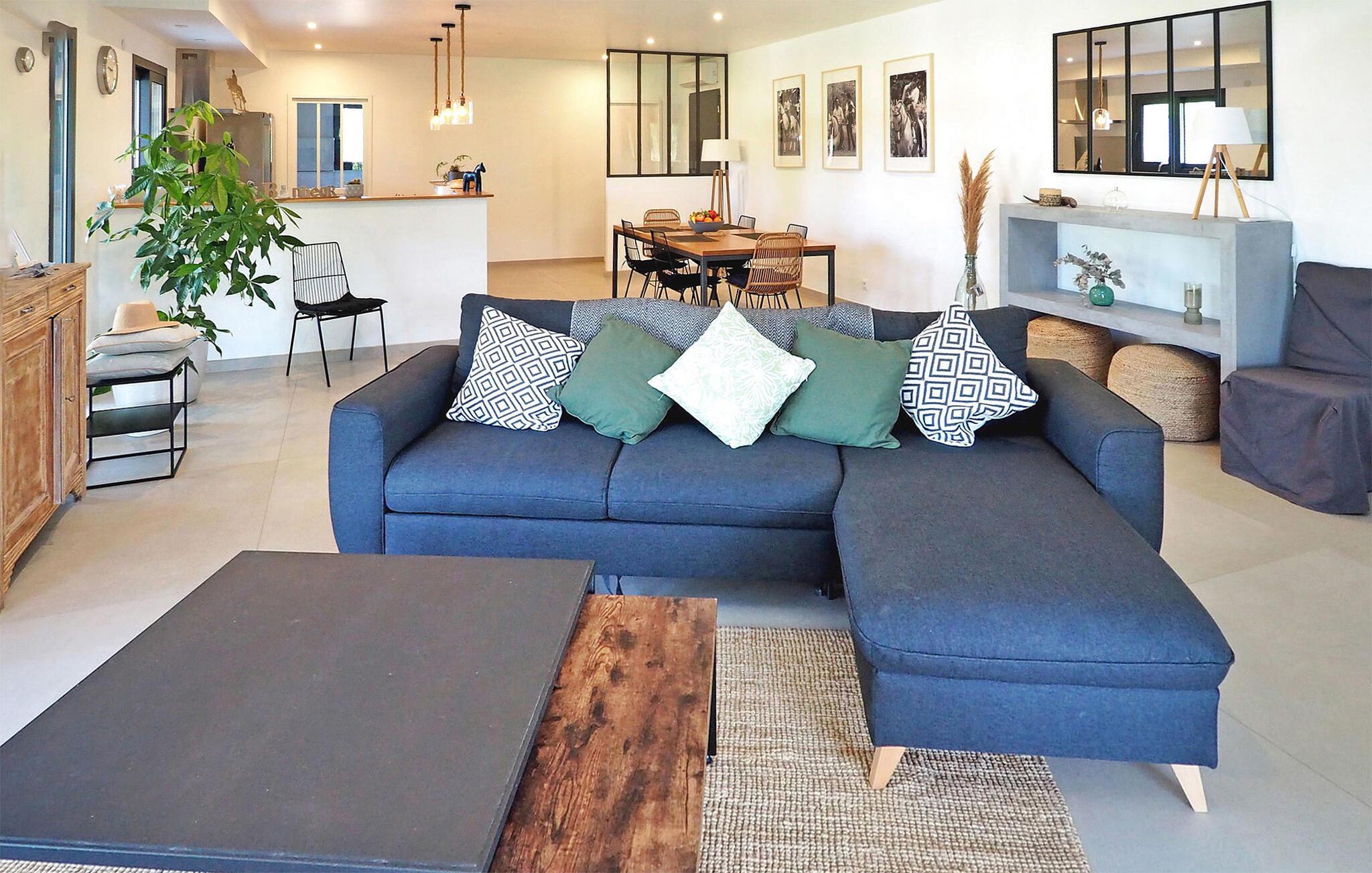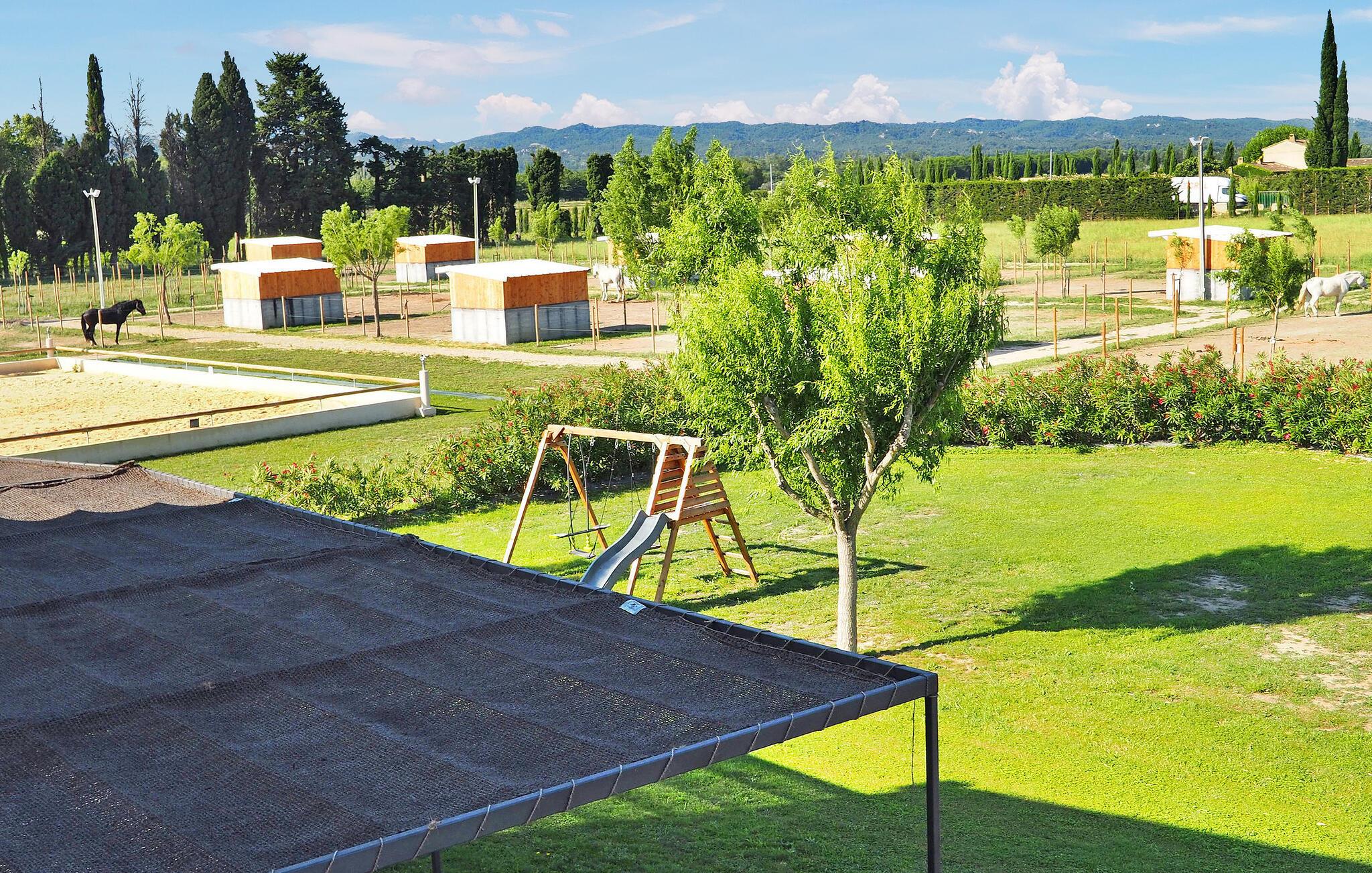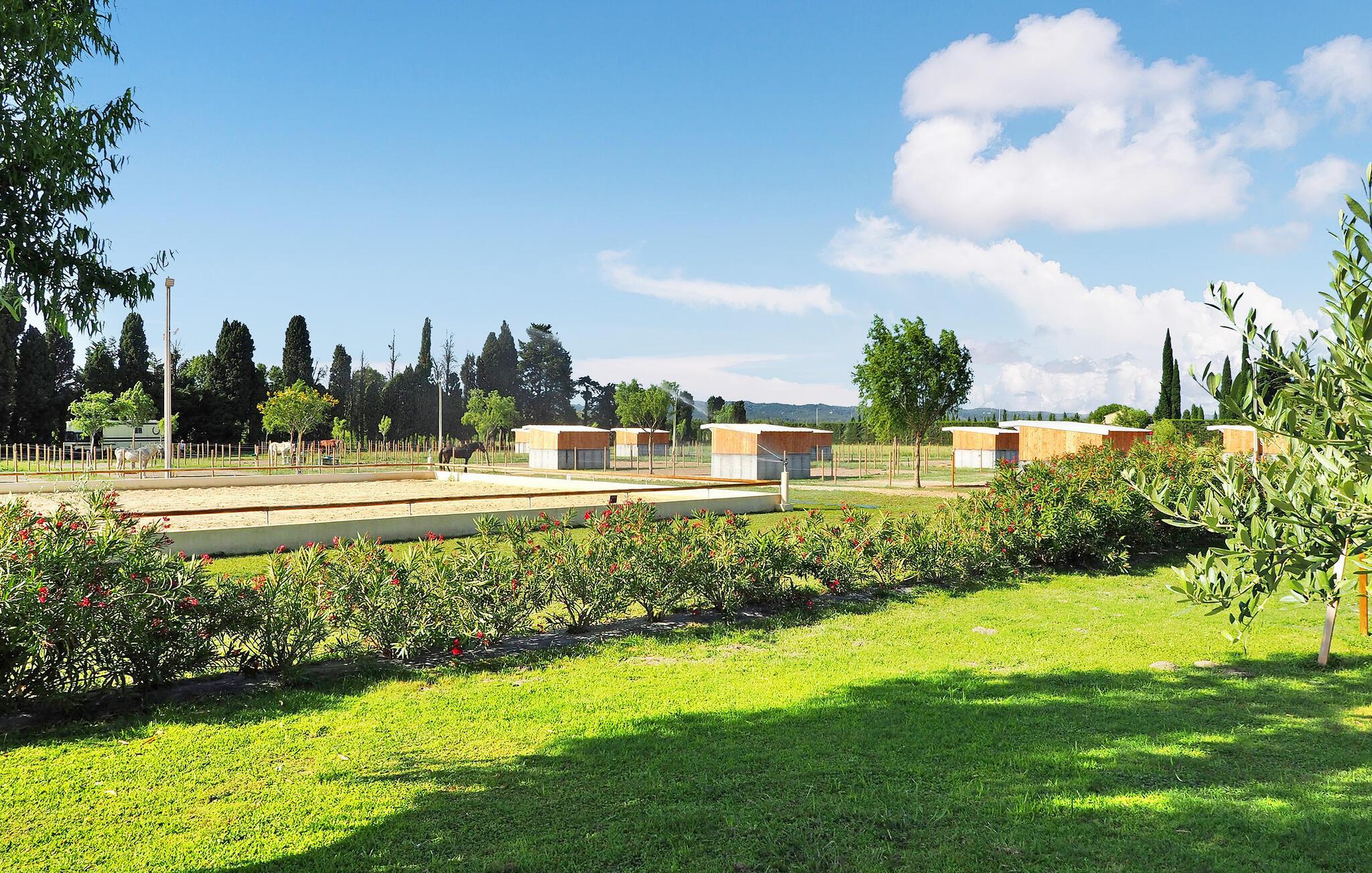 Beliggende på en ridegård, tilbyder dette moderne sommerhus, kun 10 minutter fra Saint Rémy de Provence, et idyllisk tilflugtssted. Fordyb dig i elegant indretning, suppleret med en privat have, swimmingpool, børnespil og en charmerende oleanderhave omgivet af heste. Stueetagen har en rummelig åben stue med aircondition. En moderne åben trintrappe fører til en læsekrog på en mezzaninrepos komplet med aircondition, det perfekte sted at sidde og undslippe det varme sommersolskin. I mellemtiden udenfor er en privat swimmingpool (9m x 4,5m) med et poolhus omgivet af en terrasse med et udendørs bord og 6 stole sammen med en 4-personers havemøbler. Børn vil glæde sig over træhytten på terrassen og havens gynge. Oplev ro og luksus i hjertet af Provence. Vigtige bemærkninger: Stuen og reposen ovenpå har aircondition. Heste, selvom de er i nærheden, kan ikke komme ind i haven. Sommerhuset støder på bagsiden, med et ikke-kommunikerende landbrugsskur fra ryttergodset. Ejere bor på samme ejendom, hvilket sikrer opmærksom service uden indtrængen.
