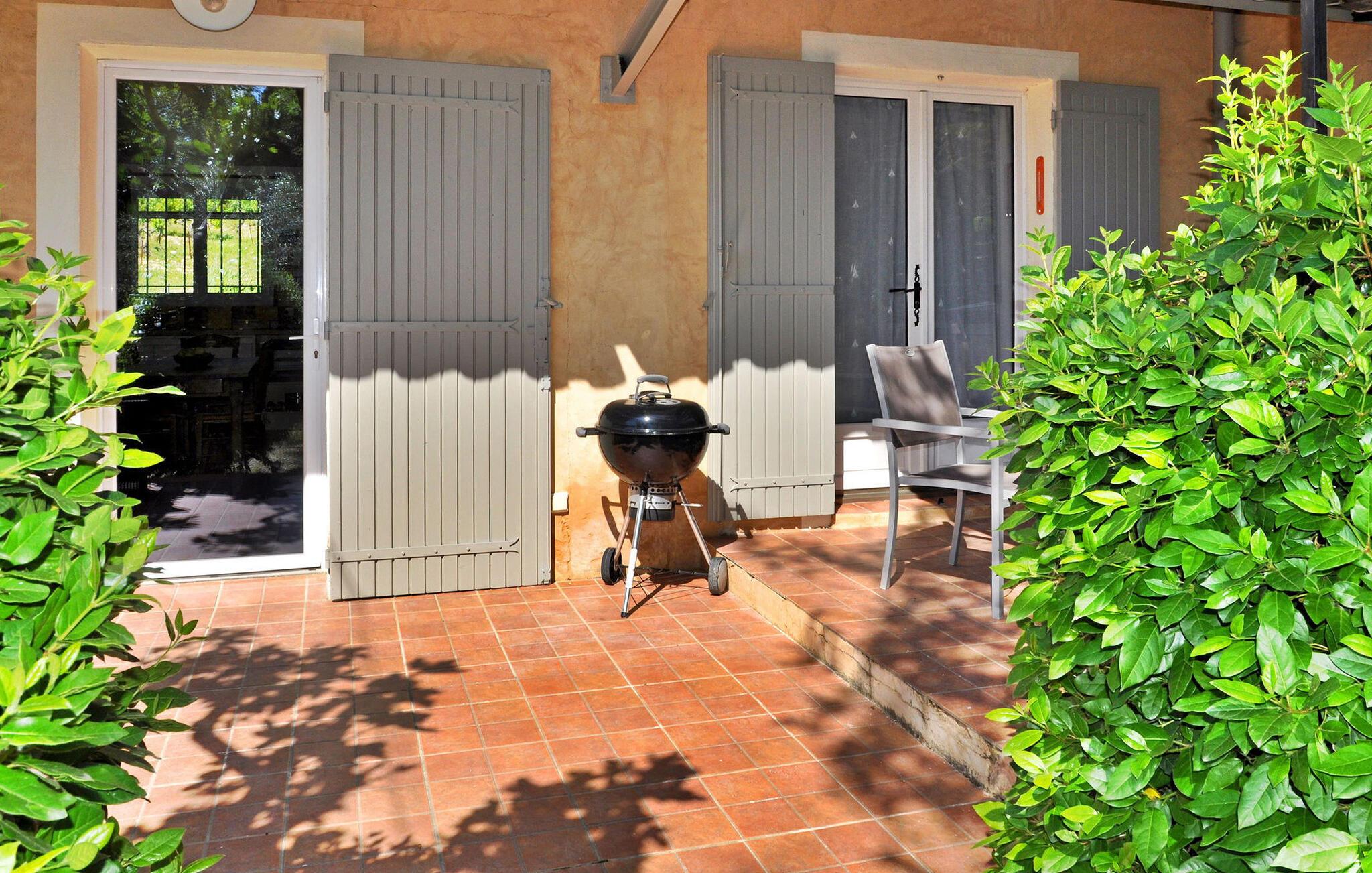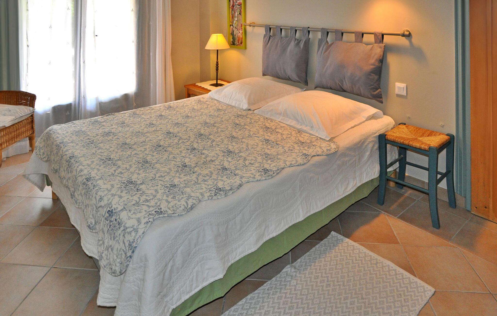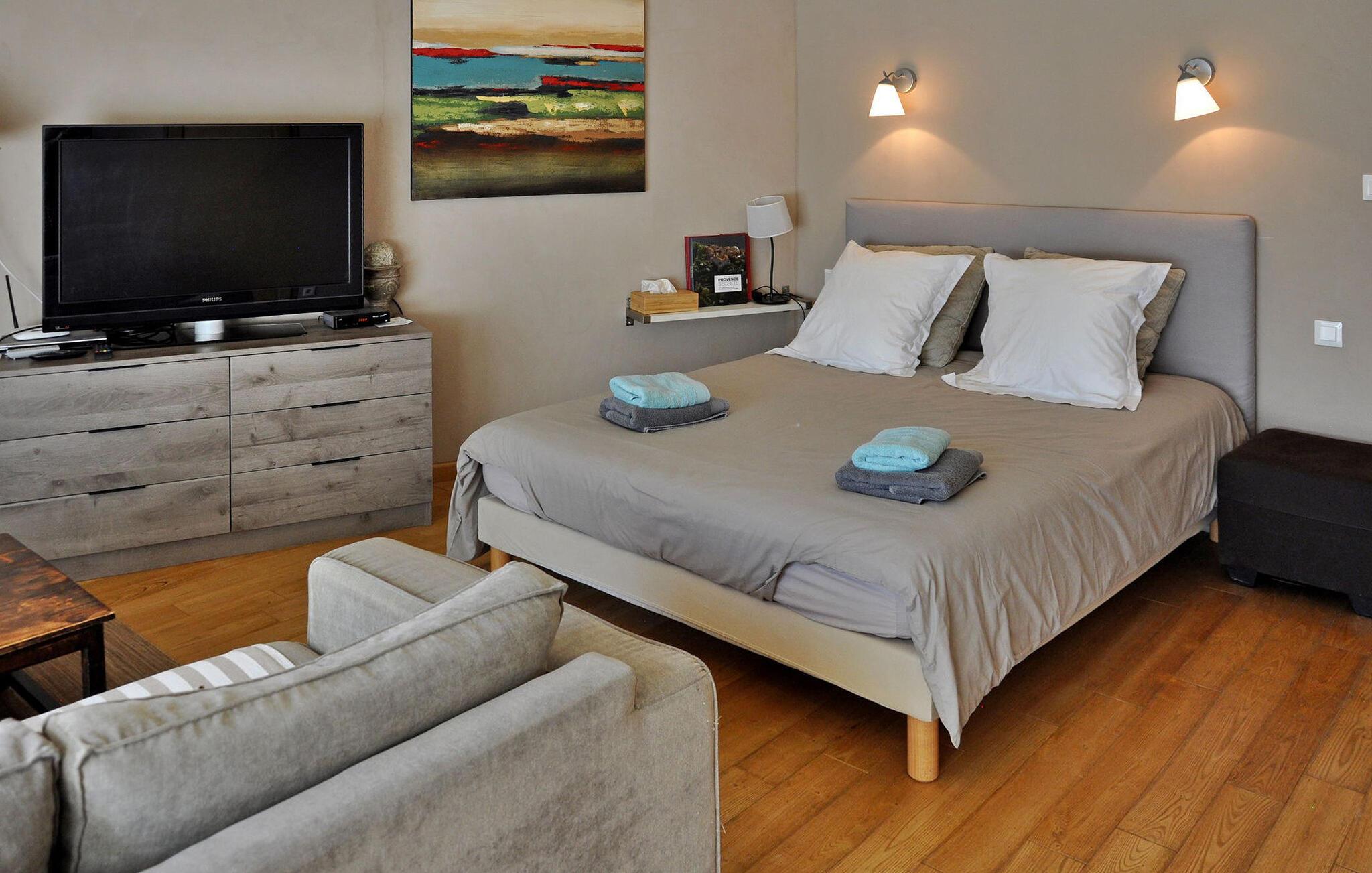 Denne feriebolig i stueetagen i Saint Roman de Malegarde er perfekt til din næste ferie. Beliggende i ejernes ejendom sammen med en anden feriebolig, det er beliggende mellem Vaucluse og Drôme, nær Tulette. Stedet har et hyggeligt køkken og spiseplads med nødvendige faciliteter og franske døre, der åbner ud til en privat terrasse til udendørs spisning. Begge soveværelser har private bruserum. Udendørsområdet omfatter store anlagte grunde til afslappede gåture. Den fælles indhegnede pool (13m x 7m) med liggestole deles med gæster fra den anden udlejning på stedet. Bemærk venligst, at ejendomsejerne bor på stedet i stuehuset, og en venlig hund er en del af deres husstand, hvilket bidrager til omgivelsernes landlige charme. Ejendommen er beliggende på landet, ca. 800 m fra landsbyen Saint Roman de Malegarde. I landsbyen finder du et brøddepot, og for mere shopping skal du til Tulette (4 km). Saint Roman de Malegarde ligger på grænsen mellem Vaucluse og Drôme Provençale mellem Bollène og Vaison la Romaine. Det er et godt udgangspunkt for at udforske de omkringliggende landsbyer og vinmarker i Tulette, Cairanne, Visan, Richerenches, Sainte Cécile les Vignes, samt mange vandrestier, der fører til Aygues-flodens dal.