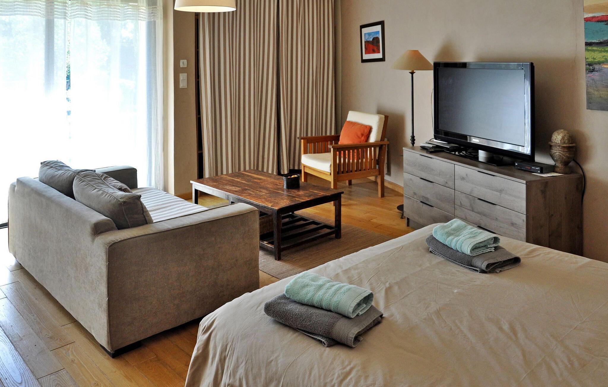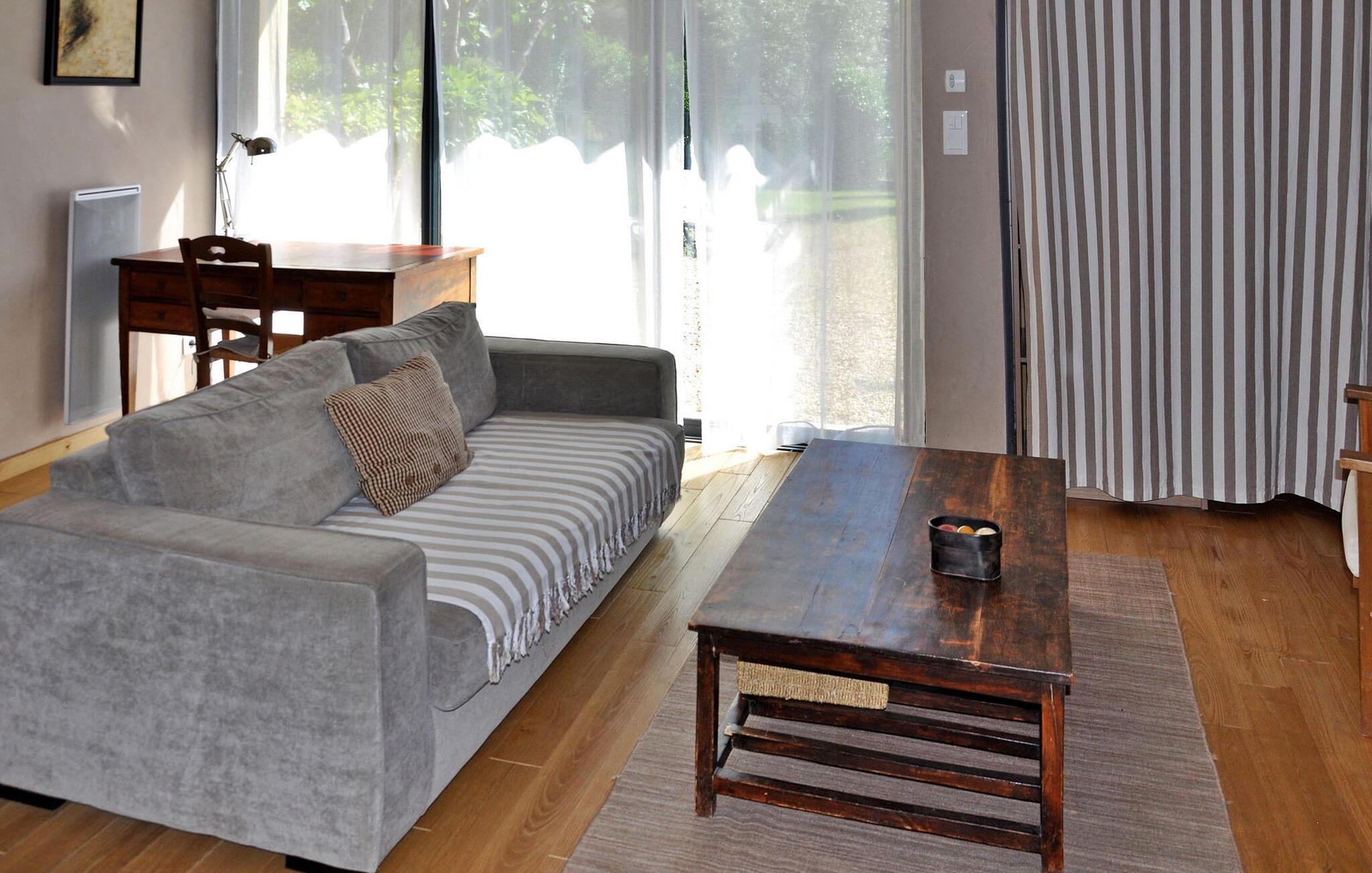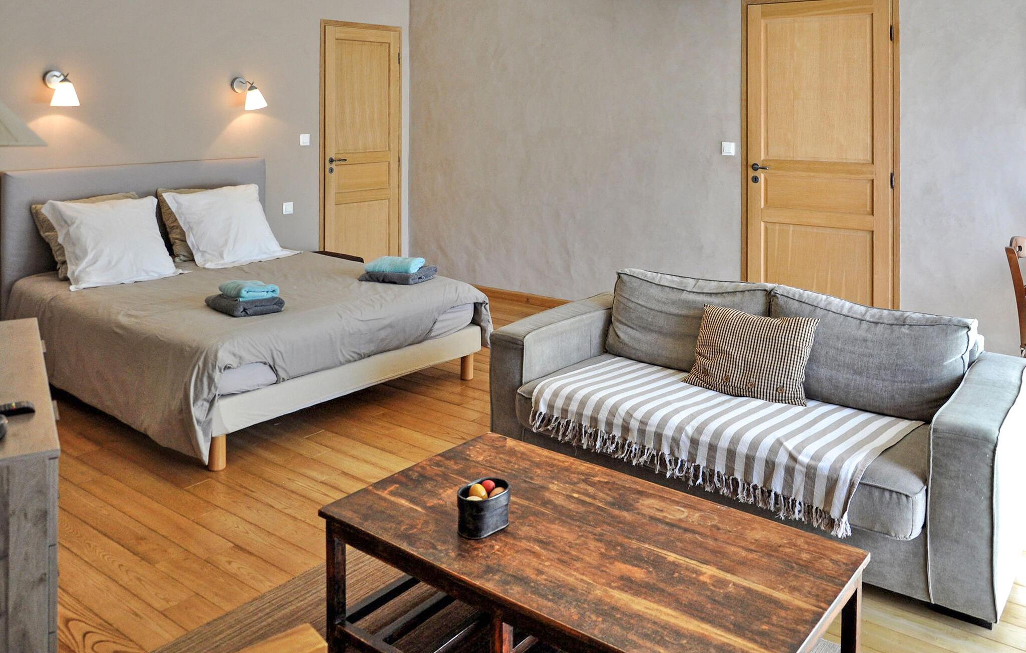 Denne feriebolig i stueetagen i Saint Roman de Malegarde er perfekt til din næste ferie. Beliggende i ejernes ejendom sammen med en anden feriebolig, det er beliggende mellem Vaucluse og Drôme, nær Tulette. Stedet har et hyggeligt køkken og spiseplads med nødvendige faciliteter og franske døre, der åbner ud til en privat terrasse til udendørs spisning. Begge soveværelser har private bruserum. Udendørsområdet omfatter store anlagte grunde til afslappede gåture. Den fælles indhegnede pool (13m x 7m) med liggestole deles med gæster fra den anden udlejning på stedet. Bemærk venligst, at ejendomsejerne bor på stedet i stuehuset, og en venlig hund er en del af deres husstand, hvilket bidrager til omgivelsernes landlige charme. Ejendommen er beliggende på landet, ca. 800 m fra landsbyen Saint Roman de Malegarde. I landsbyen finder du et brøddepot, og for mere shopping skal du til Tulette (4 km). Saint Roman de Malegarde ligger på grænsen mellem Vaucluse og Drôme Provençale mellem Bollène og Vaison la Romaine. Det er et godt udgangspunkt for at udforske de omkringliggende landsbyer og vinmarker i Tulette, Cairanne, Visan, Richerenches, Sainte Cécile les Vignes, samt mange vandrestier, der fører til Aygues-flodens dal.