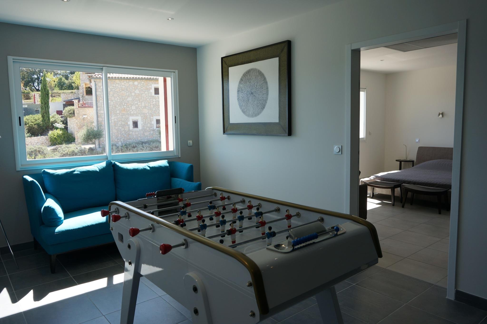 Stueetage: (Stue(pejs), spisestue, Køkken(komfur(Komfur med fire kogeplader, induktion), kaffemaskine(kaffetragt), ovn, mikrobølgeovn, opvaskemaskine , køleskab(amerikansk), fryser), Soveværelse med badeværelse(dobbeltseng(dobbeltdyne, dun, 180 x 200 cm), bruser, 2x håndvask, toilet, klimaanlæg), toilet, pulterkammer(tørretumbler, vaskemaskine), klimaanlæg) På 1. etage: (Soveværelse med badeværelse(dobbeltseng(180 x 200 cm), bruser, 2x håndvask, toilet, klimaanlæg), Soveværelse med badeværelse(køjeseng, bruser, 2x håndvask, toilet, klimaanlæg), Soveværelse med badeværelse(2x enkeltseng(dyne, dun, 90 x 190 cm), bruser, håndvask, toilet, klimaanlæg), Soveværelse med badeværelse(dobbeltseng(dobbeltdyne, dun, 160 x 190 cm), bruser, håndvask, toilet, klimaanlæg), klimaanlæg) Gæsteophold Stueetage: (Køkken(komfur(Komfur med fire kogeplader), ovn, mikrobølgeovn, opvaskemaskine ), stue / spisestue, Soveværelse med badeværelse(dobbeltseng(dobbeltdyne, dun, 140 x 190 cm), bruser, 2x håndvask, toilet), Arbejdsværelse, klimaanlæg) udekøkken, garage(adgang udefra), Fjernsyn, havedøre, patio, terrasse(privat, 120 m2), have(privat, delvist indhegnet, 800 m2), havemøbler, solstole, parkering, liggestole, swimmingpool(privat, indhegnet, 14 x 4 m., opened from May upto and including Oct), petanquebane, bordtennisbord, bordfodbold, barneseng, strygebræt, Pladegrill