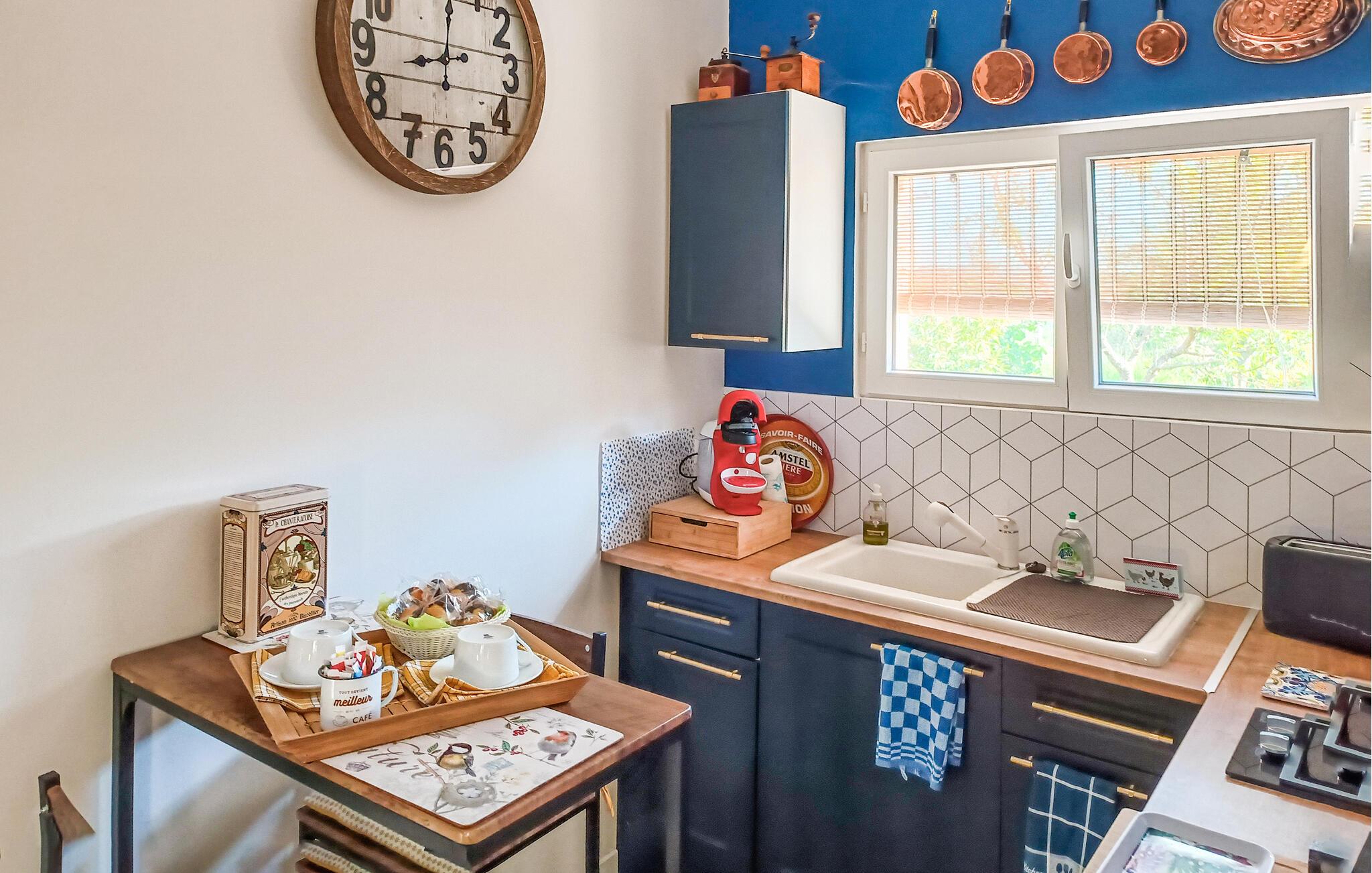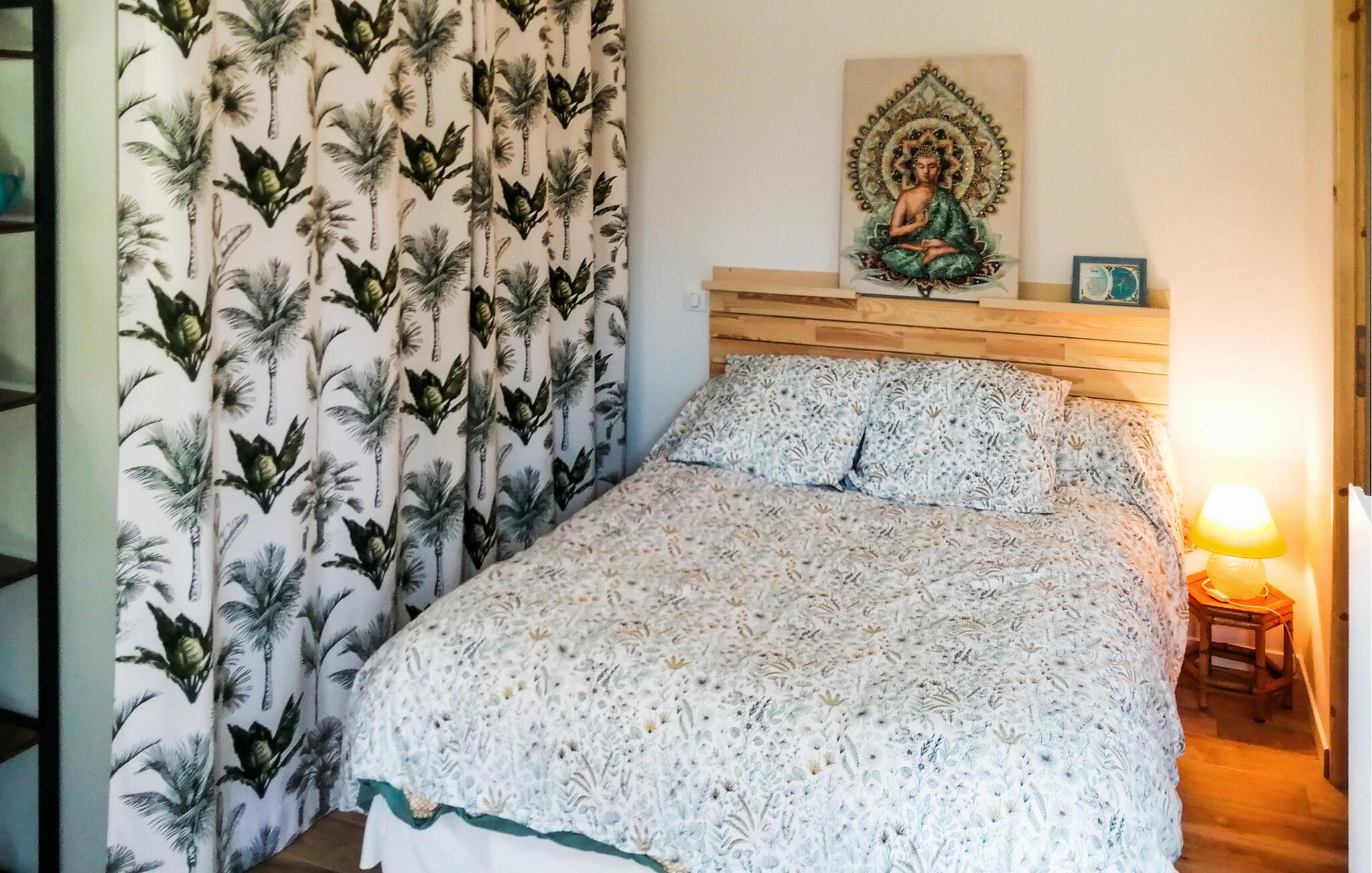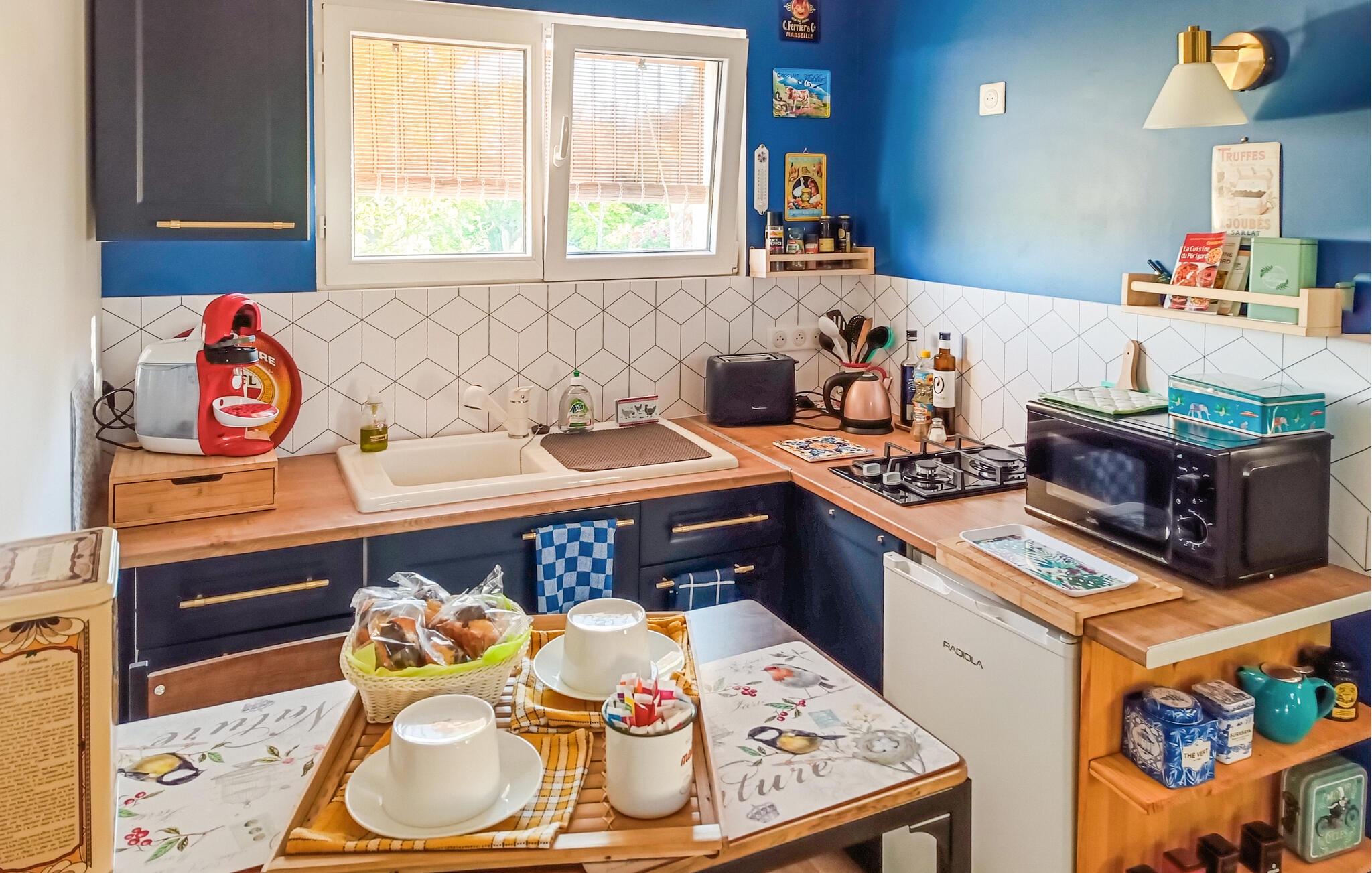 Nyd jeres parferie i denne lille ferieoase tæt på attraktionerne i Périgord Noir. Møblerne er funktionelle og designet med kærlige detaljer, hvilket skaber en varm og intim atmosfære. Find ro i det komfortabelt møblerede interiør og nyd de lyse rum med smagfulde møbler. Sæt jer til rette i siddeområdet, læs en bog eller lyt til musik. Tilbered måltider sammen i det kompakte køkken og server dem ved det lille spisebord.