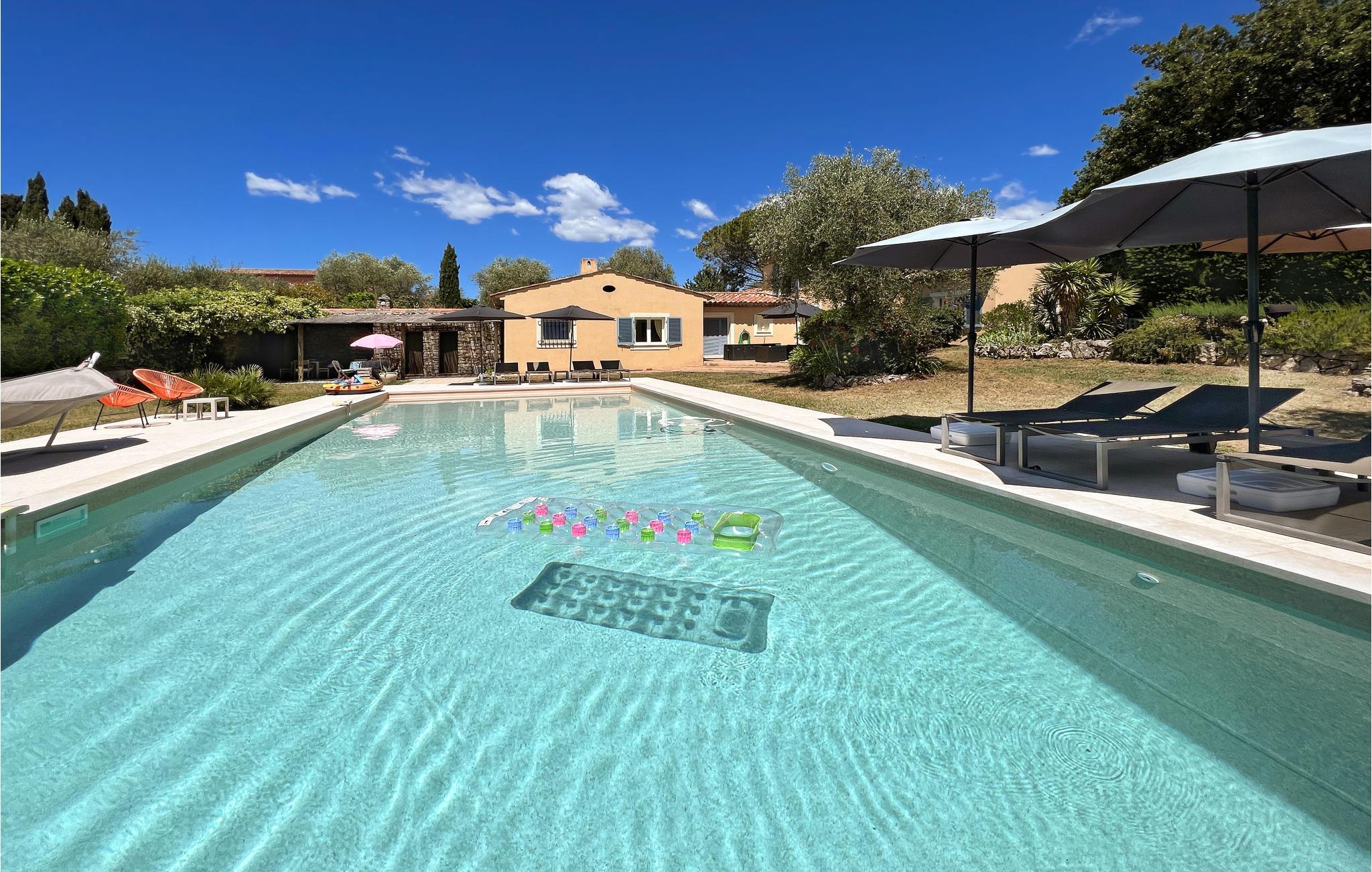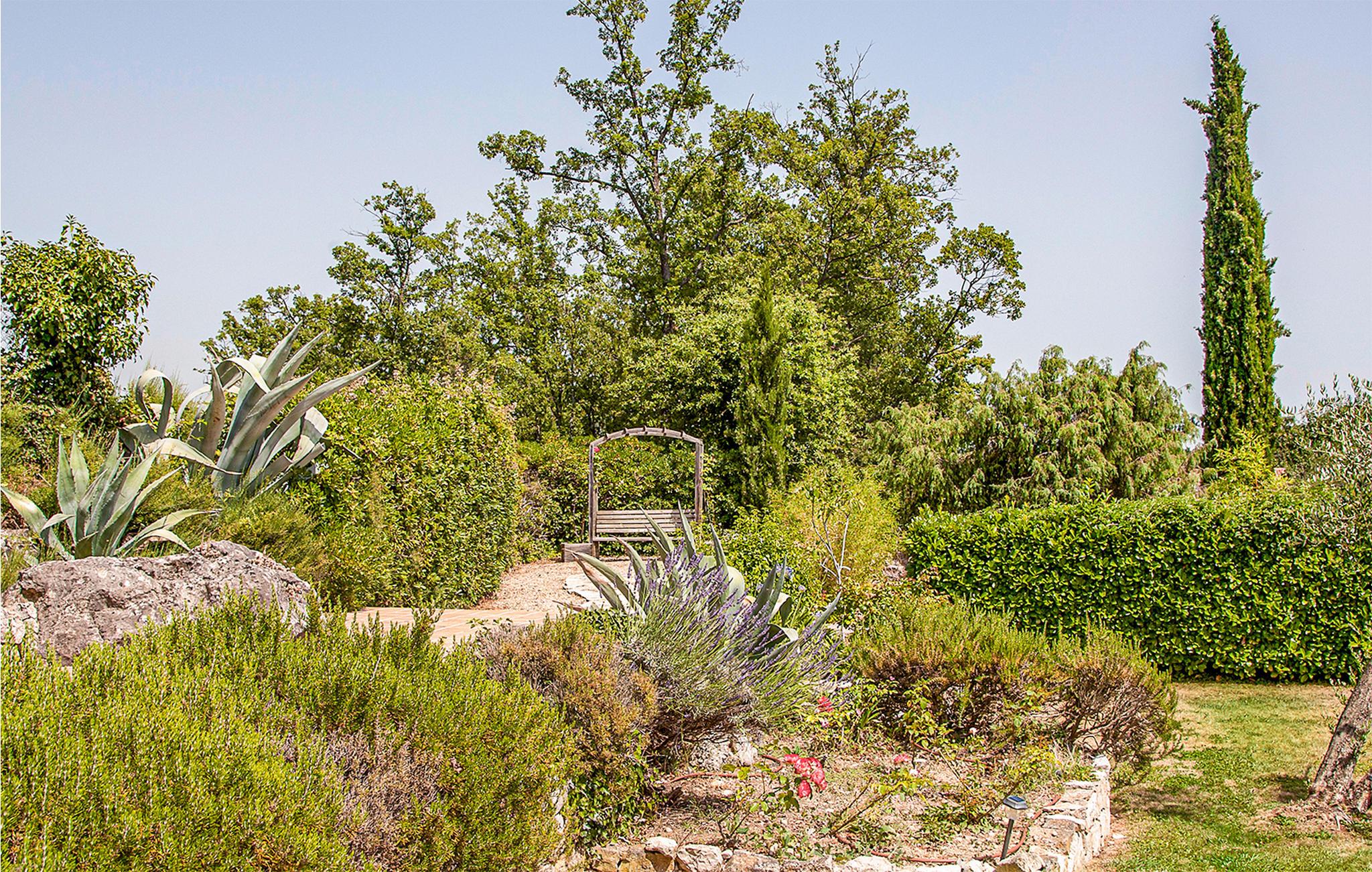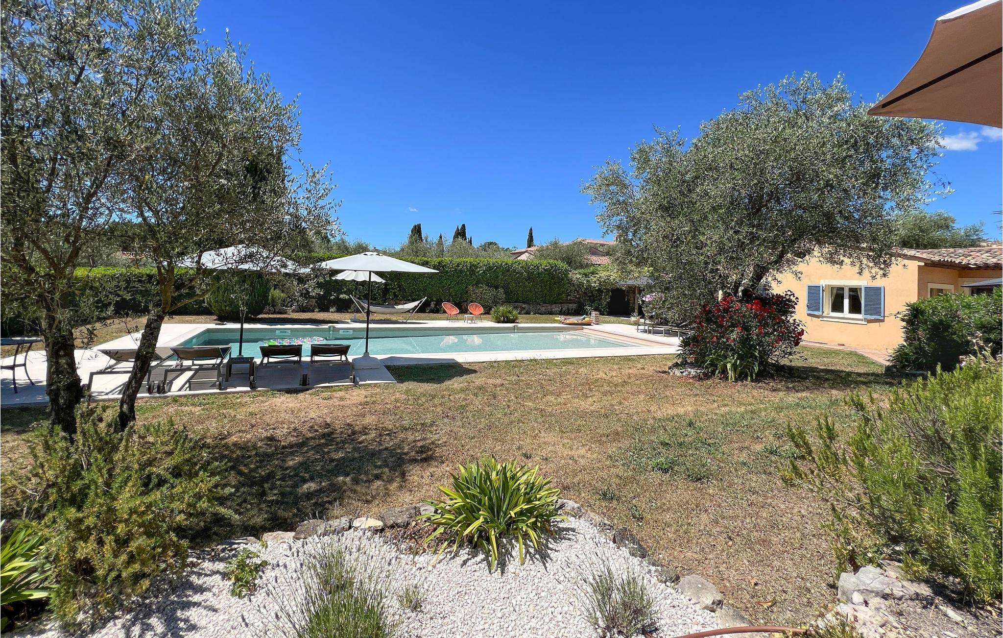En skøn have med plæner, omgiver den forfriskende pool, desuden indbyder flere terrasser til behageligt ophold i solen og den friske luft. Desuden kan I tilberede mad på grillen, der står på en skyggefuld terrasse. Et skakspil i stor størrelse, boulebane og en legeplads til børnene sætter prikken over i’et i dette dejlige hus.