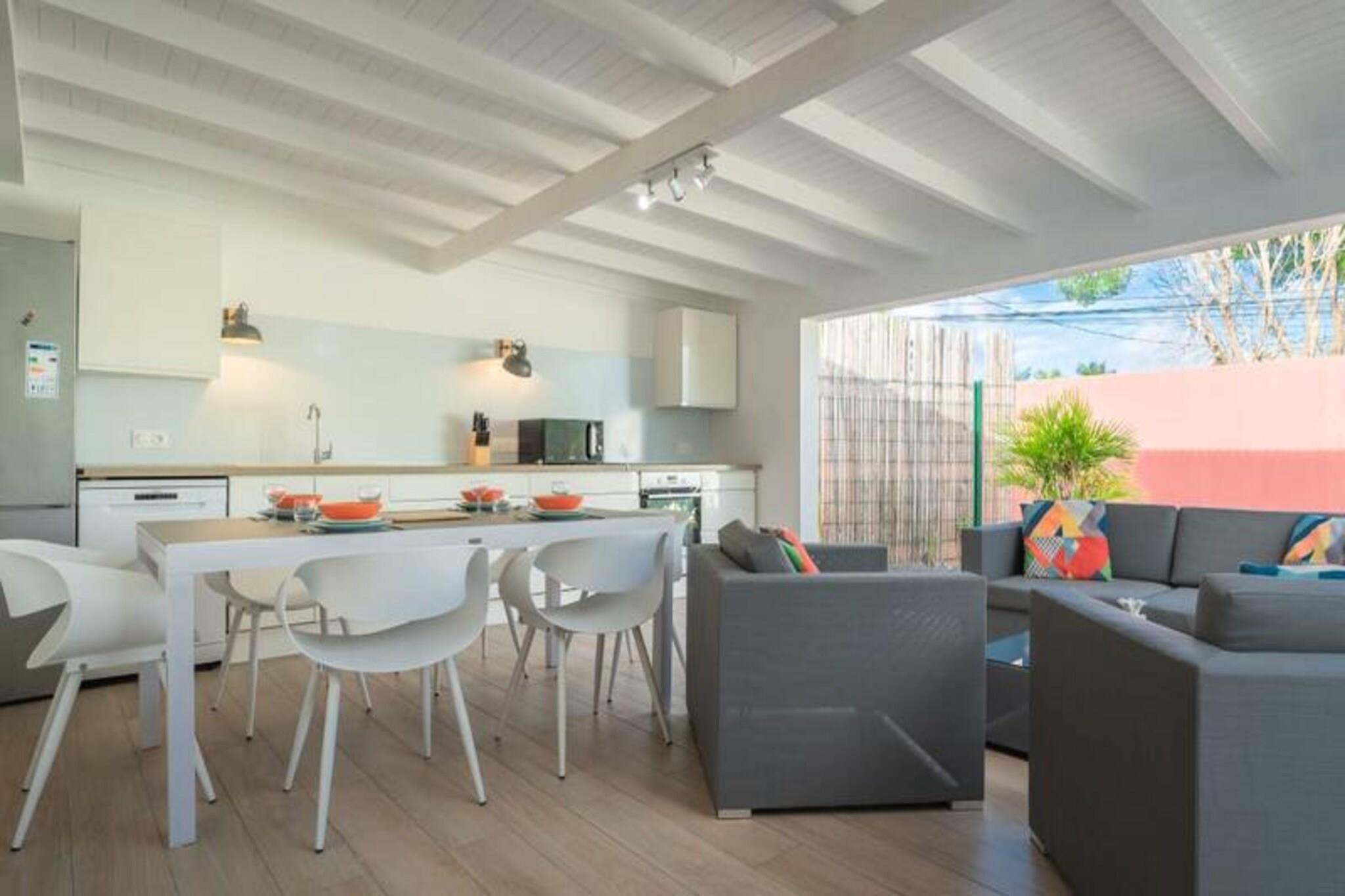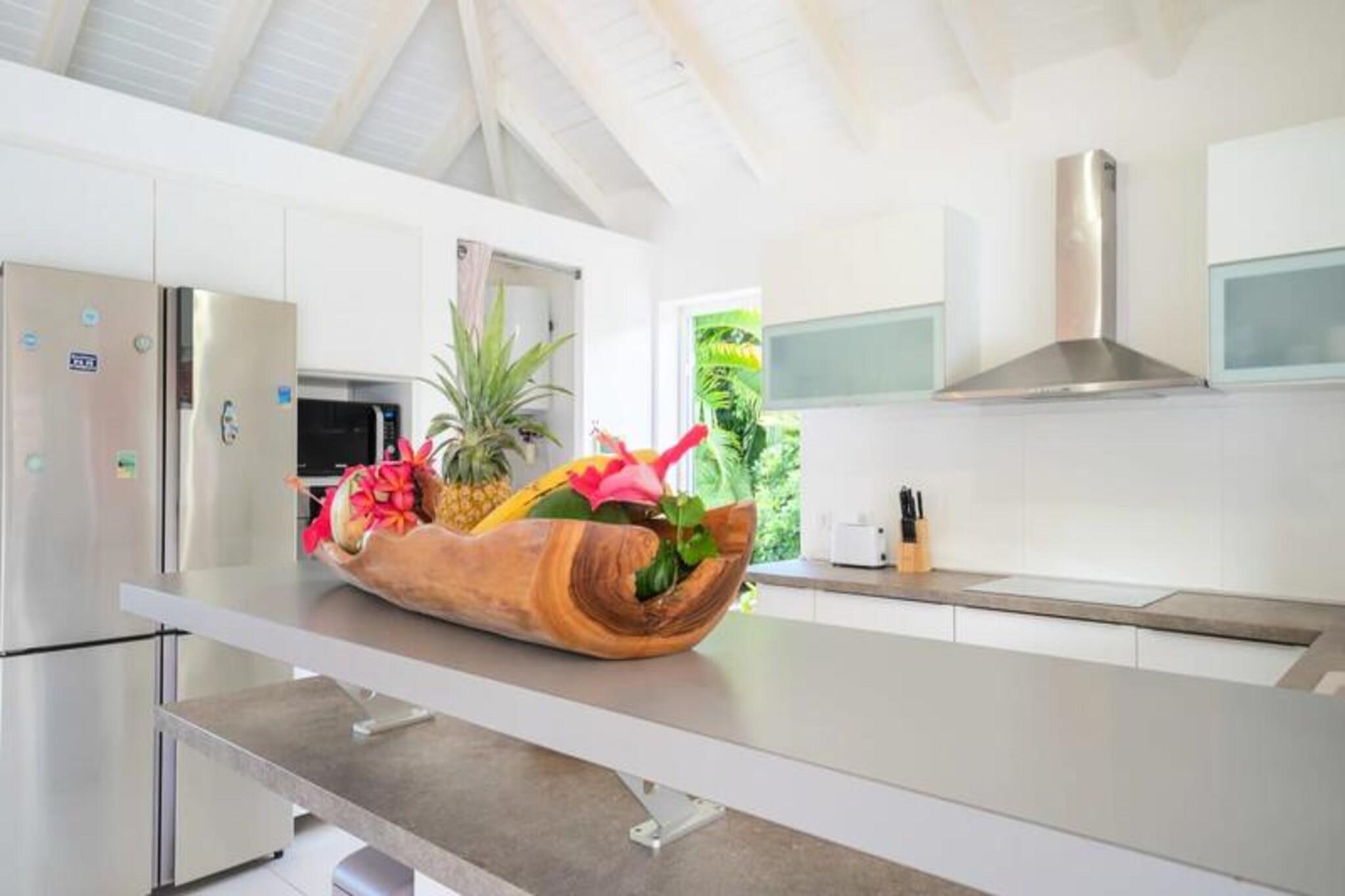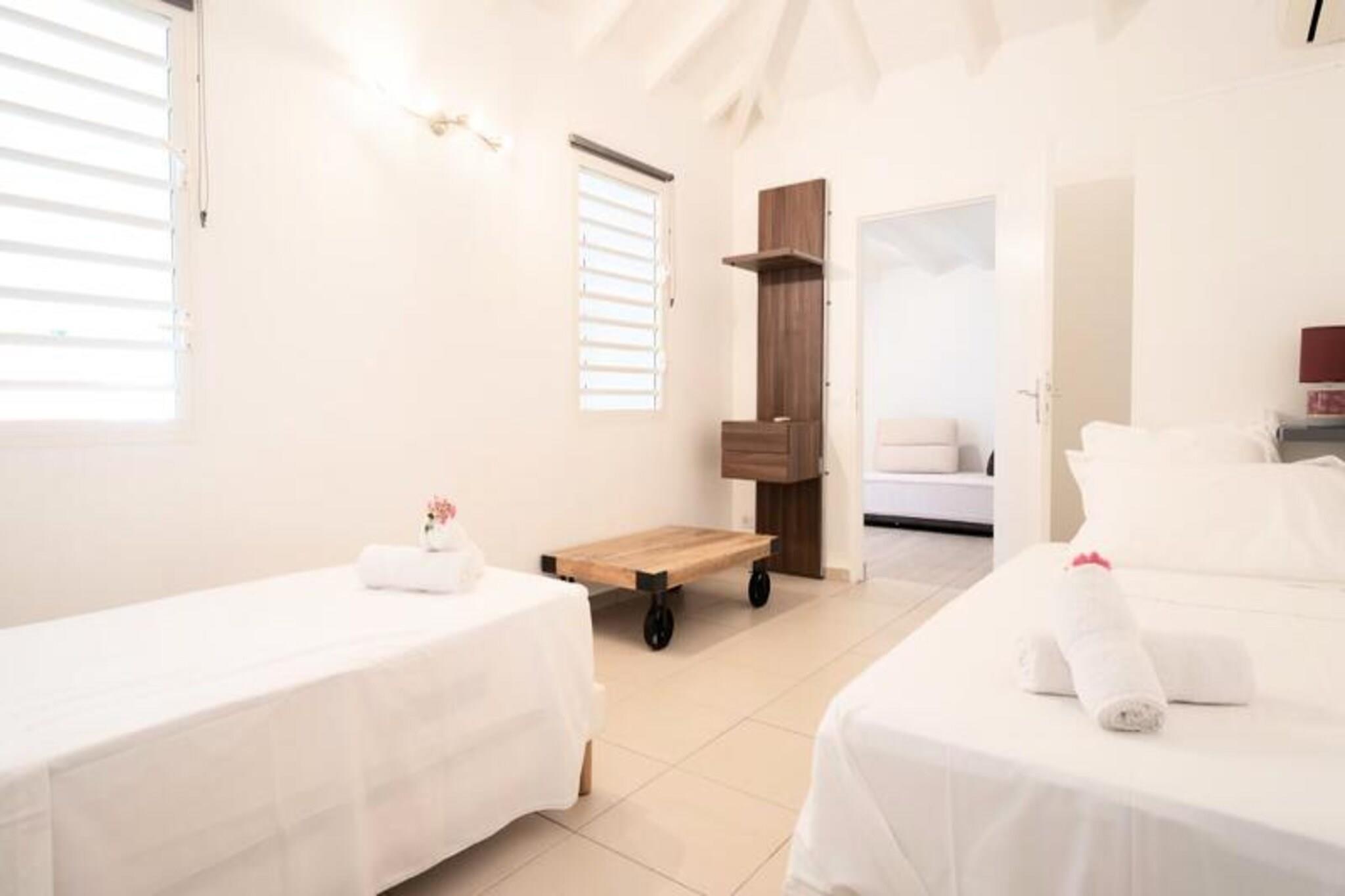 Denne rummelige ejendom best?r af to villaer med stor swimmingpool og kan rumme 12-15 personer. Den f?rste villa omfatter en stor stue med et katedralloft, der ?bner til en terrasse, en stor pool og frodige haver. Det tilbyder fire sovev?relser med aircondition, herunder en mastersuite med en 180 cm seng, p?kl?dningsv?relse, badev?relse og toilet. Den anden villa har et lyst k?kken, et opholdsomr?de og to sovev?relser med aircondition, hver med sit eget private badev?relse. Villaerne er ikke k?ledyrsvenlige, og der kr?ves et depositum p? EURO2500. Denne ejendom er ideelt beliggende i hjertet af Saint-Fran?ois, t?t p? kvalitetsbutikker, restauranter og marinaen. Kun 7 minutter fra golfbanen og 10 minutters k?rsel til en af ??de smukkeste strande p? Guadeloupe, Raisins Clairs. Saint-Annes storsl?ede strande er 15 minutter v?k, og Le Moule er en kort 5-minutters k?rsel. Omr?det er ideelt til vandsport, hvor havnen i Saint-Fran?ois tilbyder surflektioner, og de n?rliggende strande er perfekte til Wing Foil-ture. Villaerne er fuldt udstyret med moderne bekvemmeligheder, herunder aircondition, internetadgang og en saltvandsswimmingpool med alarmsystem for sikkerhed. Hver villa har et fuldt udstyret k?kken, private badev?relser og store terrasser med liggestole. G?sterne kan ogs? nyde concierge-tjenester, en velkomstcocktail og reng?ring f?r og efter deres ophold.