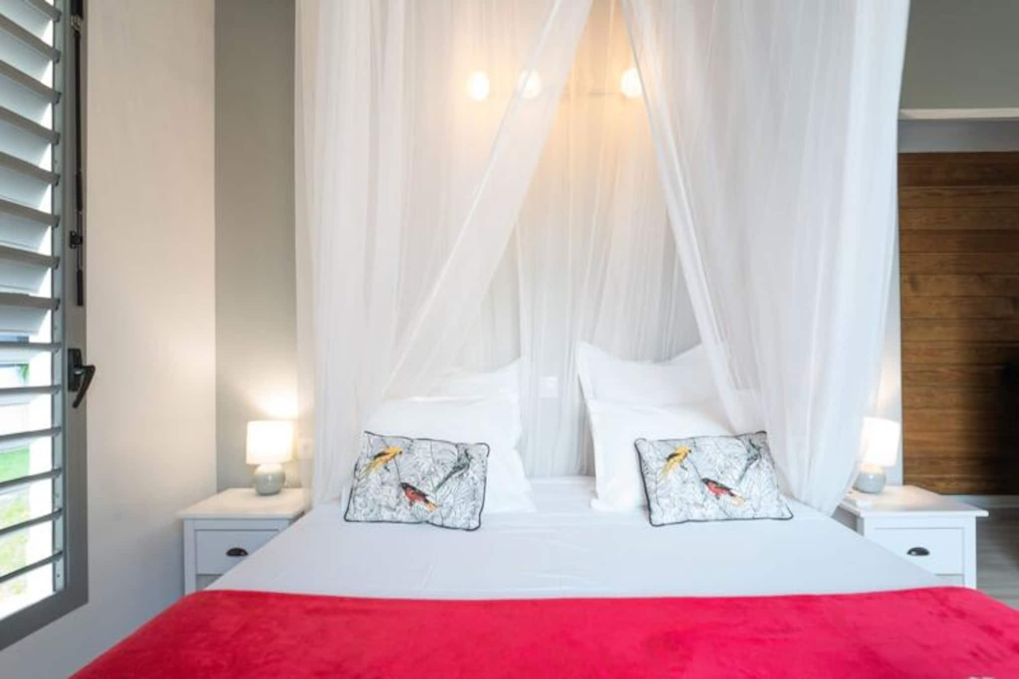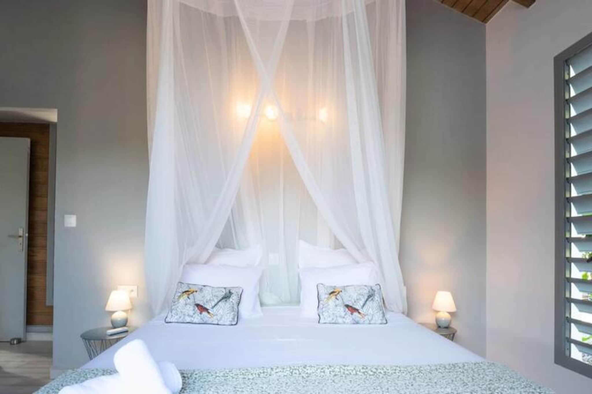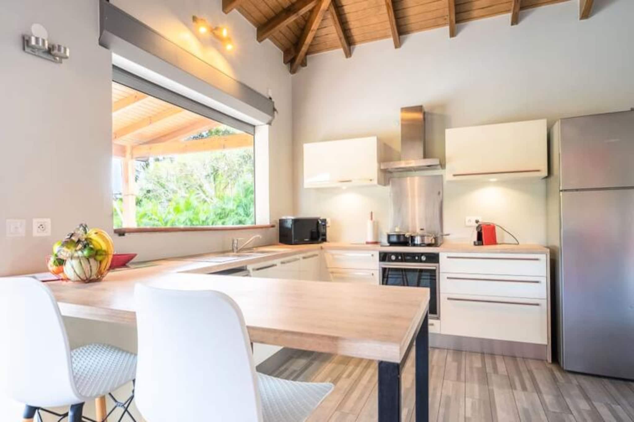 I hjertet af Saint-François, hvor den caribiske sol kysser det turkisblå vand, tilbyder Villa Alysea et idyllisk tilflugtssted for dem, der søger ro og elegance. Omgivet af en frodig tropisk have er denne villa i ét plan en oase af ro, kun få minutter fra de uberørte strande og den pulserende marina i Saint-François. Forestil dig at vågne op til den blide raslen af ??palmer og træde ud til din private pool, en perfekt oase til afslapning. Villaen er designet med traditionel caribisk charme og har to smukt indrettede soveværelser, der begge tilbyder fleksible sovearrangementer med en 180 cm seng og to 90 cm senge, samt to moderne badeværelser. Den åbne opholdsstue udstråler varme og elegance med møbler af høj kvalitet og et fuldt udstyret køkken med dobbeltbar og vinkælder. Hver detalje er omhyggeligt udvalgt for at sikre maksimal komfort for op til fire gæster. Ud over villaen inviterer Saint-François dig til at udforske dens mange skatte. Fra den nærliggende Plage des Raisins Clairs og Anse à la Gourde til den travle marina fyldt med gourmetrestauranter og butikker, er der noget for enhver smag. Golfentusiaster vil sætte pris på den internationale golfbane, der ligger kun få minutter væk, mens vandsportsentusiaster kan dykke ned i aktiviteter som surfing og kitesurfing. Villa Alysea er mere end bare et sted at bo; det er en oplevelse af raffineret caribisk livsstil. Med en dedikeret concierge, der imødekommer alle dine behov, fra udflugter til privat transport, lover dit ophold at blive uforglemmeligt. Lad Guadeloupes charme og komforten i Villa Alysea skabe minder, der vil vare hele livet.