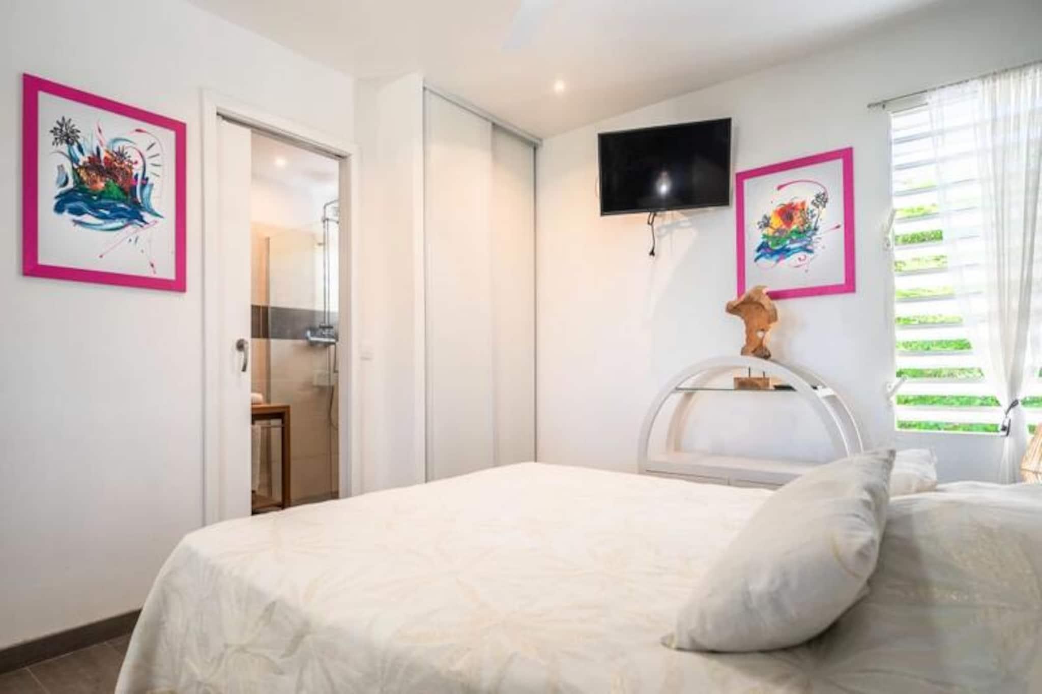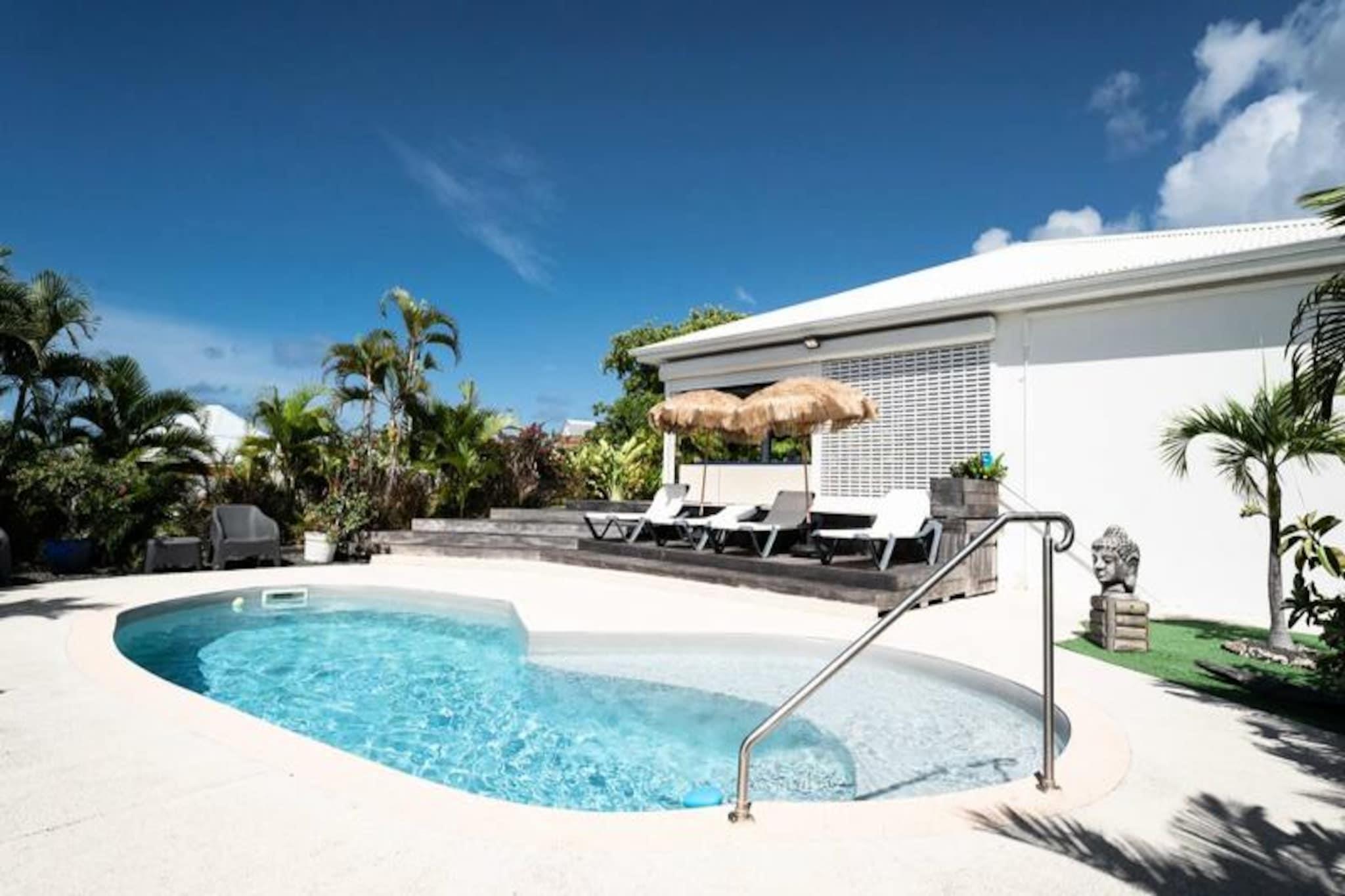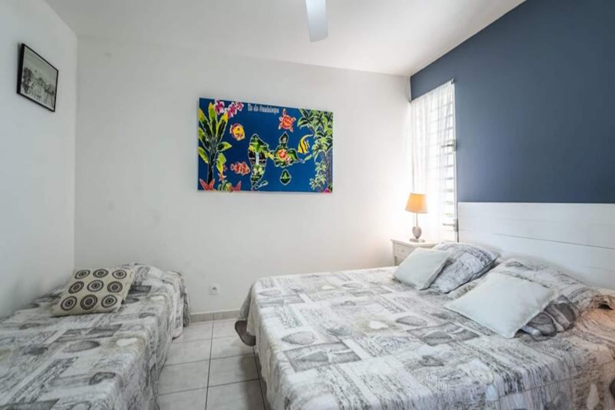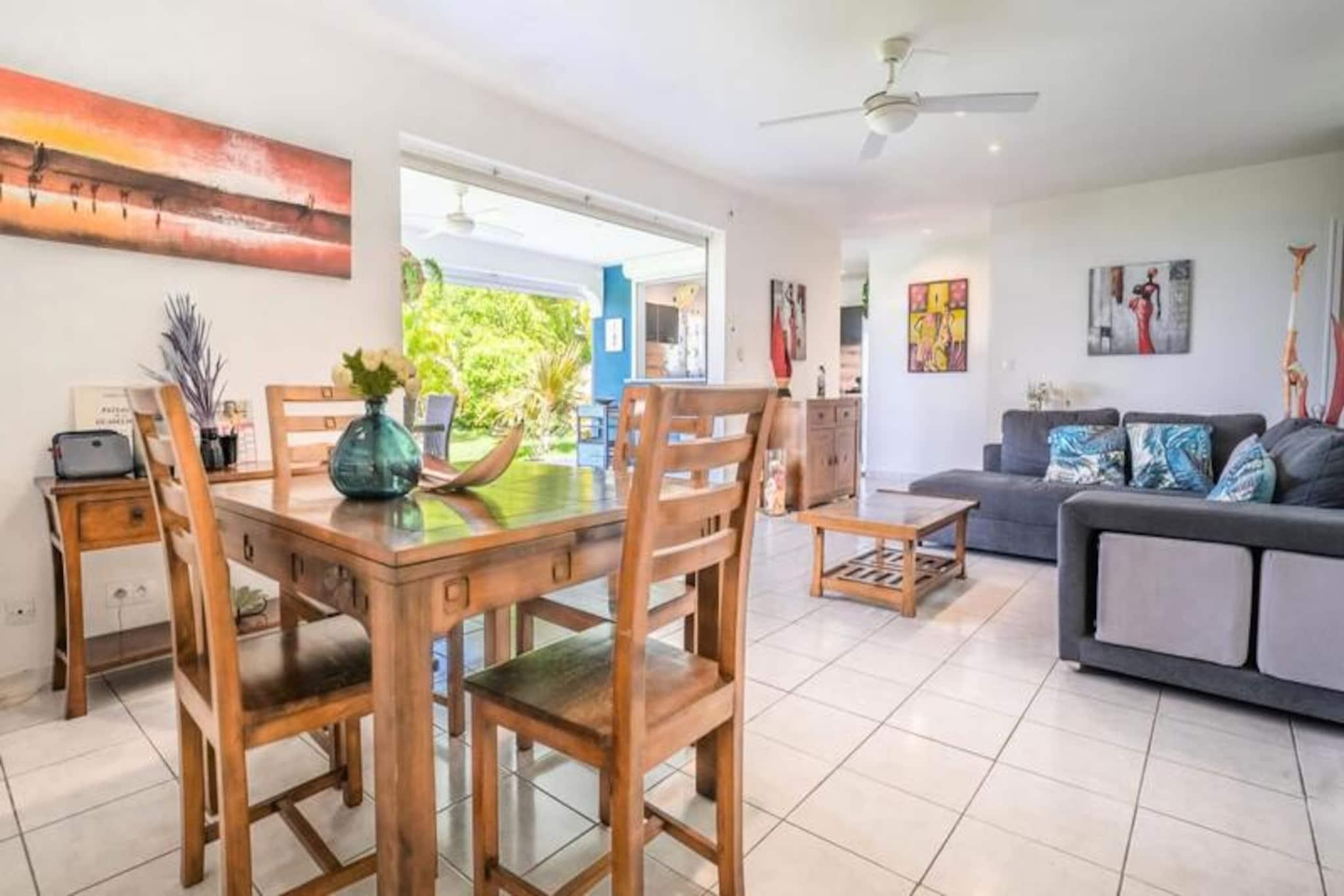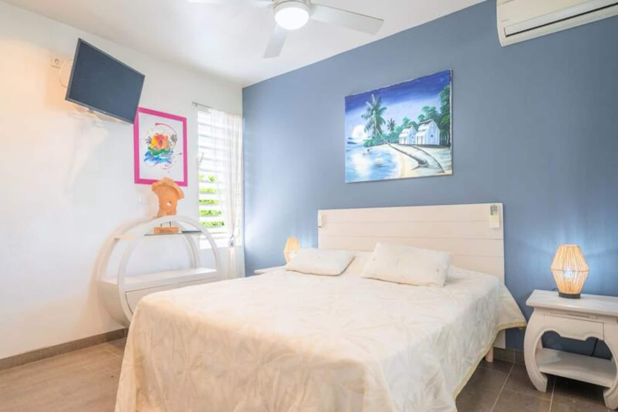 Forestil dig at vågne op til Guadeloupes fredfyldte skønhed, hvor Caribiens turkisblå vand møder Saint-François' frodige landskaber. Villa Belle Vue er dit private fristed med en betagende udsigt over Pointe des Châteaux og Marie-Galantes fjerne silhuet. Dette fredelige tilflugtssted er designet til afslapning og forkælelse, hvor hver eneste detalje er udtænkt for at skabe en uforglemmelig oplevelse. Kun få minutter fra Raisins Clairs-stranden finder du dig selv fordybet i øens naturlige pragt. Denne villa i ét plan strækker sig over et rummeligt areal på 160 m² og er perfekt til op til seks gæster. De tre soveværelser med aircondition, der hver især har bløde senge (160 cm, 160 cm og 140 cm), lover afslappende nætter. De to moderne badeværelser tilføjer et strejf af luksus, mens det fuldt udstyrede køkken med ovn, mikrobølgeovn, køleskab og ismaskine er en kulinarisk entusiasts drøm. Gå udenfor til din private swimmingpool, omgivet af en stenterrasse, og lad den blide caribiske brise skylle hen over dig, mens du slapper af med stil. Villa Belle Vues beliggenhed er simpelthen uovertruffen. Kun to minutters kørsel fra den uberørte sandstrand Raisins Clairs og fem minutter fra den pulserende Saint-François Marina har du adgang til restauranter, butikker og den internationale golfbane. Udforsk det lokale fiskemarked, nyd friskbagte kager fra nærliggende bagerier, eller tag en kort køretur til Pointe des Châteaux for at nyde panoramaudsigten over La Désirade-øen. Uanset om du søger eventyr eller ro, placerer denne villa dig i hjertet af det hele. Med Wi-Fi, aircondition og rengøring i hotelkvalitet er din komfort garanteret. Villaen har også et vandreservesystem, der sikrer uafbrudt bekvemmelighed. Ved ankomsten kan du nyde en forfriskende cocktail og den opmærksomme service fra din personlige concierge, der er klar til at hjælpe med udflugter, billeje og meget mere. Villa Belle Vue er mere end en destination - det er en invitation til at opleve Guadeloupes magi. Lad din drømmeferie begynde her.