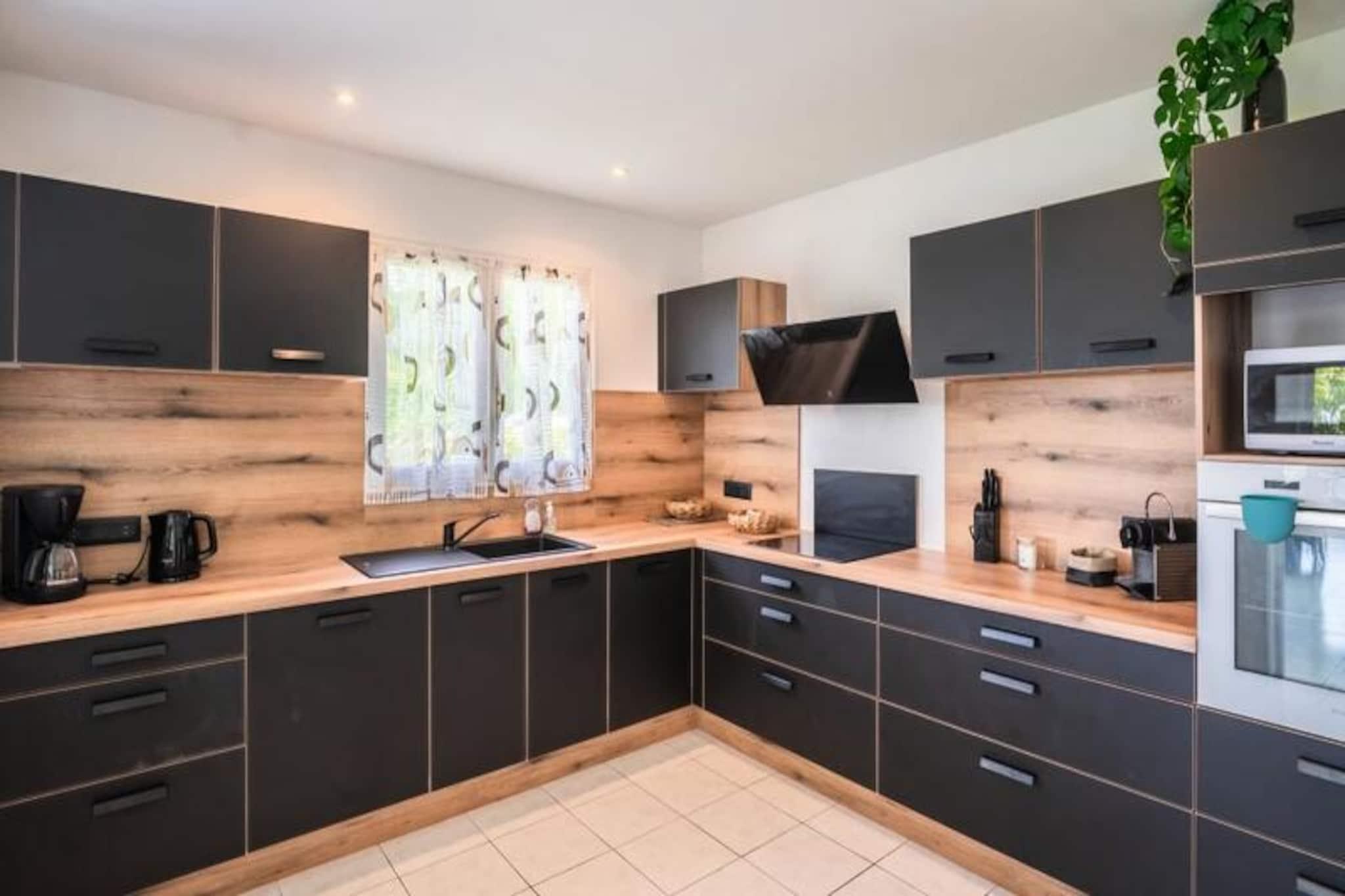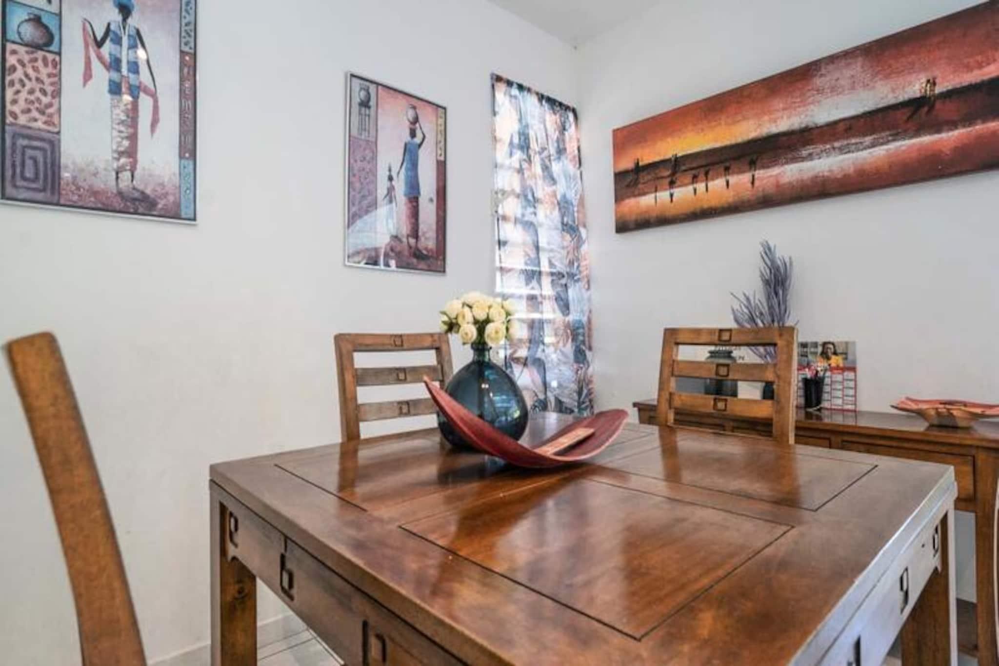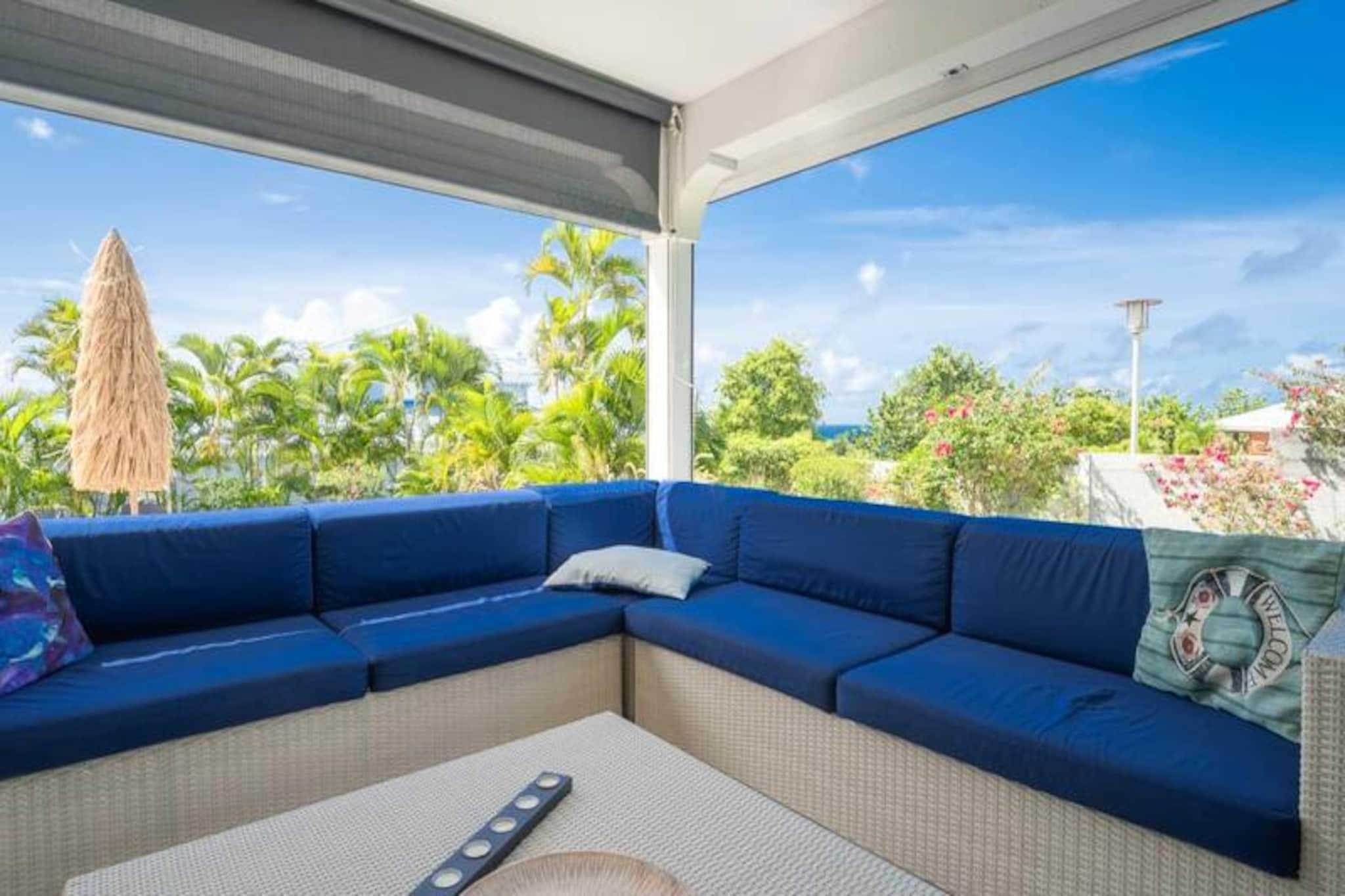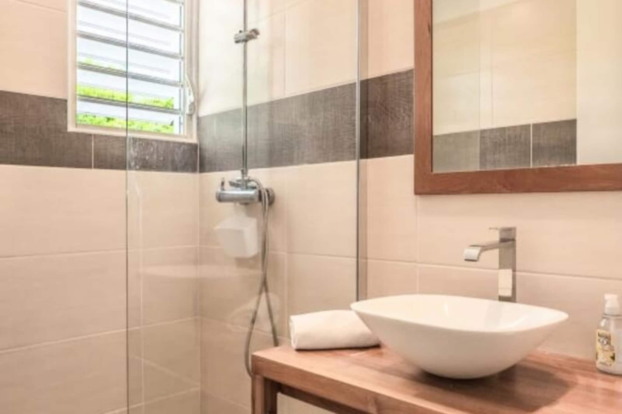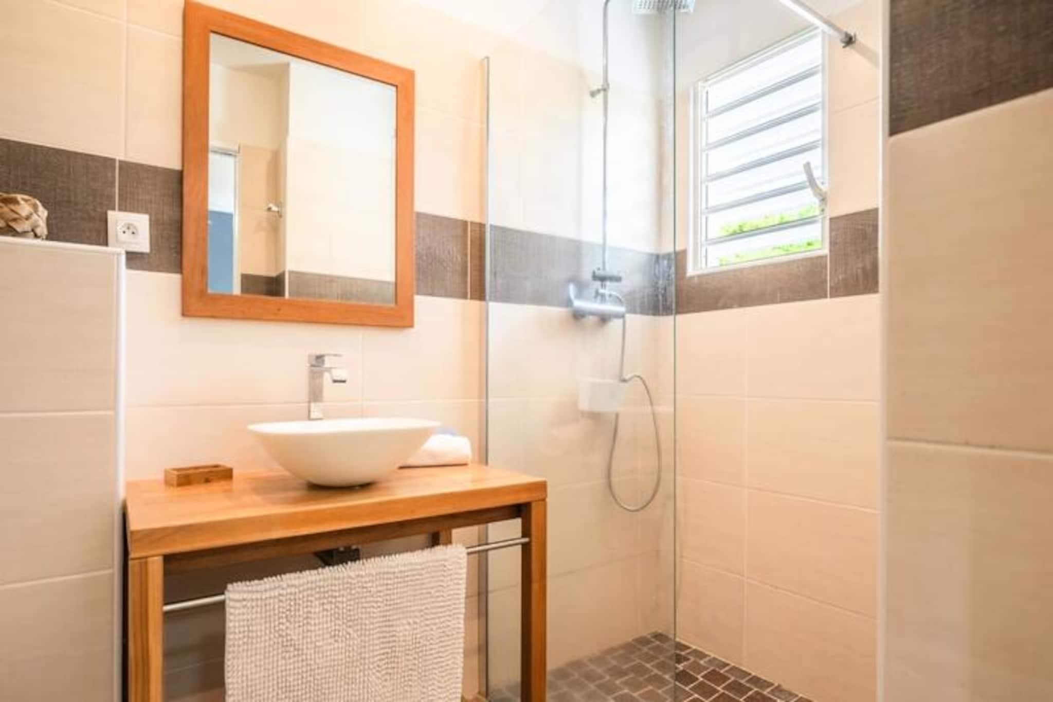 Forestil dig at vågne op til Guadeloupes fredfyldte skønhed, hvor Caribiens turkisblå vand møder Saint-François' frodige landskaber. Villa Belle Vue er dit private fristed med en betagende udsigt over Pointe des Châteaux og Marie-Galantes fjerne silhuet. Dette fredelige tilflugtssted er designet til afslapning og forkælelse, hvor hver eneste detalje er udtænkt for at skabe en uforglemmelig oplevelse. Kun få minutter fra Raisins Clairs-stranden finder du dig selv fordybet i øens naturlige pragt. Denne villa i ét plan strækker sig over et rummeligt areal på 160 m² og er perfekt til op til seks gæster. De tre soveværelser med aircondition, der hver især har bløde senge (160 cm, 160 cm og 140 cm), lover afslappende nætter. De to moderne badeværelser tilføjer et strejf af luksus, mens det fuldt udstyrede køkken med ovn, mikrobølgeovn, køleskab og ismaskine er en kulinarisk entusiasts drøm. Gå udenfor til din private swimmingpool, omgivet af en stenterrasse, og lad den blide caribiske brise skylle hen over dig, mens du slapper af med stil. Villa Belle Vues beliggenhed er simpelthen uovertruffen. Kun to minutters kørsel fra den uberørte sandstrand Raisins Clairs og fem minutter fra den pulserende Saint-François Marina har du adgang til restauranter, butikker og den internationale golfbane. Udforsk det lokale fiskemarked, nyd friskbagte kager fra nærliggende bagerier, eller tag en kort køretur til Pointe des Châteaux for at nyde panoramaudsigten over La Désirade-øen. Uanset om du søger eventyr eller ro, placerer denne villa dig i hjertet af det hele. Med Wi-Fi, aircondition og rengøring i hotelkvalitet er din komfort garanteret. Villaen har også et vandreservesystem, der sikrer uafbrudt bekvemmelighed. Ved ankomsten kan du nyde en forfriskende cocktail og den opmærksomme service fra din personlige concierge, der er klar til at hjælpe med udflugter, billeje og meget mere. Villa Belle Vue er mere end en destination - det er en invitation til at opleve Guadeloupes magi. Lad din drømmeferie begynde her.