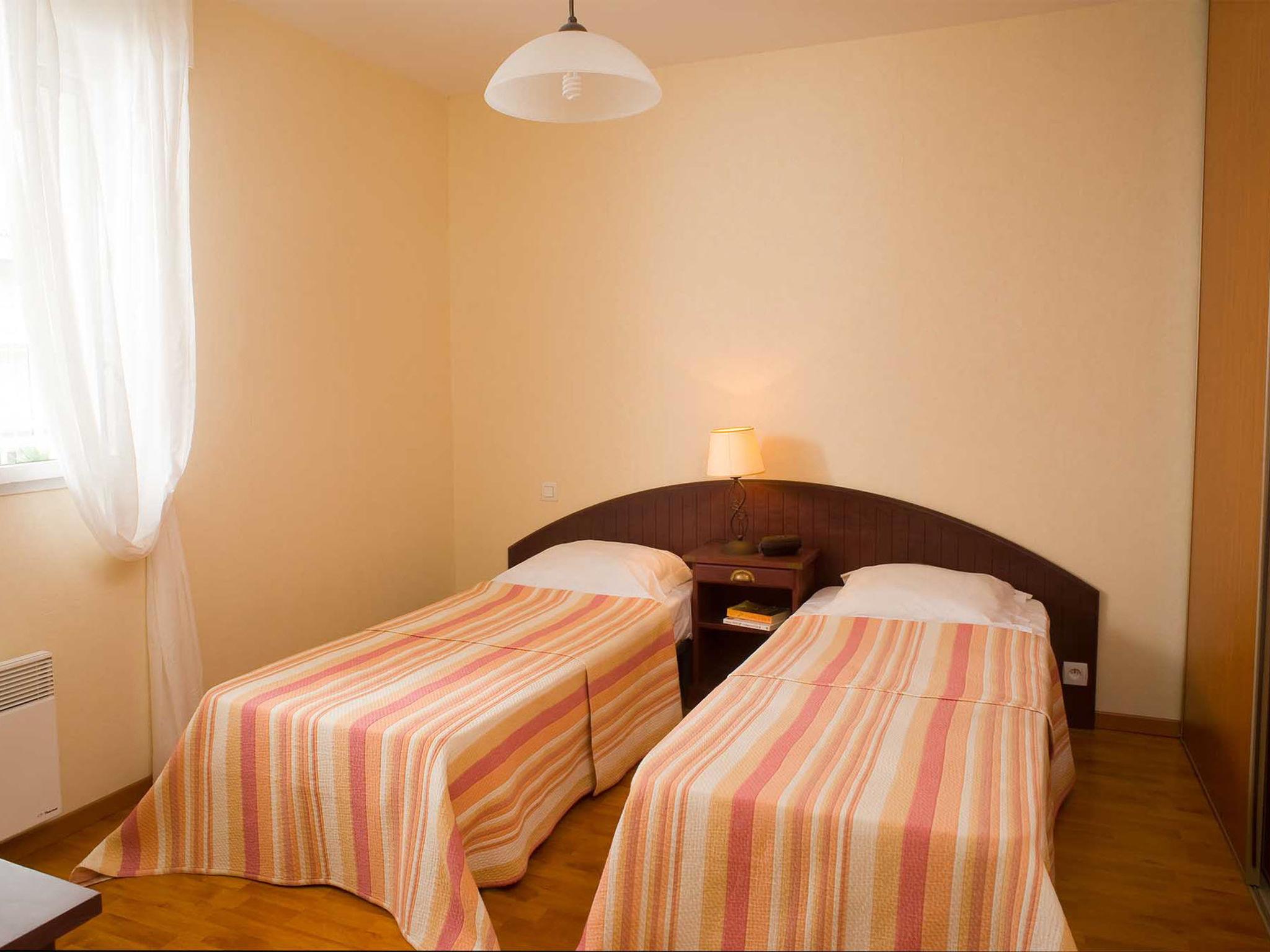 "Le Domaine de Fontenelles", 3-room apartment 60 m2. Bright, practical and beautiful furnishings: living/sleeping room with 1 double sofabed, dining table and TV can be hired. Exit to the balcony. 2 rooms, each room with 2 sleeping facilities. Kitchenette (4 hot plates, oven, dishwasher, toaster, kettle, electric coffee machine). Bathroom, sep. WC. Electric heating. Balcony or terrace. Terrace furniture, balcony furniture. Please note: non-smokers only. Maximum 2 pets/ dogs allowed. Smoke alarm, fire extinguisher.