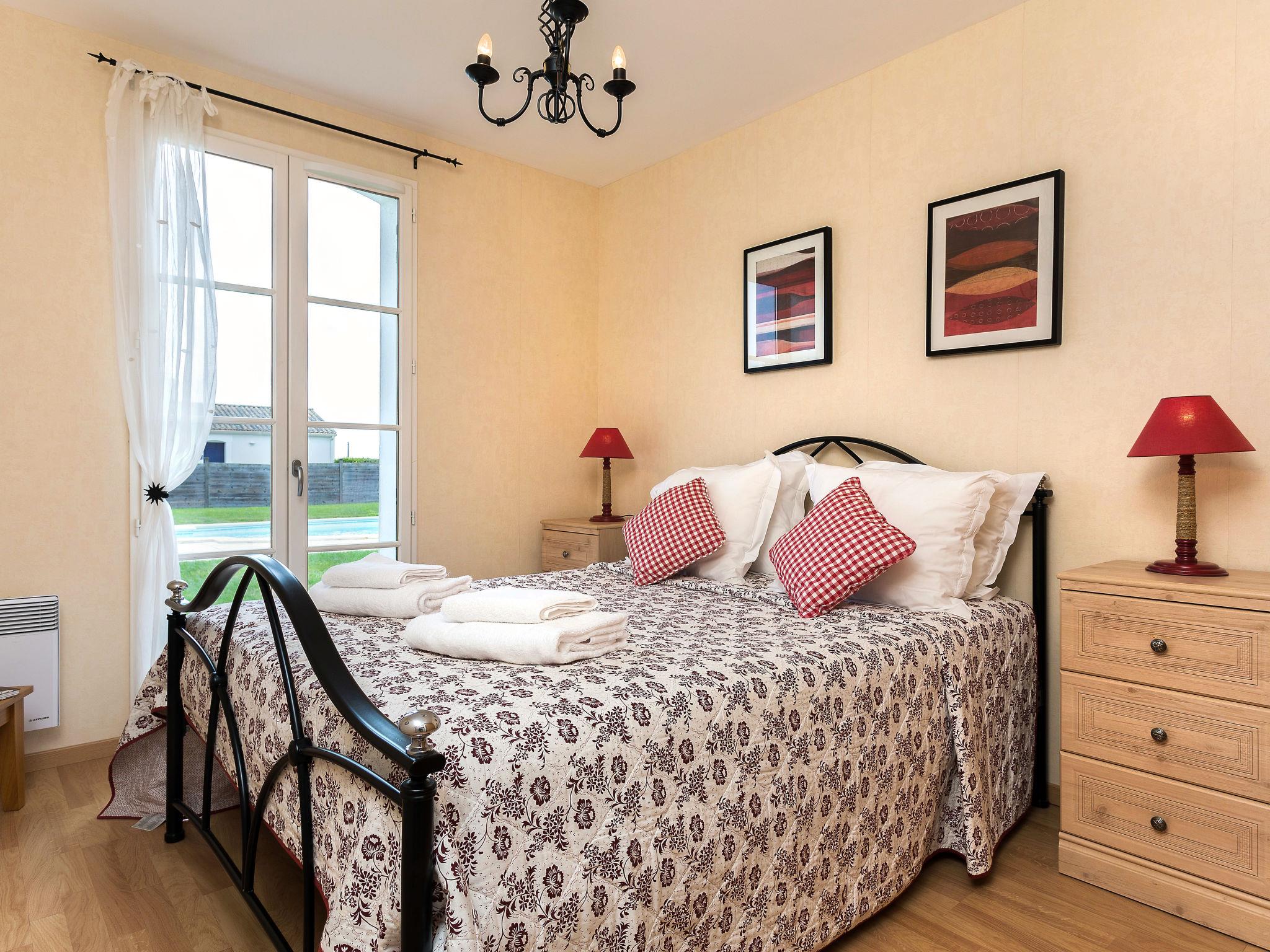 "Le Domaine de Fontenelles", 4-room villa 86 m2. Bright, beautiful furnishings: living/dining room with dining table and TV. Exit to the terrace. 3 rooms, each room with 2 sleeping facilities. Kitchenette (4 hot plates, oven, dishwasher, toaster, kettle, freezer, electric coffee machine). Bathroom, shower/WC, sep. WC. Electric heating. Terrace, garden, lawn. Terrace furniture. Please note: non-smoking house. Maximum 2 pets/ dogs allowed. Smoke alarm. Private pool (7 x 4 m, 15.05.-15.09.). The house can also be on 2 floors.