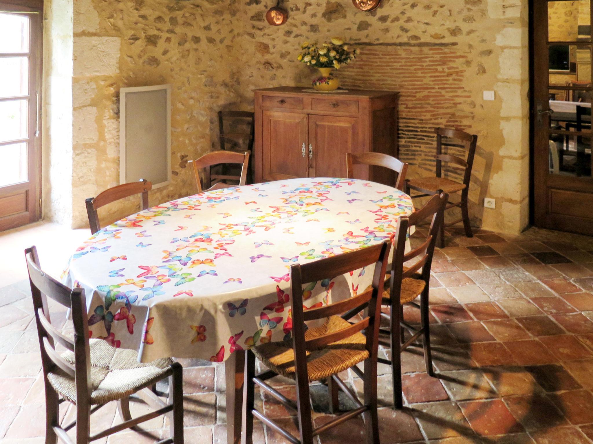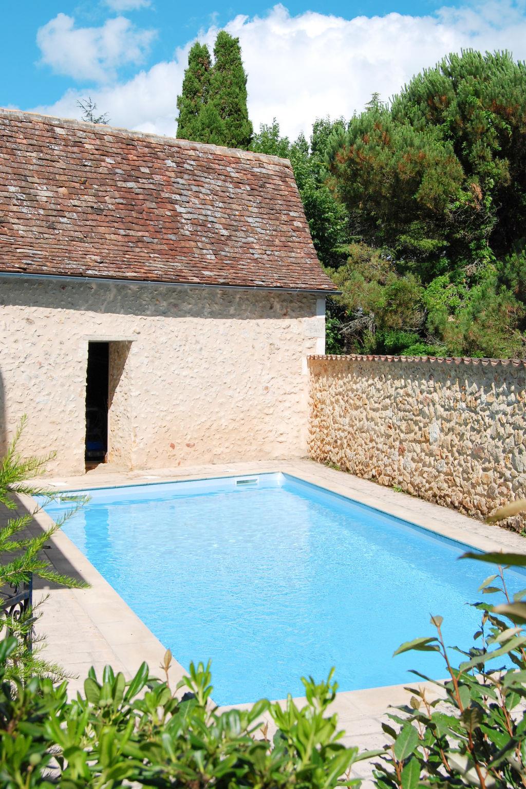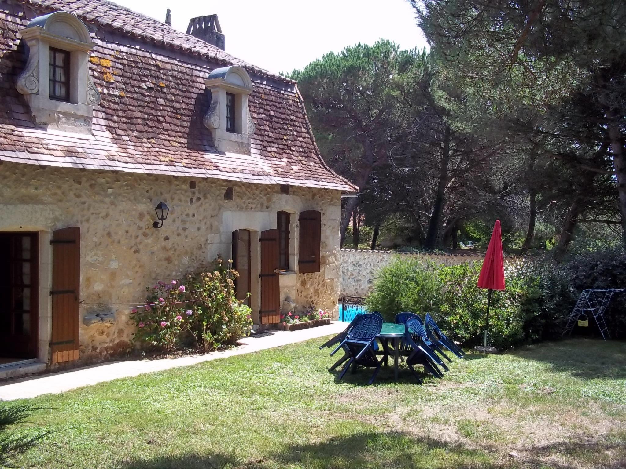 Rustic country house "La Borie", from the 17th century. In the hamlet La Borie 2.5 km from the centre of Saint Jean d'Estissac, 5.5 km from the centre of Villamblard, 25 km from the centre of Bergerac, in a quiet position, 23 km from the lake. Private: natural state property 5'000 m2 (fenced) with wildlife garden and trees, lawn for sunbathing, swimming pool fenced (8 x 5 m, depth 160 cm, seasonal availability: 15.May. - 30.Sep.). Pool maintenance by the owner/gardener. In the house: storage room for bicycles. Parking (for 3 cars) at the house on the premises. Shop 5.5 km, supermarket 5.5 km, bus stop "Douville-Pont Saint Mamet" 12 km, bathing lake "Lac de Neufont" 23 km. Nearby attractions: Périgueux 35 km.