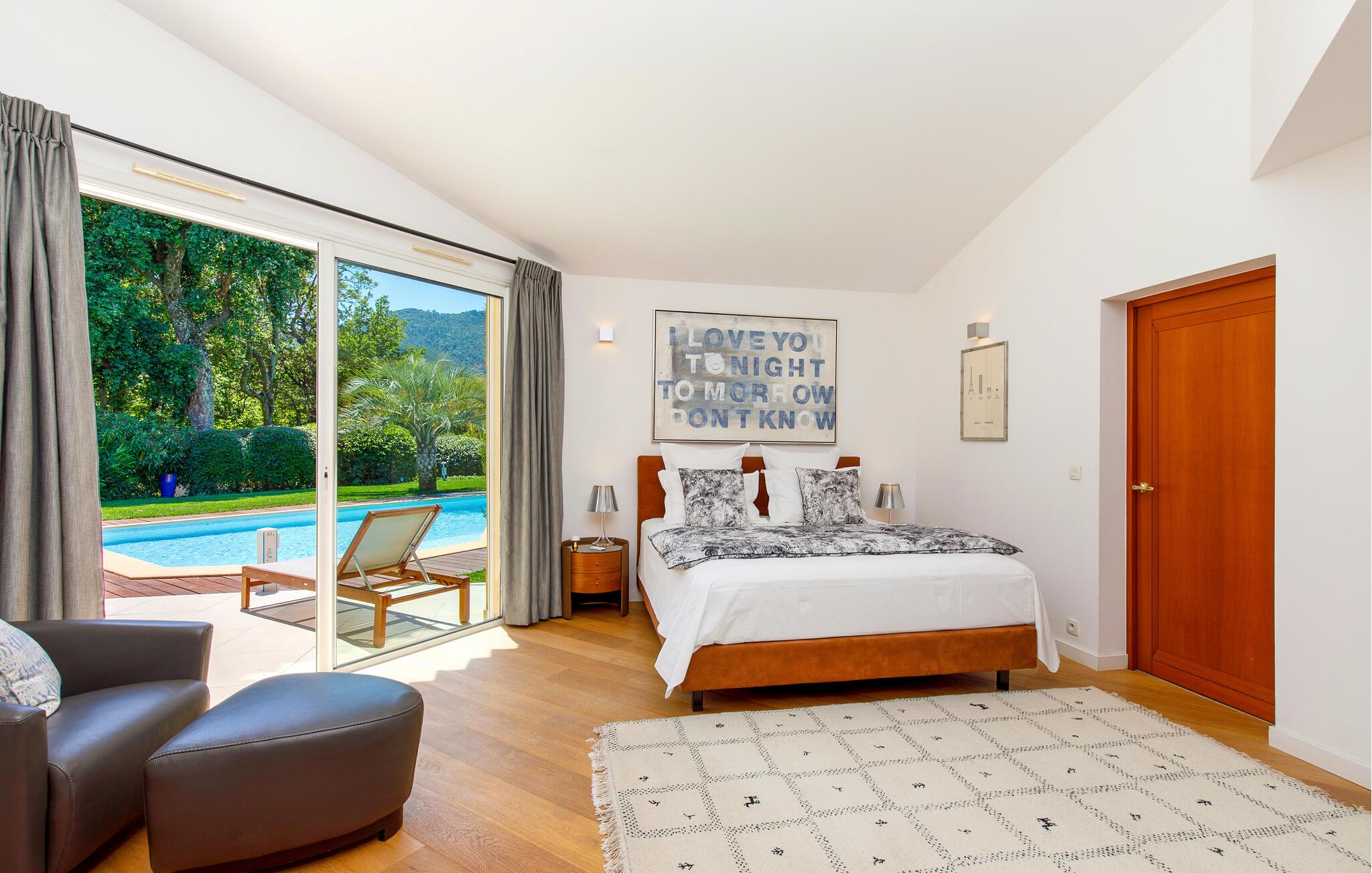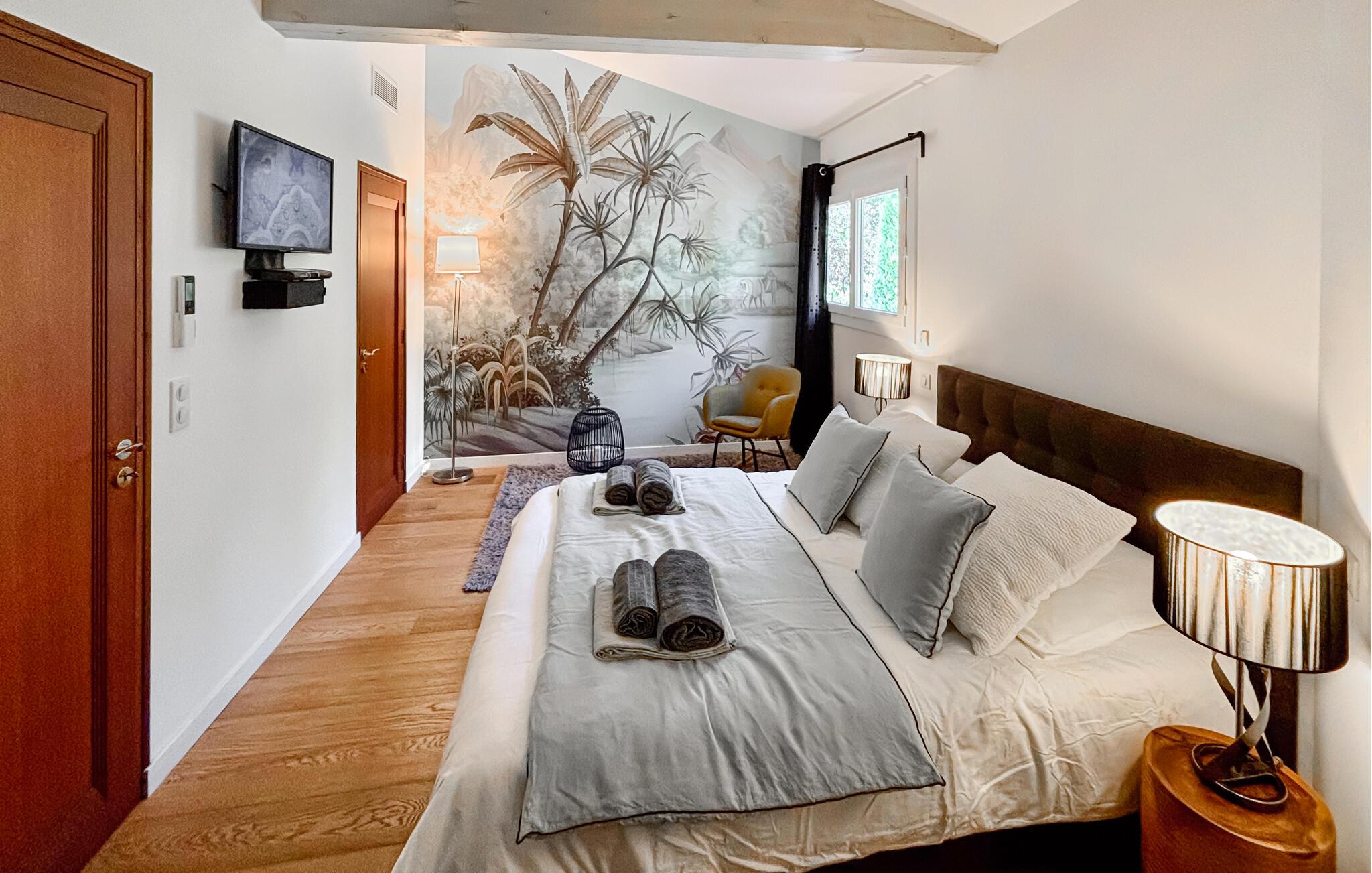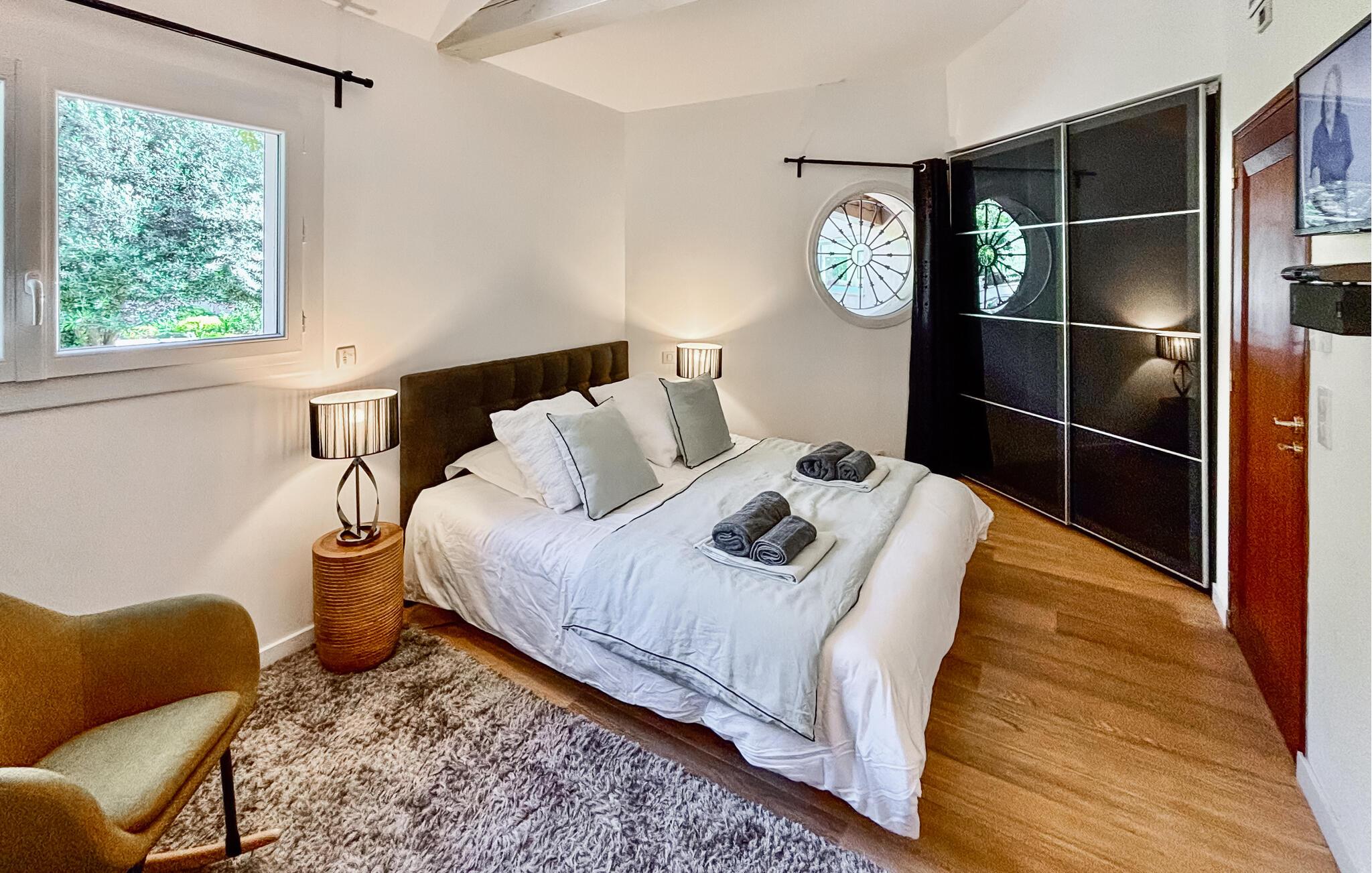 Denne store og eksklusivt udstyrede ejendom ligger omgivet af en smuk park og giver jer fuldt privatliv midt i fortryllende omgivelser. Slap af i den stilfulde opholdsstue, hvor store vinduespartier giver en vidunderlig udsigt til det grønne. Træn i fitnessrummet, slap af i saunaen, og nyd fælles madlavningsaftener og lækre måltider.
