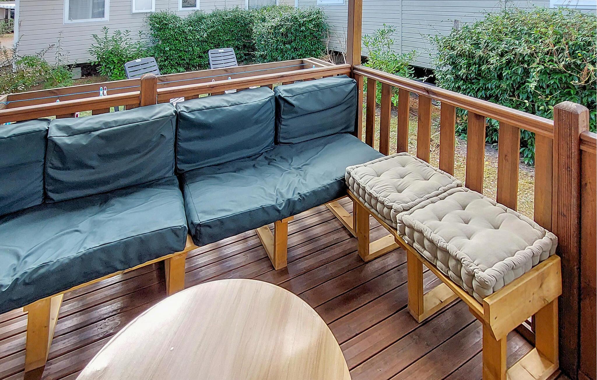 Inde i dette mobilehome finder I et moderne, gennemtænkt indretningskoncept med lyse farver og varme træelementer. I opholdsstuen kan I slappe af i det komfortable siddeområde, læse eller lytte til en interessant podcast. Køkkenet er kompakt og praktisk udstyret – et godt sted til nem feriemadlavning.