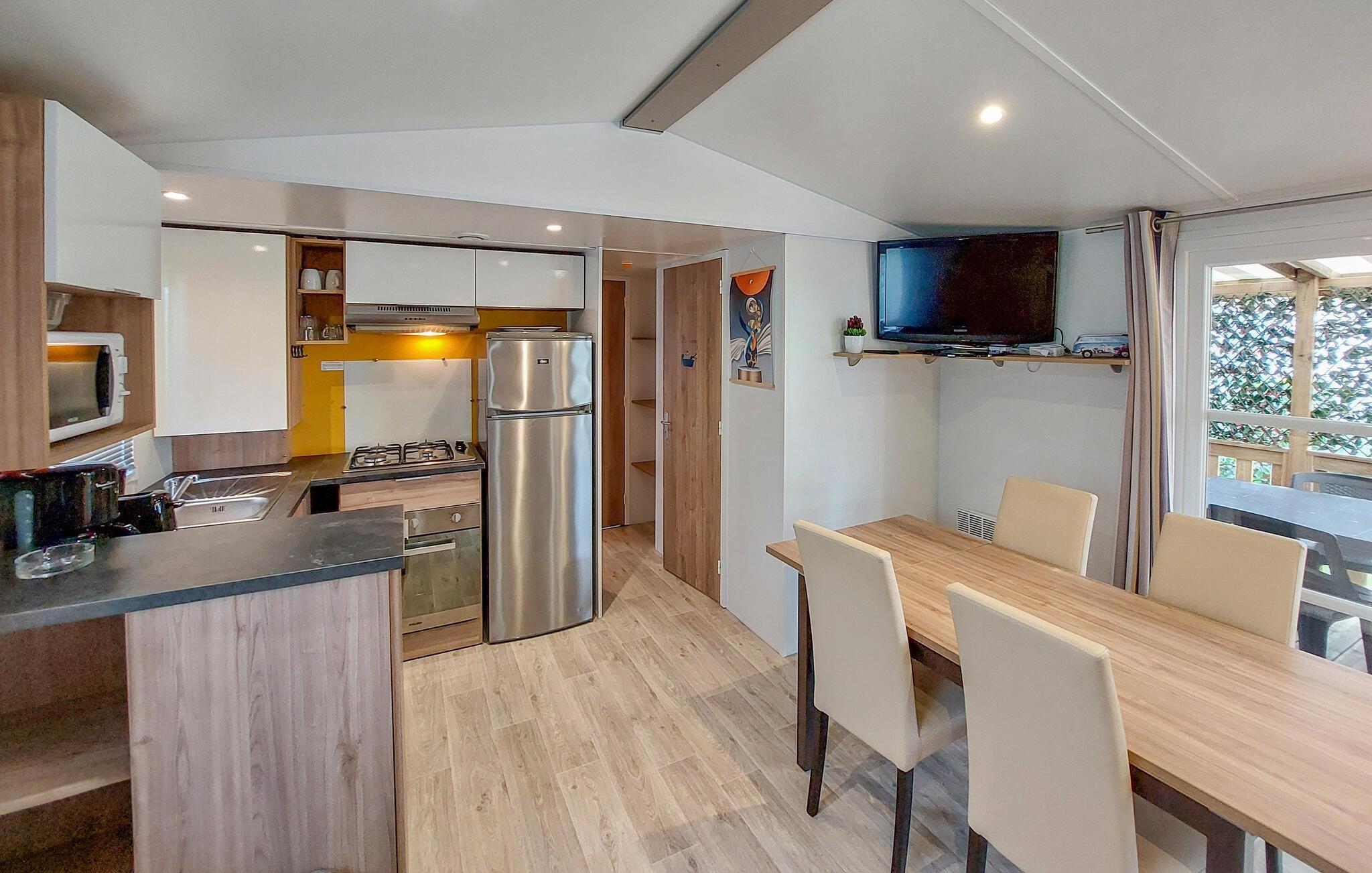 Mobilhomet byder jer velkommen med sin hyggelige indretning og imødekommende atmosfære. Det praktiske interiør er veludstyret og har alt, hvad I skal bruge for et behageligt ophold. I kan føle jer godt tilpas her med familien og nyde tiden sammen.