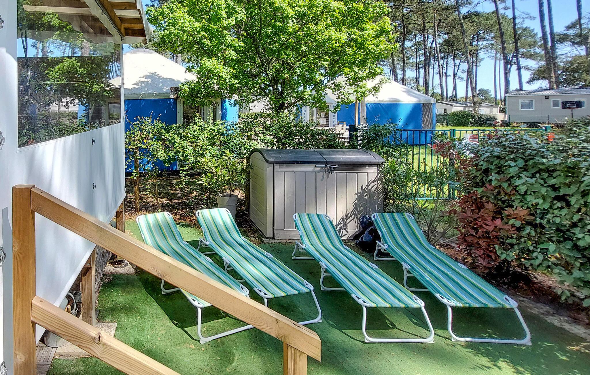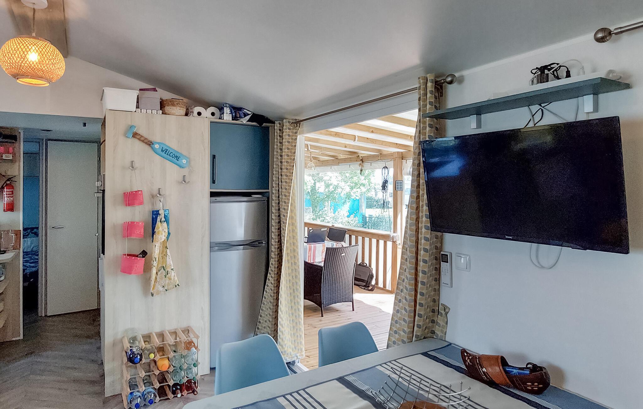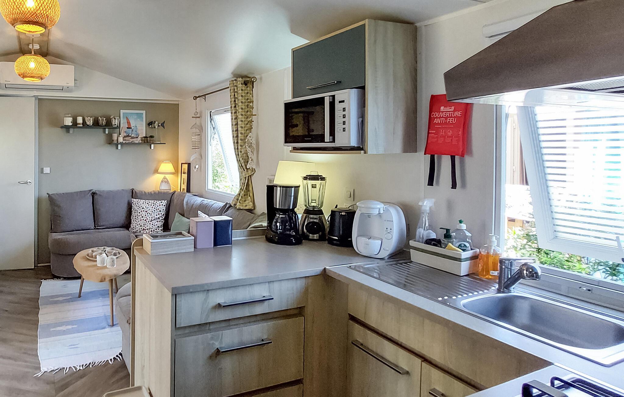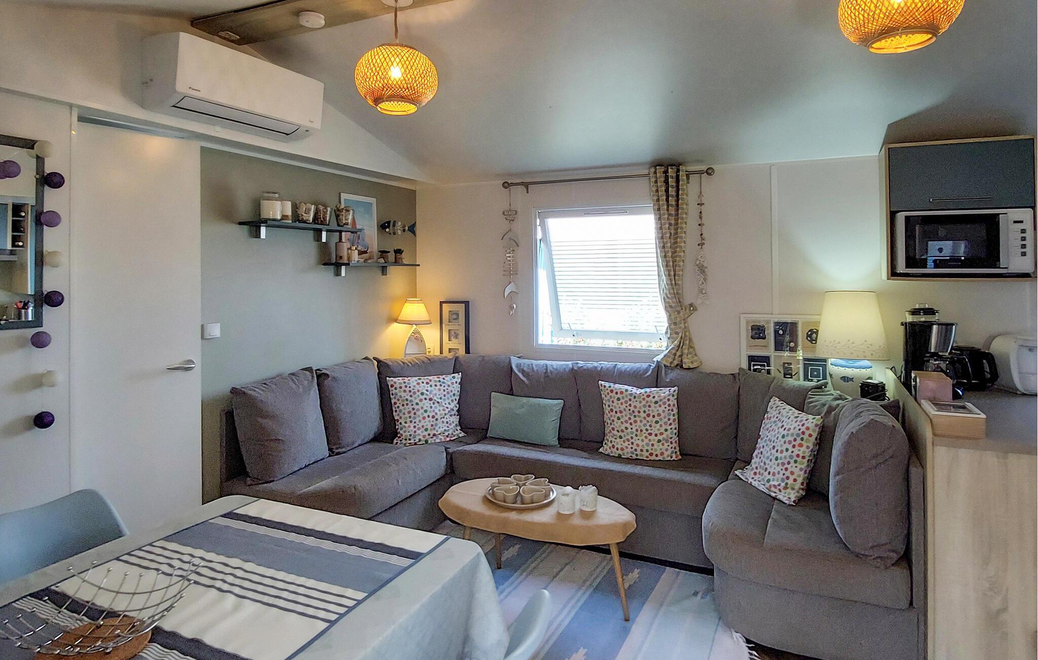Oplev en afslappende ferie i et hyggeligt mobilhome med en naturlig atmosfære og fritidsaktiviteter.