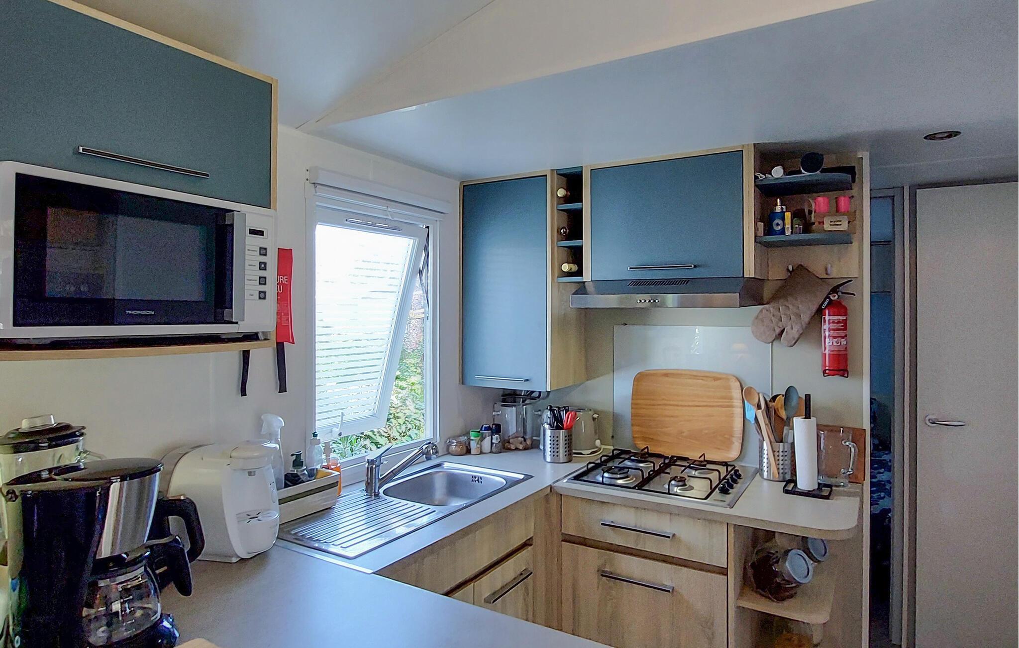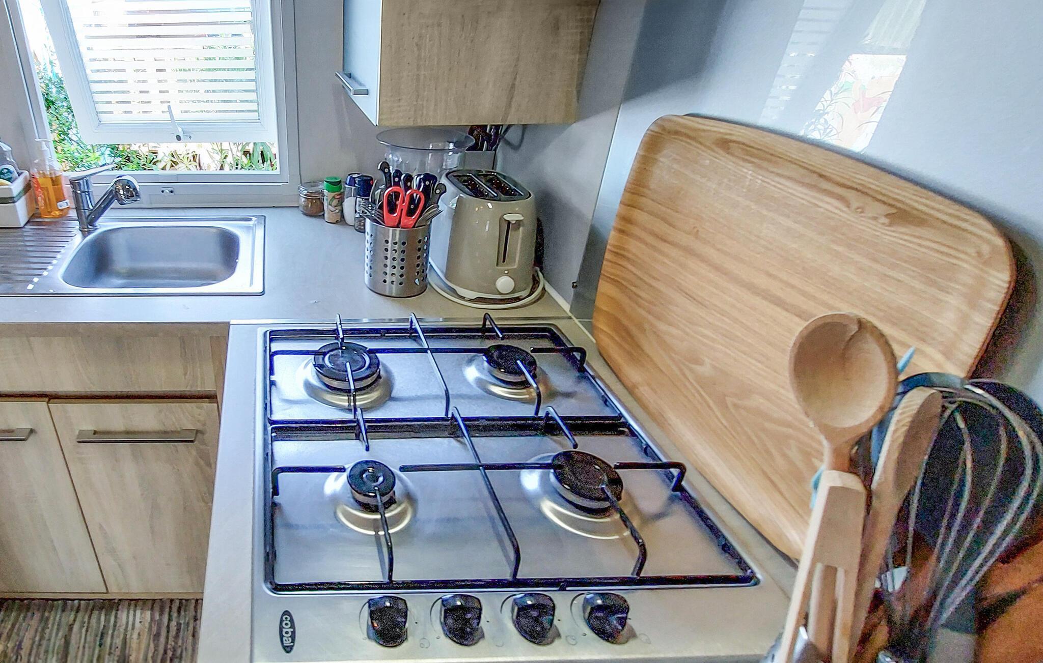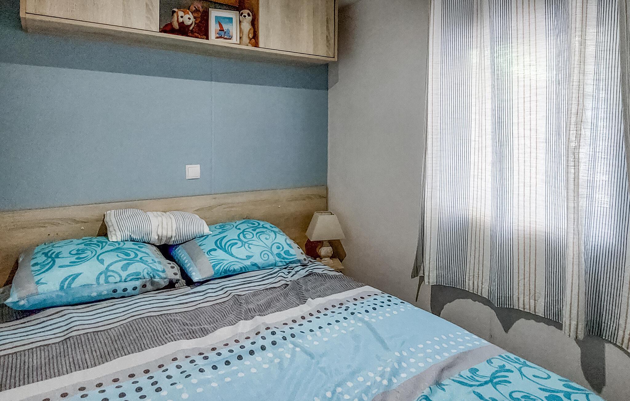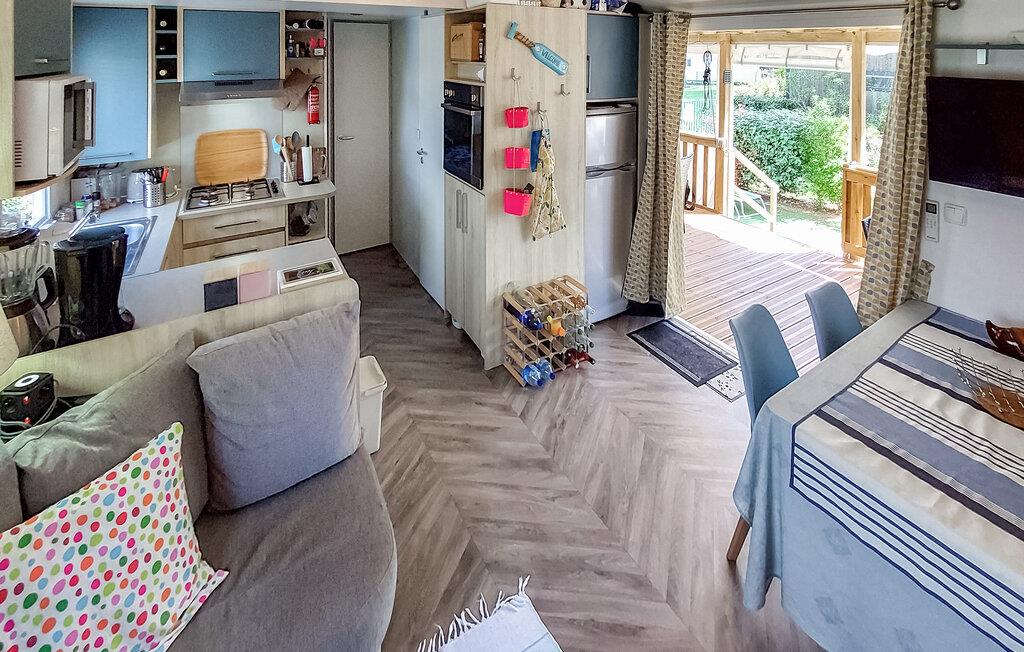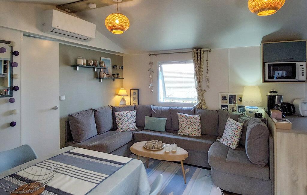 Tilbring jeres ferie i et veludstyret mobilhome på en indbydende campingplads. Nyd de praktiske møbler og de mange muligheder for aktive eller afslappende aktiviteter lige på stedet. Slap af i den store sofa eller saml måltiderne i det åbne opholds- og spiseområde. Køkkenet er kompakt og funktionelt, ideelt til at tilberede enkle måltider.