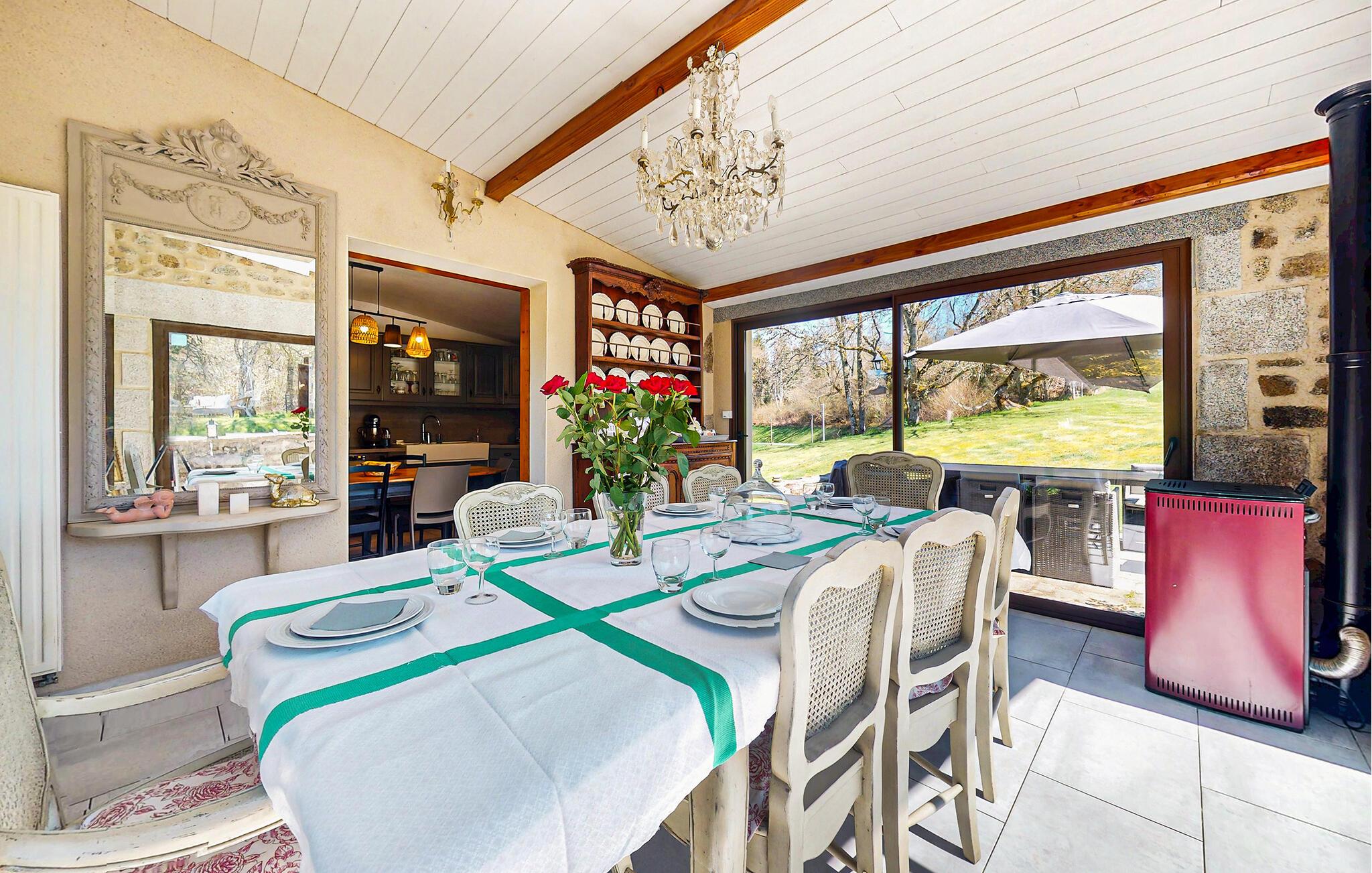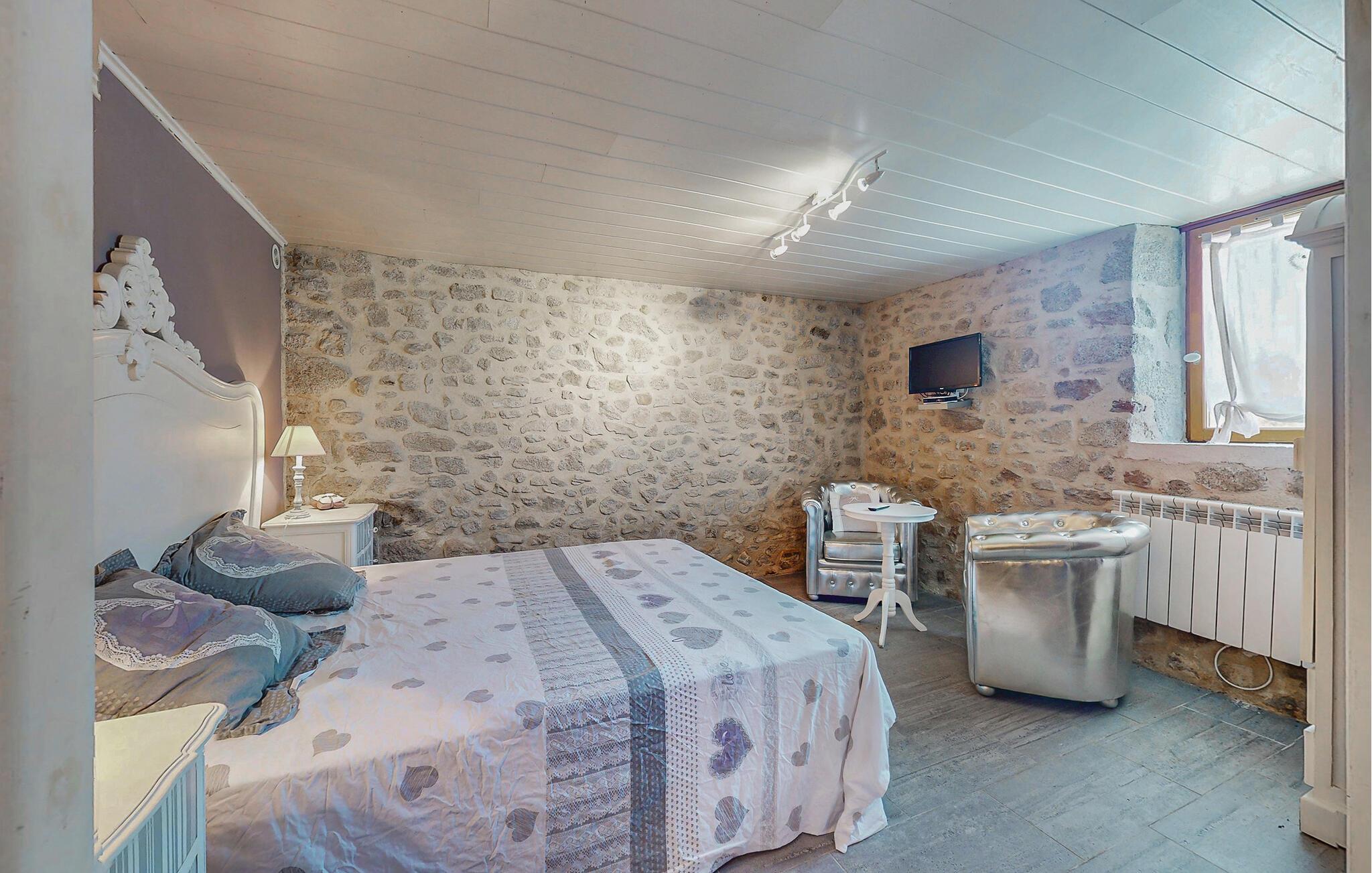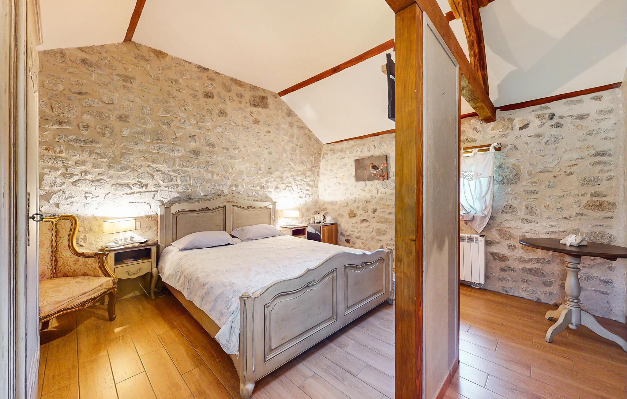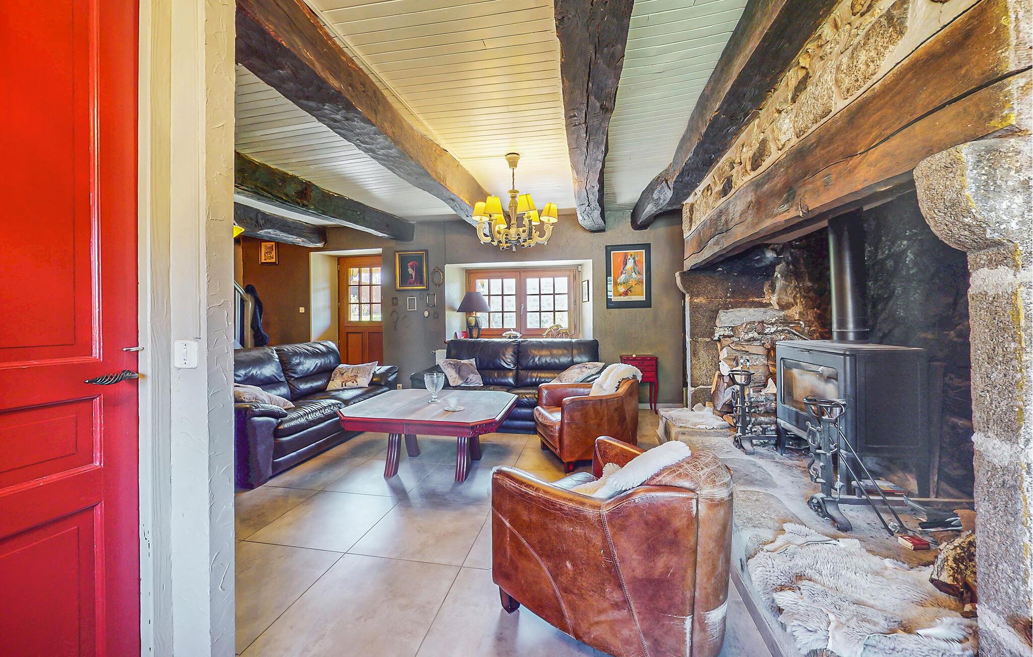 Dette traditionelle stenhus tilbyder ren afslapning omgivet af naturen. Nyd hyggelige timer i opholdsstuen med synlige bjælker, naturstensvægge og komfortable sofaer. Udnyt den stilfulde spisestue med udsigt over de grønne områder eller tilbring hyggelige aftener foran pejsen. Tilbered jeres måltider i det rummelige køkken, og nyd morgenmaden her om morgenen.
